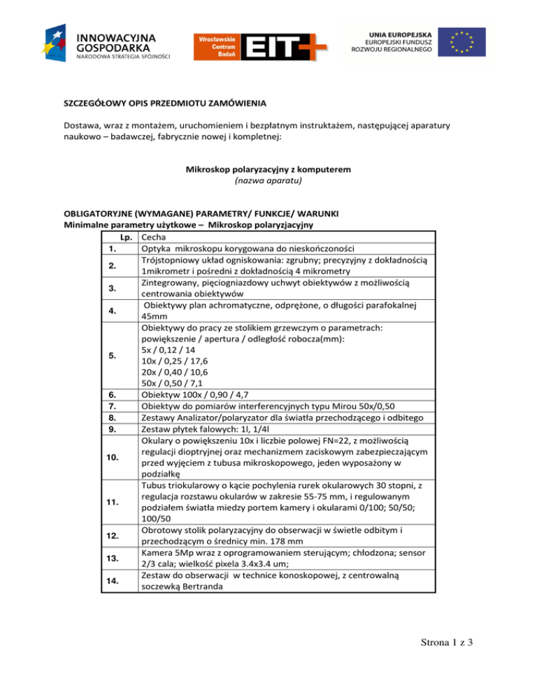 SZCZEGÓŁOWY OPIS PRZEDMIOTU ZAMÓWIENIA Dostawa, wraz z montażem, uruchomieniem i bezpłatnym instruktażem, następującej aparatury naukowo – badawczej, fabrycznie nowej i kompletnej: Mikroskop polaryzacyjny z komputerem (nazwa aparatu) OBLIGATORYJNE (WYMAGANE) PARAMETRY/ FUNKCJE/ WARUNKI Minimalne parametry użytkowe – Mikroskop polaryzjacyjny Lp. Cecha 1. Optyka mikroskopu korygowana do nieskończoności Trójstopniowy układ ogniskowania: zgrubny; precyzyjny z dokładnością 2. 1mikrometr i pośredni z dokładnością 4 mikrometry Zintegrowany, pięciogniazdowy uchwyt obiektywów z możliwością 3. centrowania obiektywów Obiektywy plan achromatyczne, odprężone, o długości parafokalnej 4. 45mm Obiektywy do pracy ze stolikiem grzewczym o parametrach: powiększenie / apertura / odległość robocza(mm): 5x / 0,12 / 14 5. 10x / 0,25 / 17,6 20x / 0,40 / 10,6 50x / 0,50 / 7,1 6. Obiektyw 100x / 0,90 / 4,7 7. Obiektyw do pomiarów interferencyjnych typu Mirou 50x/0,50 8. Zestawy Analizator/polaryzator dla światła przechodzącego i odbitego 9. Zestaw płytek falowych: 1l, 1/4l Okulary o powiększeniu 10x i liczbie polowej FN=22, z możliwością regulacji dioptryjnej oraz mechanizmem zaciskowym zabezpieczającym 10. przed wyjęciem z tubusa mikroskopowego, jeden wyposażony w podziałkę Tubus triokularowy o kącie pochylenia rurek okularowych 30 stopni, z regulacja rozstawu okularów w zakresie 55-75 mm, i regulowanym 11. podziałem światła miedzy portem kamery i okularami 0/100; 50/50; 100/50 Obrotowy stolik polaryzacyjny do obserwacji w świetle odbitym i 12. przechodzącym o średnicy min. 178 mm Kamera 5Mp wraz z oprogramowaniem sterującym; chłodzona; sensor 13. 2/3 cala; wielkość pixela 3.4x3.4 um; Zestaw do obserwacji w technice konoskopowej, z centrowalną 14. soczewką Bertranda Strona 1 z 3 Miniamalne parametry użytkowe – komputer z monitorem Opis parametru / cechy Minimalne parametry wymagane Procesor Dwurdzeniowy procesor lub lepszy z minimum 3 MB pamięci podręcznej z taktowaniem zegara co najmniej 2.59 GHz, lub równoważny w zakresie wydajności, wsparcie dla instrukcji 64bit oraz sprzętowe wsparcie dla AES i VT, sprzętowe wsparcie dla zdalnego zarządzania Pamięć Minimum 8GB (2x4GB) 1600MHz DDR3, obsługa do 16GB DDR3 Karta graficzna Profesjonalna karta graficzna z 1GB GDDR5 własnej pamięci operacyjnej, wsparcie dla grafiki HD na dwóch monitorach, zgodność z DirectX 11. Dopuszczalne jest zastosowanie równoważnej karty graficznej z zakresie wydajności. Karta muzyczna Zintegrowana HD Klawiatura W układzie US QWERTY, wbudowany Touchpad Dysk twardy 500GB SATA 7.2k RPm DVD+/-RW (dopuszczalny napęd zewnętrzny na USB) Napęd optyczny Interfejsy sieciowe Zarządzanie i bezpieczeństwo Bateria Wbudowana karta WiFi 2.4/5 GHz (802.11 a/b/g/n) 2x2 "up to 300Mb" lub lepsza (dopuszczalna jest karta równoważna w zakresie ilości anten, przepustowości, wsparcia dla szyfrowania AES, 802.11i, a także wspierająca sprzętowo zaproponowaną technologie zarządzania over ip) Karta sieciowa Gigabit Ethernet 10/100/1000, wsparcie dla Wake on LAN oraz PXE Możliwość montażu wewnętrznej karty WWAN 3G/HSDPA Wbudowana karta Bluetooth 4.0 Wbudowany układ TPM. Sprzętowe wsparcie zdalnego zarządzania (zgodne z Intel vPro). Dopuszczalne jest zastosowanie równoważnej technologii zdalnego zarządzania w zakresie KVM over IP oraz przekazywania mediów. 6-cio ogniwowa minimalnie 57Wh bateria litowo-jonowa (jeżeli konstrukcja notebooka nie pozwala na zastosowanie baterii o wskazanej pojemności dopuszczalne jest zastosowanie dwóch baterii z możliwością jednoczesnej pracy) Czytnik Kart pamięci SD, lini papilarnych, czytnik kart procesorowych (dopuszczalny zewnętrzny czytnik) Zasilacz Zasilacz sieciowy dedykowany dla zastosowanej baterii/procesora/karty graficznej Maksymalna przekątna 14.1", rozdzielczość minimalna 1600x900, technologia LED, powłoka antyodblaskowa, wbudowana kamera HD Wyświetlacz System operacyjny Microsoft Windows 7 Ultimate 64Bit (wymagana możliwość downgrade do Microsoft Windows XP). (Dopuszczalne jest zastosowanie innego systemu operacyjnego jeżeli producent specjalistycznego oprogramowania jakie zostanie zainstalowane na stacji roboczej nie wspiera wyżej wymienionych systemów. W przypadku zastosowania systemu Red Hat lub SLES/SLED wymagane wsparcie producenta w czasie trwania gwarancji.) Interfejsy Złącze stacji dokującej, RJ45, 2xUSB 3.0, VGA/DP (dopuszczalny adapter VGA) Strona 2 z 3 Stacja dokująca Dedykowany replikator portów z zasilaczem minimalnie 65W, wymagane porty: DVI-D lub DP (wymagany adapter DP do DVID), RJ45, 4xUSB, możliwość zabezpieczenia stacji linką typu Kensington Monitor do zestawu Monitor o minimalnej przekątnej 24", rozdzielczość minimalna 1920x1080. Statyczny współczynnik kontrastu 1000:1, Czas reakcji maksymalnie 10 ms (szary do szarego). Jasność minimalnie 290 cd/m2. Matryca TFT E-IPS lub IPS, z podświetleniem LED, matowa w układzie 16:9 lub 16:10. Podstawa z regulacją wysokości oraz funkcja obrotu ekranu o 90 stopni. Certyfikaty: TCO 5.2 Wymagane złącza DVI-D lub DisplayPort. W zestawie kabel/adapter DisplayPort-DVI-D oraz przewód kabel zasilający. Trzyletnia gwarancja producenta monitora, czas naprawy do końca następnego dnia roboczego. Głośniki Jeżeli konstrukcja monitora na to pozwala, wymagany jest panel głośników doczepiany pod monitorem. Alternatywnie dopuszczalne jest zastosowanie zewnętrznych głośników stereo na USB. Zewnętrzna klawiatura Standardowa klawiatura USB w układzie QWERTY z wbudowanym czytnikiem kartprocesorowych Laserowa, USB, z przewijaczem oraz z możliwością dostosowania czułości myszy, w zestawie podkładka pod mysz Mysz kablowa Gwarancja Trzyletnia gwarancja producenta, czas naprawy do końca następnego dnia roboczego w miejscu użytkowania komputera. Listwa zasilającofiltrująca Listwa zasilająco-filtrująca typu ACAR z mini