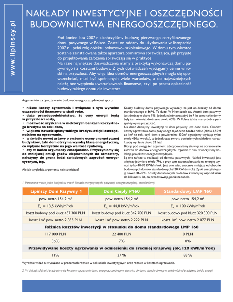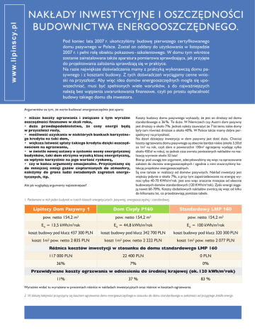 w w w.lipinscy.pl NAKŁADY INWESTYCYJNE I OSZCZĘDNOŚCI BUDOWNICTWA ENERGOOSZCZĘDNEGO. Pod koniec lata 2007 r. ukończyliśmy budowę pierwszego certyfikowanego domu pasywnego w Polsce. Został on oddany do użytkowania w listopadzie 2007 r. i pełni rolę obiektu pokazowo - szkoleniowego. W domu tym wkrótce zostanie zainstalowana także aparatura pomiarowa sprawdzająca, jak przyjęte do projektowania założenia sprawdzają się w praktyce. Na razie największe doświadczenia mamy z praktyką wykonawczą domu pasywnego i z kosztami budowy. Z tych doświadczeń wyciągamy cenne wnioski na przyszłość. Aby więc idea domów energooszczędnych mogła się upowszechniać, musi być spełnionych wiele warunków, a do najważniejszych należą bez wątpienia uwarunkowania finansowe, czyli po prostu opłacalność budowy takiego domu dla inwestora. Argumentów za tym, że warto budować energooszczędnie jest sporo: • niższe koszty ogrzewania i związane z tym wyraźne oszczędności finansowe w skali roku, • duże prawdopodobieństwo, że ceny energii będą w przyszłości rosły, • możliwość uzyskania w niektórych bankach korzystnego kredytu na taki dom, • większa łatwość spłaty takiego kredytu dzięki oszczędnościom na ogrzewaniu, • w świetle nowej ustawy o systemie oceny energetycznej budynków, taki dom otrzyma wysoką klasę energetyczną, co wpłynie korzystnie na jego wartość rynkową, • czy w końcu argumenty emocjonalne. Przyczyniamy się do mniejszej emisji gazów cieplarnianych do atmosfery, należymy do grona ludzi świadomych zagrożeń energetycznych, itp. Ale jak wyglądają argumenty najistotniejsze? Koszty budowy domu pasywnego wykazały, że jest on droższy od domu standardowego o 36 %. To dużo. W Niemczech czy Austrii dom pasywny jest droższy o około 7%. Jednak należy zauważyć że 7 lat temu takie domy były tam również droższe o około 40%. W Polsce także mamy dobre perspektywy na przyszłość. Na dzień dzisiejszy inwestycja w dom pasywny jest dość duża. Chociaż koszty ogrzewania domu pasywnego są obecnie bardzo niskie (około 3,50 zł za 1m2 na rok, czyli dom o powierzchni 130m2 ogrzejemy wydając tylko około 450 zł w roku), to jednak czas zwrotu poniesionych nakładów na realizację wyniesie około 32 lata! Biorąc pod uwagę ten argument, zdecydowaliśmy się więc na opracowanie założeń do domów energooszczędnych i zgodnie z nimi stworzyliśmy kolekcję projektów energooszczędnych. Są one tańsze w realizacji od domów pasywnych. Nakład inwestycji jest większy jedynie o około 7%, a przy tym zapotrzebowanie na energię wynosi tylko 40-70 KWh/m2rok. Jest ono więc znacznie mniejsze od obecnie budowanych domów standardowych (120 KWh/m2rok). Zyski energii sięgają nawet 60-70%. Koszty dodatkowych nakładów zwrócą się więc od kilku do kilkunastu lat, co przedstawiają poniższe tabele. 1. Porównano w nich jeden budynek w trzech klasach energetycznych: pasywnej, energooszczędnej i standardowej. Lipińscy Dom Pasywny 1 Dom Ciepły P160 Standardowy LMP 160 pow. netto 154,2 m2 pow. netto 154,2 m2 pow. netto 154,2 m2 EA = 13,5 kWh/m2rok EA = 44,8 kWh/m2rok EA = 100 kWh/m2rok koszt budowy pod klucz 437 300 PLN koszt budowy pod klucz 342 700 PLN koszt budowy pod klucz 320 300 PLN koszt 1m2 pow. netto 2 835 PLN koszt 1m2 pow. netto 2 222 PLN koszt 1m2 pow. netto 2 077 PLN Różnica kosztów inwestycji w stosunku do domu standardowego LMP 160 117 000 PLN 22 400 PLN 0 PLN 36% 7% 0% Przewidywane koszty ogrzewania w odniesieniu do średniej krajowej (ok. 120 kWh/m2rok) 11% 37 % 83 % Wyraźnie widać tu wyrażone w procentach różnice w nakładach inwestycyjnych oraz różnice w kosztach ogrzewania. 2. W dalszej kolejności przyjrzyjmy się kosztom ogrzewania domu energooszczędnego w stosunku do domu standardowego w zależności od przyjętego źródła energii. Standardowy LMP 160 pow. netto 154,2 m pow. netto 154,2 m2 2 EA = 44,7 kWh/m2rok EA = 100 kWh/m2rok koszt budowy pod klucz 342 700 PLN koszt budowy pod klucz 320 300 PLN koszt 1m pow. netto 2 222 PLN koszt 1m2 pow. netto 2 077 PLN 2 w w w.lipinscy.pl Dom Ciepły P160 Różnica kosztów inwestycji ok. 22 400 PLN Przewidywane koszty ogrzewania w odniesieniu do średniej krajowej (ok. 120 kWh/m2rok) 37 % 83 % Koszty ogrzewania energią elektryczną 2 - taryfową wyrażone w PLN (wg kalkulatora taryfowego Energii Pro) 2 313 5 133 Różnica kosztów 2 820 PLN Przwewidywany czas zwrotu inwestycji 8 lat Koszty ogrzewania gazem ziemnym wysokometanowym w PLN (wg kalkulatora Dolnośląskiej Spółki Gazownictwa) 1 213 2 573 Różnica kosztów 1 360 PLN Przwewidywany czas zwrotu inwestycji 16 lat Koszty ogrzewania gazem płynnym w PLN (wg kalkulatora Dolnośląskiej Spółki Gazownictwa) 2 262 5 061 Różnica kosztów 2 799 PLN Przwewidywany czas zwrotu inwestycji 8 lat Koszty ogrzewania olejem opałowym w PLN (wg kalkulatora Dolnośląskiej Spółki Gazownictwa) 1 834 4 104 Różnica kosztów 2 270 PLN Przwewidywany czas zwrotu inwestycji 10 lat Analiza ta wykazała, że nawet ogrzewając dom najtańszym gazem ziemnym dodatkowe nakłady zwrócą się po 15 latach, co można uznać jeszcze za okres atrakcyjny. Nie dość, że będziemy za ogrzewanie płacić znacznie mniej, to nakłady zwrócą się stosunkowo szybko. Biorąc jeszcze pod uwagę fakt, że ceny energii będą bez wątpienia rosły, a czego powyższa analiza nie zakłada, w rezultacie oszczędności będą jeszcze większe i czas zwrotu inwestycji skróci się jeszcze bardziej. 3. Ostatnia tabela przedstawia pozycje, które powodują wzrost kosztów inwestycji w domu pasywnym i energooszczędnym w odniesieniu do budynku standardowego. Wynika z niej, że dodatkowe koszty generuje: izolacja termiczna, stolarka okienna i drzwiowa, wentylacja mechaniczna z rekuperacją, sposób ogrzewania budynku, kolektory słoneczne, oraz nakłady związane z dodatkowymi pracami, a w domu pasywnym ponadto konieczność