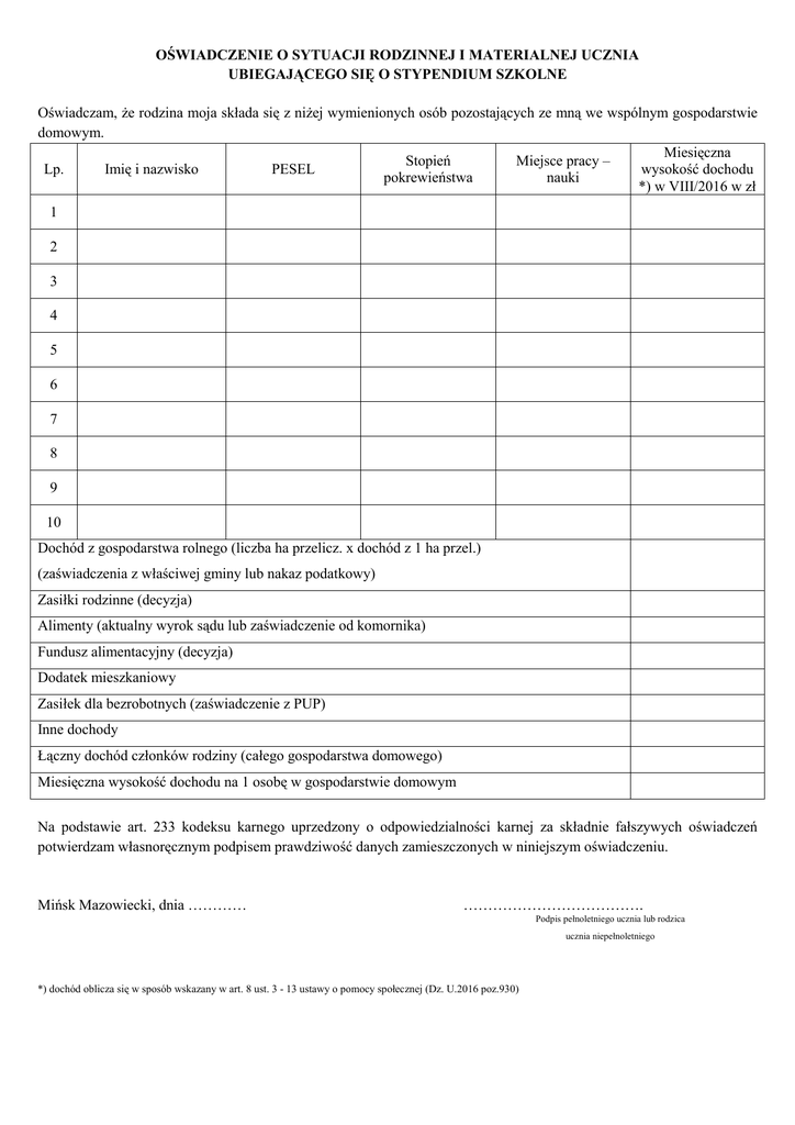 OŚWIADCZENIE O SYTUACJI RODZINNEJ I MATERIALNEJ UCZNIA UBIEGAJĄCEGO SIĘ O STYPENDIUM SZKOLNE Oświadczam, że rodzina moja składa się z niżej wymienionych osób pozostających ze mną we wspólnym gospodarstwie domowym. Miesięczna Stopień Miejsce pracy – Lp. Imię i nazwisko PESEL wysokość dochodu pokrewieństwa nauki *) w VIII/2016 w zł 1 2 3 4 5 6 7 8 9 10 Dochód z gospodarstwa rolnego (liczba ha przelicz. x dochód z 1 ha przel.) (zaświadczenia z właściwej gminy lub nakaz podatkowy) Zasiłki rodzinne (decyzja) Alimenty (aktualny wyrok sądu lub zaświadczenie od komornika) Fundusz alimentacyjny (decyzja) Dodatek mieszkaniowy Zasiłek dla bezrobotnych (zaświadczenie z PUP) Inne dochody Łączny dochód członków rodziny (całego gospodarstwa domowego) Miesięczna wysokość dochodu na 1 osobę w gospodarstwie domowym Na podstawie art. 233 kodeksu karnego uprzedzony o odpowiedzialności karnej za składnie fałszywych oświadczeń potwierdzam własnoręcznym podpisem prawdziwość danych zamieszczonych w niniejszym oświadczeniu. Mińsk Mazowiecki, dnia ………… ………………………………. Podpis pełnoletniego ucznia lub rodzica ucznia niepełnoletniego *) dochód oblicza się w sposób wskazany w art. 8 ust. 3 - 13 ustawy o pomocy społecznej (Dz. U.2016 poz.930) OŚWIADCZENIE Ja, niżej podpisany(a) …………………………………………………………………………………… zamieszkały(a) ………………………………………………………………………………………….. legitymujący(a) się dowodem osobistym nr …………………………………………………………… oświadczam, że zostałem(am) poinformowany(a) o treści art. 8 ust. 11 i 12 ustawy z dnia 12 marca 2004r. o pomocy społecznej (tekst jednolity: Dz. U. 2016 poz. 930. ): Art.8 ust. 11 w przypadku uzyskania w ciągu 12 miesięcy poprzedzających miesiąc złożenia wniosku lub w okresie pobierania świadczenia z pomocy społecznej dochodu jednorazowego przekraczającego pięciokrotnie kwoty: 1) kryterium dochodowego osoby samotnie gospodarującej (tj. 542,00 zł.), w przypadku osoby samotnie gospodarującej, 2) kryterium dochodowego rodziny (tj. 456,00 zł. X liczba osób w rodzinie), w przypadku osoby w rodzinie, - kwotę tego dochodu rozlicza się w równych częściach na 12 kolejnych miesięcy, poczynając od miesiąca, w których dochód został wypłacony. Art. 8 ust. 12 w przypadku uzyskania jednorazowego dochodu należnego za dany okres, kwotę tego dochodu uwzględnia się w dochodzie osoby lub rodziny przez okres, za który uzyskano ten dochód. Pouczony(a) o odpowiedzialności karnej przewidzianej w art. 233 par. 1 i 2 ustawy z dnia 6 czerwca 1997r. Kodeks karny, zgodnie z którym „ kto składając zeznanie mające służyć za dowód w postępowaniu sądowym lub innym postępowaniu przeprowadzonym na podstawie ustawy zeznaje nieprawdę lub zataja prawdę, podlega karze pozbawienia wolności do lat 3”. Oświadczam, że w okresie poprzednich 12 miesięcy, tj. od dnia : ………………………………….. - nie uzyskałem(am) dochodu jednorazowego przekraczającego kwotę pięciokrotności kryterium dochodowego ustalonego dla mojego ….-osobowego gospodarstwa domowego na kwotę ……….. - uzyskałem(am)w dniu ……………… jednorazowy dochód w wysokości ………………………… słownie …………………………………………………………………………………………………... z tytułu * - odprawy pieniężnej, gratyfikacji, odszkodowania od pracodawcy, itp., - sprzedaży lokalu mieszkalnego, użytkowego, - spadku, darowizny, - odszkodowań, - inne …………………………………………………………………………………………………… * właściwe podkreślić Zgodność powyższego oświadczenia potwierdzam własnoręcznym podpisem. Mińsk Mazowiecki, dnia ………………… ………………………………………………………… (podpis osoby składającej oświadczenie) Oświadczenie zostało odebrane po uprzednim odczytaniu przez: …………………………………………………………………………… (pieczątka i podpis pracownika odbierającego oświadczenie) Załącznik Nr 1 do Uchwały NrVII/55/07 Rady Miasta Mińsk Mazowiecki z dnia 23 kwietnia 2007 roku WNIOSEK O PRZYZNANIE STYPENDIUM SZKOLNEGO 1.Imię i nazwisko osoby ubiegającej się o przyznanie stypendium szkolnego ( dotyczy rodzica dziecka /pełnoletniego ucznia)* PESEL: Tel.: 2. Dane osobowe ucznia Nazwisko Imiona Nazwisko i imię ojca Nazwisko i imię matki PESEL ucznia Data urodzenia 2. Informacja o szkole Nazwa szkoły Typ szkoły Ulica Miejscowość Kod pocztowy Województwo W roku szkolnym …………………. jest uczniem klasy 3. Adres zamieszkania Mińsk Mazowiecki ul. ………………………………………………. 4. Uczeń spełnia następujące kryteria (należy zaznaczyć spełniane kryteria stawiając znak X): miesięczna wysokość dochodu na osobę w gospodarstwie domowym nie przekracza kwoty o której mowa w art. 8 ust. 1 pkt 2 ustawy z dnia 12 marca 2004 roku o pomocy społecznej (Dz. U. 2016 poz. 930) oświadczenie o sytuacji rodzinnej i materialnej ucznia stanowi załącznik do wniosku Warunki i okoliczności rodzinne: bezrobocie niepełnosprawność ciężka lub długotrwała choroba wielodzietność brak umiejętności wypełniania funkcji opiekuńczo - wychowawczych alkoholizm lub narkomania rodzina jest niepełna uczeń pobiera pomoc socjalną z innego źródła (jeżeli tak to z jakiego tytułu i w jakiej wysokości) *niepotrzebne skreślić 5. Wniosek dotyczy następującej formy pomocy: (pomoc może być udzielona w jednej lub kilku formach – zaznaczyć rodzaj pomocy)) 1. Całkowite lub częściowe pokrycie kosztów udziału w zajęciach edukacyjnych wykraczających poza zajęcia realizowane w szkole w ramach 