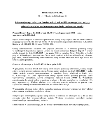 Straż Miejska w Łodzi, 90 – 119 Łódź, ul. Kilińskiego 81 informuje o sprzedaży w drodze aukcji zakwalifikowanego jako zużyty składnik majątku ruchomego samochodu osobowego marki: Peugeot Expert Tepee 1.6 HDI nr rej. EL 704FH, rok produkcji 2008 – cena wywoławcza 18.100,00 zł. Pojazd można obejrzeć w obecności pracownika Straży Miejskiej w Łodzi na terenie obiektu znajdującego się w Łodzi przy ul. Rydla 19, po uprzednim uzgodnieniu terminu z P. Rafałem Kanią, nr tel. (42) 250 22 40, kom. 782 985 076. Osoby zainteresowane zakupem ww. pojazdu proszone są o złożenie pisemnej oferty w zamkniętych kopertach z opisem ,,Oferta na zakup samochodu Peugeot Expert ". Oferty należy składać do dnia 22.05.2013 r. do godz. 9:00 w siedzibie Straży Miejskiej w Łodzi przy ul. Kilińskiego 81 (sekretariat). Oferta musi zawierać imię i nazwisko (firmę) oferenta, jego adres, telefon kontaktowy oraz oferowaną cenę zakupu, która nie może być niższa niż ustalona cena sprzedaży. Otwarcie ofert nastąpi w dniu 22.05.2013 r. o godz. 9:30. W przypadku złożenia dwóch lub więcej ofert zakupu, pomiędzy oferentami, którzy złożyli oferty, zostanie przeprowadzona aukcja. Termin aukcji ustala się na dzień 22.05.2013 r. godz. 10:00. Aukcja zostanie przeprowadzona w siedzibie Straży Miejskiej w Łodzi przy ul. Kilińskiego 81. Cena wywoławcza aukcji będzie równa podanej powyżej cenie wywoławczej samochodu. Kwota postąpienia wynosić będzie 200,00 zł. Warunkiem przystąpienia do aukcji będzie wniesienie wadium w formie pieniężnej w wysokości 10% ceny wywoławczej. Wadium złożone przez nabywcę zostanie zaliczone na poczet ceny, a pozostałe zostaną zwrócone niezwłocznie po zakończeniu aukcji. W przypadku złożenia jednej oferty samochód zostanie sprzedany oferentowi, który złożył ofertę za cenę wynikającą ze złożonej oferty. Nabywca jest zobowiązany zapłacić cenę nabycia w terminie nie dłuższym niż 2 dni od dnia otwarcia ofert lub przeprowadzenia aukcji. Wydanie przedmiotu sprzedaży nastąpi niezwłocznie po zapłaceniu ceny nabycia. Straż Miejska w Łodzi zastrzega, iż nie bierze odpowiedzialności za wady ukryte pojazdu.
