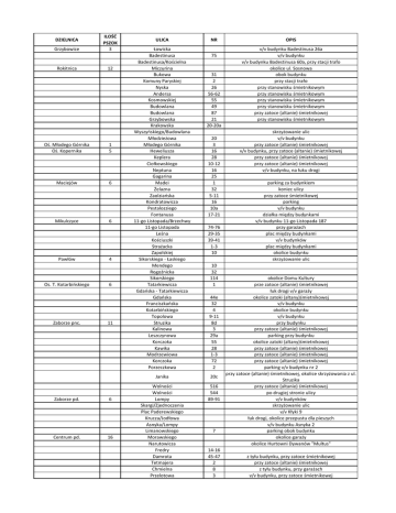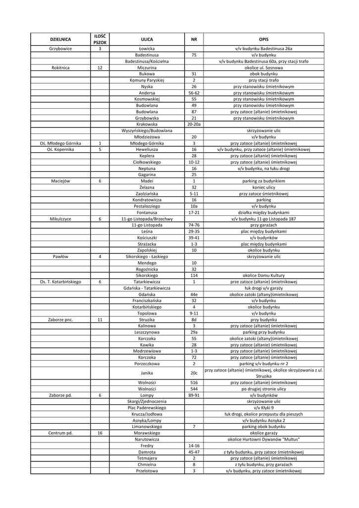 DZIELNICA Grzybowice Rokitnica ILOŚĆ PSZOK 3 12 Oś. Młodego Górnika Oś. Kopernika 1 5 Maciejów 6 Mikulczyce 6 Pawłów Os. T. Kotarbioskiego Zaborze pnc. 4 6 11 Zaborze pd. 6 Centrum pd. 16 ULICA Łowicka Badestinusa Badestinusa/Kościelna Miczurina Bukowa Komuny Paryskiej Nyska Andersa Kosmowskiej Budowlana Budowlana Grzybowska Krakowska Wyszyoskiego/Budowlana Młodzieżowa Młodego Górnika Heweliusza Keplera Ciołkowskiego Neptuna Gagarina Madei Żelazna Zaolziaoska Kondratowicza Pestalozziego Fontanusa 11-go Listopada/Brzechwy 11-go Listopada Leśna Kościuszki Strażacka Zapolskiej Sikorskiego - Łaskiego Mendego Rogoźnicka Sikorskiego Tatarkiewicza Gdaoska - Tatarkiewicza Gdaoska Franciszkaoska Kotarbioskiego Topolowa Struzika Kalinowa Leszczynowa Korczoka Kawika Modrzewiowa Korczoka Porzeczkowa NR 75 31 2 26 56-62 55 49 87 21 20-20a 20 3 16 28 10-12 16 25 1 32 5-11 16 10a 17-21 74-76 29-35 39-41 1-3 10 10 32 114 1 44e 32 4 9-11 8d 3 29a 55 28 1-3 72 2 Janika 20c Wolności Wolności Lompy Skargi/Zjednoczenia Plac Paderewskiego Krucza/Jodłowa Asnyka/Lompy Limanowskiego Morawskiego Narutowicza Fredry Damrota Tetmajera Chmielna Przelotowa 516 544 89-91 7 14-16 45-47 2 8 3 OPIS v/v budynku Badestinusa 26a v/v budynku v/v budynku Badestinusa 60a, przy stacji trafo okolice ul. Sosnowa obok budynku przy stacji trafo przy stanowisku śmietnikowym przy stanowisku śmietnikowym przy stanowisku śmietnikowym przy stanowisku śmietnikowym przy zatoce (altanie) śmietnikowej przy stanowisku śmietnikowym skrzyżowanie ulic v/v budynku przy zatoce (altanie) śmietnikowej v/v budynku, przy zatoce (altanie) śmietnikowej przy zatoce (altanie) śmietnikowej przy zatoce (altanie) śmietnikowej v/v budynku, na łuku drogi parking za budynkiem koniec ulicy przy zatoce śmietnikowej parking v/v budynku działka między budynkami v/v budynku 11-go Listopada 187 przy garażach plac między budynkami v/v budynków plac między budynkami okolice budynku skrzyżowanie ulic okolice Domu Kultury prze zatoce (altanie) śmietnikowej łuk drogi v/v garaży okolice zatoki (altany)śmietnikowej v/v budynku okolice budynku v/v budynku przy budynku przy zatoce (altanie) śmietnikowej parking przy budynku okolice zatoki (altany)śmietnikowej przy zatoce (altanie) śmietnikowej przy zatoce (altanie) śmietnikowej przy zatoce (altanie) śmietnikowej parking v/v budynku nr 2 przy zatoce (altanie) śmietnikowej, okolice skrzyżowania z ul. Struzika przy zatoce (altanie) śmietnikowej po drugiej stronie ulicy v/v budynków skrzyżowanie ulic v/v Kłyki 9 łuk drogi, okolice przepustu dla pieszych v/v budynku Asnyka 2 parking obok budynku okolice garaży okolice Hurtowni Dywanów "Multus" z tyłu budynku, przy zatoce śmietnikowej przy zatoce (altanie) śmietnikowej z tyłu budynku, przy garażach v/v budynku, przy zatoce śmietnikowej Guido 10 Kooczyce 2 Makoszowy 5 Biskupice 4 Helenka 9 Centrum pnc. 11 Zandka 3 Σ 120 Nałkowskiej Matejki Szenwalda Tuwima Reymonta Brzóski/Chodkiewicza Zamoyskiego Buchenwaldczyków Piłsudskiego/Webera Wolskiego 3-ego Maja Długa Rogera Sportowa Podleśna Dzierżona Dzierżona Jarzębia Cisowa Miła Sitki Jaśminowa Legnicka/Kruszyny Legnicka/Sejmowa/Kordeckiego Oświęcimska Okrężna Bytomska-Chrobrego Bytomska Tarnogórska Kossaka Wybickiego Kruczkowskiego Prusa Jordana Joliot-Curie Wawrzyoskiej Łapkowskiego Zamenhoffa Kruczkowskiego Słowackiego/Sokolska Gliwicka Kowalska Kowalska/Barbary Nocznickiego Jana Galla Wolności Nad Kanałem Nad Kanałem/Trocera Nawrata Dworska/Gdaoska Cmentarna Krakusa Booczyka 11 21 9g 8 9b-11b 9 15 10 118 49a 2-4 7-8 33c 11 6 8c 17 22 29 119 2a 53 24 30-32 48 65 5 7c 18-22 13-15 48-50 12 16 34-40 140-142 22 7 1a-3a 10-12 16 przy zatoce (altanie) śmietnikowej v/v budynku w zatoce śmietnikowej przy garażach przy zatoce (altanie) śmietnikowej z tyłu budynku, przy garażach przy zatoce (altanie) śmietnikowej przy stanowisku śmietnikowym przy ścianie budynku przy ścianie budynku okolice Gimnazjum nr 39 okolice Gimnazjum nr 15/Technikum nr 3 za sklepem, przy zatoce śmietnikowej przy sklepie Społem przy zatoce (altanie) śmietnikowej między budynkami v/v budynku, przy wejściu na teren Walki Makoszowy v/v budynku, okolice stacji trafo przy zatoce (altanie) śmietnikowej przy zatoce (altanie) śmietnikowej okolice budynku nr 19 koniec ulicy za budynkiem nr 90 okolice placu zabaw skrzyżowanie ulic skrzyżowanie ulic v/v budynku okolice nr 29, na łuku drogi skrzyżowanie ulic obok sklepu Żabka v/v budynku, przy ścianie garaży parking, przy zatoce (altanie) śmietnikowej przy stanowisku śmietnikowym w zatoce śmietnikowej okolice garaży, przy stanowisku śmietnikowym v/v budynku, przed altaną śmietnikową v/v budynków, przy zatoce (altanie) śmietnikowej po drugiej stronie ulicy druga strona ulicy, okolice garaży między budynkami w zatoce (altanie) śmietnikowej wzdłuż drogi przy budynku na skrzyżowaniu ulic przy stanowisku śmietnikowym okolice Galla 10 okolice zatoki (altany)śmietnikowej okolice zatoki (altany)śmietnikowej parking v/v budynku okolice garaży