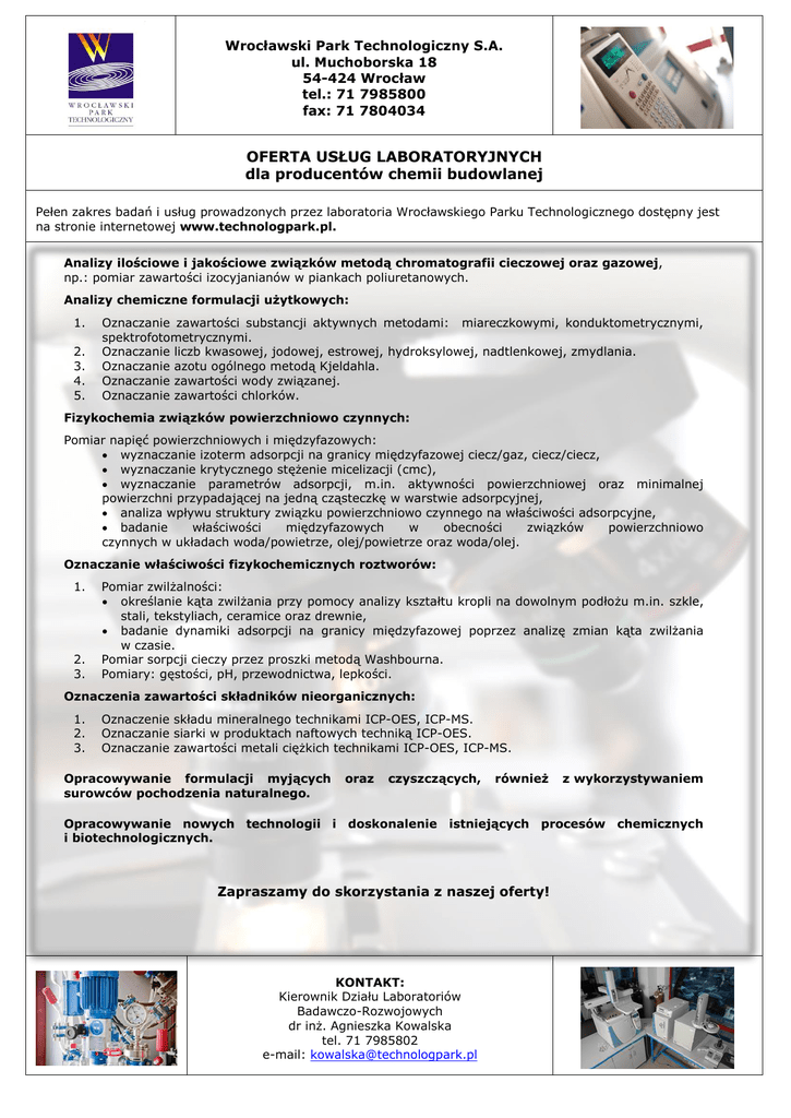 Wrocławski Park Technologiczny S.A. ul. Muchoborska 18 54-424 Wrocław tel.: 71 7985800 fax: 71 7804034 OFERTA USŁUG LABORATORYJNYCH dla producentów chemii budowlanej Pełen zakres badań i usług prowadzonych przez laboratoria Wrocławskiego Parku Technologicznego dostępny jest na stronie internetowej www.technologpark.pl. Analizy ilościowe i jakościowe związków metodą chromatografii cieczowej oraz gazowej, np.: pomiar zawartości izocyjanianów w piankach poliuretanowych. Analizy chemiczne formulacji użytkowych: 1. 2. 3. 4. 5. Oznaczanie zawartości substancji aktywnych metodami: miareczkowymi, konduktometrycznymi, spektrofotometrycznymi. Oznaczanie liczb kwasowej, jodowej, estrowej, hydroksylowej, nadtlenkowej, zmydlania. Oznaczanie azotu ogólnego metodą Kjeldahla. Oznaczanie zawartości wody związanej. Oznaczanie zawartości chlorków. Fizykochemia związków powierzchniowo czynnych: Pomiar napięć powierzchniowych i międzyfazowych: wyznaczanie izoterm adsorpcji na granicy międzyfazowej ciecz/gaz, ciecz/ciecz, wyznaczanie krytycznego stężenie micelizacji (cmc), wyznaczanie parametrów adsorpcji, m.in. aktywności powierzchniowej oraz minimalnej powierzchni przypadającej na jedną cząsteczkę w warstwie adsorpcyjnej, analiza wpływu struktury związku powierzchniowo czynnego na właściwości adsorpcyjne, badanie właściwości międzyfazowych w obecności związków powierzchniowo czynnych w układach woda/powietrze, olej/powietrze oraz woda/olej. Oznaczanie właściwości fizykochemicznych roztworów: 1. 2. 3. Pomiar zwilżalności: określanie kąta zwilżania przy pomocy analizy kształtu kropli na dowolnym podłożu m.in. szkle, stali, tekstyliach, ceramice oraz drewnie, badanie dynamiki adsorpcji na granicy międzyfazowej poprzez analizę zmian kąta zwilżania w czasie. Pomiar sorpcji cieczy przez proszki metodą Washbourna. Pomiary: gęstości, pH, przewodnictwa, lepkości. Oznaczenia zawartości składników nieorganicznych: 1. 2. 3. Oznaczenie składu mineralnego technikami ICP-OES, ICP-MS. Oznaczanie siarki w produktach naftowych techniką ICP-OES. Oznaczanie zawartości metali ciężkich technikami ICP-OES, ICP-MS. Opracowywanie formulacji myjących surowców pochodzenia naturalnego. oraz czyszczących, Opracowywanie nowych technologii i doskonalenie i biotechnologicznych. również z wykorzystywaniem istniejących procesów chemicznych Zapraszamy do skorzystania z naszej oferty! KONTAKT: Kierownik Działu Laboratoriów Badawczo-Rozwojowych dr inż. Agnieszka Kowalska tel. 71 7985802 e-mail: [email protected]