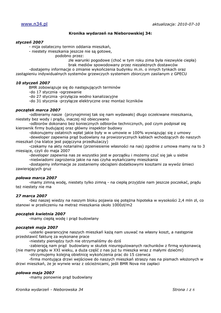 www.n34.pl aktualizacja: 2010-07-10 Kronika wydarzeń na Nieborowskiej 34: styczeń 2007 - mija ostateczny termin oddania mieszkań, - niestety mieszkania jeszcze nie są gotowe, podobno przez: złe warunki pogodowe (choć w tym roku zima była niezwykle ciepła) brak mediów spowodowany przez niezależnych dostawców -dostajemy informacje o zmianie wykończenia budynku m.in. o innych tynkach oraz zastąpieniu indywidualnych systemów grzewczych systemem zbiorczym zasilanym z GPECU 10 styczeń 2007 BMR zobowiązuje się do następujących terminów -do 17 stycznia -ogrzewanie -do 27 stycznia -przyłącza wodno kanalizacyjne -do 31 stycznia -przyłącze elektryczne oraz montaż liczników początek marca 2007 -odbieramy nasze (przynajmniej tak się nam wydawało) długo oczekiwane mieszkania, niestety bez wody i prądu, inaczej niż obiecywano -odbiorów dokonano bez koniecznych odbiorów technicznych, pod czym podpisał się kierownik firmy budującej oraz główny inspektor budowy -dokonujemy ostatnich wpłat jakie były w w umowie w 100% wywiązując się z umowy -deweloper zapewnia prąd budowlany na prowizorycznych kablach wchodzących do naszych mieszkań (na klatce jest pajęczyna przedłużaczy) -czekamy na akty notarialne (przeniesienie własności na nas) zgodnie z umowa mamy na to 3 miesiące, czyli do maja 2007 -developer zapewnia nas ze wszystko jest w porządku i możemy czuć się jak u siebie -nieświadomi zagrożenia jakie na nas czyha wykańczamy mieszkania -dostajemy informacje ze zostaniemy obciążeni dodatkowymi kosztami za wywóz śmieci zawierających gruz połowa marca 2007 -mamy zimną wodę, niestety tylko zimną - na ciepłą przyjdzie nam jeszcze poczekać, prądu też niestety nie ma 27 marca 2007 -bez naszej wiedzy na naszym bloku pojawia się potężna hipoteka w wysokości 2,4 mln zł, co stanowi w przeliczeniu na metraż mieszkania około 1000zł/m2 początek kwietnia 2007 -mamy ciepłą wodę i prąd budowlany początek maja 2007 -usterki gwarancyjne naszych mieszkań każą nam usuwać na własny koszt, a następnie przedstawić fakturę za wykonane prace -niestety pieniędzy tych nie otrzymaliśmy do dziś -zabierają nam prąd budowlany w skutek nieuregulowanych rachunków z firmą wykonawcą (nie mamy prądu w XXI wieku, a duża część z nas już tu mieszka wraz z małymi dziećmi) -otrzymujemy kolejną obietnicę wykończenia prac do 15 czerwca -firma montująca drzwi wejściowe do naszych mieszkań straszy nas na pismach włożonych w drzwi mieszkań, że je wyrwie wraz z ościeżnicami, jeśli BMR Nova nie zapłaci połowa maja 2007 -mamy ponownie prąd budowlany Kronika wydarzeń - Nieborowska 34 Strona 1 z 6 www.n34.pl aktualizacja: 2010-07-10 -spotykamy się i dowiadujemy się dzięki owocnej pracy naszych sąsiadów o długach ciążących na naszym bloku i podejmujemy wspólne działania -wysyłamy wspólnie list do BMR Nova, aby Zarząd wyjaśnił nam zaistniałą sytuację, podał realny harmonogram prac oraz listę usterek stwierdzonych w częściach wspólnych bloku. początek czerwca 2007 -definitywnie zabierają nam prąd budowlany (oczywiście za nieuregulowane przez BMR Nova płatności) -BMR Nova próbując uwolnić się od naszych roszczeń, podstawia nam pod nosy akty notarialne z terminem sprzedaży mieszkań w czerwcu 2009, tłumaczą nam, że jest to nasza jedyna szansa i nie dają nam nawet kilku dni na konsultacje z prawnikami, -9 osób podpisuje te akty, jednak większości takie zachowanie pracowników BMR Nova wydało się zbyt podejrzane i tego nie zrobiła -dopiero z powyższych aktów dowiadujemy się hipotece na 2,4 mln zł połowa czerwca 2007 -dochodzą kolejne hipoteki oraz dowiadujemy się o długach BMR m.in. od komornika na kolejne 1,3 mln zł (suma długów to około 1500zł/m2) -żadne prace nie zostały rozpoczęte -podpisujemy indywidualne umowy na dostawy prądu do mieszkań -na klatkach oraz wokół bloku wciąż panuje ciemność 22 czerwca 2007 -kolejne pismo o rychłym wszczęciu i ukończeniu prac w naszym bloku (podpisanie ugody z firma budowlaną) -niestety żadne prace nie zostały wszczęte -wspólnym wysiłkiem organizujemy oświetlenie na klatkach, zasilając je z naszych mieszkań -widząc kable na klatkach, pracownicy BMR Nova powiadamiają zakład energetyczny o rzekomo nielegalnym poborze prądu – po kontroli wszystko okazało się zgodne z prawem Czerwiec/Lipiec/Sierpień 2007 Zaczynamy prowadzić negocjacje z BMR i jej wierzycielami, poprzez kancelarię prawniczą, która nas reprezentuje. Ustalenia jakie przez tygodnie były dokonane na spotkaniach i były zaakcpetowane przez wszystkie strony. Nasz plan rozwiązania sytuacji polegał na: - przejęciu budynku w udziałach % przez każdego z mieszkańców - wykończeniu budynku na własny koszt - spłatę % hipoteki i wydzieleniu bezciężarowym lokali - zachowaniu roszczeń do BMR wynikających z umowy Jednak zostały one obalone poprzez pisemne oświadczenie wierzyciela, że się na nie nie zgadza. Choć pismo od wierzyciela mieliśmy w ręku, on sam twierdził ze to nieporozumienie i ustnie podtrzymywał ustalenia. Sytuacja co najmniej dziwna. 27 sierpień 2007 Firma budowlana zaczyna egzekucję komorniczą z naszego bloku, aby odzyskać dług 1,3 mln zł. Wrzesień 2007 - Wznawiamy rozmowy z wierzycielami i BMR Nova - Zakładamy Stowarzyszenie Nieborowska 34 - Odcinają nam ciepłą wodę - Toniemy w śmieciach, firmy BMR Nova nie stać na wywiezienie śmietnika Kronika wydarzeń - Nieborowska 34 Strona 2 z 6 www.n34.pl aktualizacja: 2010-07-10 Październik 2007 - wywożą nam śmieci - mamy ciepłą wodę - mamy ogrzewanie (mamy nadzieje, że nam go w środku zimy nie zabiorą i nie zamarzniemy) - dzięki operatywności mieszkańców do bloku wkracza telewizja i internet - próbujemy samodzielnie dogadać się z dostawcami mediów tak, aby płacić rachunki bezpośrednio do nich Prowadzone od 2 miesięcy trójstronne ustalenia bazowa