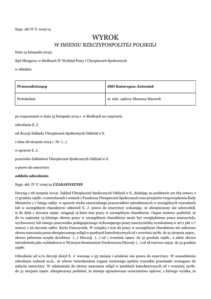 Sygn. akt IV U 1109/14 WYROK W IMIENIU RZECZYPOSPOLITEJ POLSKIEJ Dnia 13 listopada 2015r. Sąd Okręgowy w Siedlcach IV Wydział Pracy i Ubezpieczeń Społecznych w składzie: Przewodniczący SSO Katarzyna Antoniak Protokolant st. sekr. sądowy Marzena Mazurek po rozpoznaniu w dniu 13 listopada 2015 r. w Siedlcach na rozprawie odwołania E. J. od decyzji Zakładu Ubezpieczeń Społecznych Oddział w S. z dnia 28 sierpnia 2014 r. Nr (...) w sprawie E. J. przeciwko Zakładowi Ubezpieczeń Społecznych Oddział w S. o prawo do emerytury oddala odwołanie. Sygn. akt: IV U 1109/14 UZASADNIENIE Decyzją z 28 sierpnia 2014r. Zakład Ubezpieczeń Społecznych Oddział w S., działając na podstawie art.184 ustawy z 17 grudnia 1998r. o emeryturach i rentach z Funduszu Ubezpieczeń Społecznych oraz przepisów rozporządzenia Rady Ministrów z 7 lutego 1983r. w sprawie wieku emerytalnego pracowników zatrudnionych w szczególnych warunkach lub w szczególnym charakterze odmówił E. J. prawa do emerytury wskazując, że ubezpieczony nie udowodnił, iż do dnia 1 stycznia 1999r. osiągnął 15-letni staż pracy w szczególnym charakterze. Organ rentowy podniósł, że do co najmniej 15-letniego okresu pracy w szczególnym charakterze może być uwzględniona praca nauczyciela, wychowawcy lub innego pracownika pedagogicznego wykonującego pracę nauczycielską wymienioną w art.1 pkt 1-7 ustawy z 26 stycznia 1982r. Karta Nauczyciela. W związku z tym do pracy w szczególnym charakterze nie zaliczono okresu nauczania przez ubezpieczonego religii w punktach katechetycznych od 1 września 1978r. do 31 sierpnia 1990r., okresu pełnienia urzędu dyrektora (...) Diecezji (...) od 1 września 1990r. do 31 grudnia 1998r., a także okresu zatrudnienia jako wykładowca w Wyższym Seminarium Duchownym Diecezji (...) od 18 czerwca 1993r. do 31 grudnia 1998r. Odwołanie od w/w decyzji złożył E. J. wnosząc o jej zmianę i ustalenie mu prawa do emerytury. W uzasadnieniu odwołania wskazał m.in., że wbrew twierdzeniom organu rentowego spełnia wszystkie przesłanki wymagane do nabycia emerytury. W odniesieniu do okresu nauczania religii w punktach katechetycznych od 1 września 1978r. do 31 sierpnia 1990r. ubezpieczony podniósł, że istnieje ugruntowane orzecznictwo sądowe, z którego wynika, że naukę religii w punktach katechetycznych prowadzonych przez osoby prawne Kościoła (...) (parafie) przed wejściem w życie ustawy z 17 maja 1989r. o stosunku Państwa do Kościoła (...) w RP należy uznać za pracę nauczycielską w rozumieniu art.1 ust.1 w zw. z art.3 pkt 1 Karty Nauczyciela oraz art.2 pkt 3 ustawy z 7 września 1991r. o systemie oświaty. Stanowisko takie zajął Sąd Najwyższy w wyroku z 3 sierpnia 2000r. w sprawie II UKN 661/99, OSNAP 2002/4/93, a potwierdził je w kolejnym wyroku z 13 czerwca 2001r. w sprawie III ZP 32/00. W odniesieniu do okresu pracy w charakterze wykładowcy w Wyższym Seminarium Duchownym Diecezji (...) od 18 czerwca 1993r. do 31 grudnia 1998r. ubezpieczony wskazał, że okres ten również należy zaliczyć do pracy w szczególnym charakterze, a to na mocy art.23 ust.4 w/w ustawy o stosunku Państwa do Kościoła (...) w RP, zgodnie z którym do wykładowców wyższych seminariów duchownych stosuje się przepisy art.21 i 22 ustawy, a zatem posiadają oni takie same prawa jak nauczyciele i wychowawcy zatrudnieni w państwowych szkołach i placówkach oświatowo-wychowawczych oraz opiekuńczo-wychowawczych. W tych okolicznościach, w ocenie ubezpieczonego spełnia on wszystkie przesłanki do nabycia emerytury na podstawie art.184 ustawy emerytalnej w zw. z §4 rozporządzenia Rady Ministrów z 7 lutego 1983r. w sprawie wieku emerytalnego pracowników zatrudnionych w szczególnych warunkach lub w szczególnym charakterze (odwołanie k.1-4). W odpowiedzi na odwołanie organ rentowy wniósł o jego oddalenie powołując się na przepisy prawa i uzasadnienie zawarte w zaskarżonej decyzji (odpowiedź organu rentowego na odwołanie k.5-6). Sąd ustalił, co następuje: Ubezpieczony E. J. w dniu 6 sierpnia 2013r. ukończył 60-ty rok życia. W dniu 27 maja 2014r. wystąpił do Zakładu Ubezpieczeń Społecznych Oddział w S. z wnioskiem o emeryturę (wniosek o emeryturę z 27 maja 2014r. k.1 akt emerytalnych). Na podstawie przedłożonych do wniosku dokumentów organ rentowy ustalił, że na dzień 1 stycznia 1999r. ubezpieczony udowodnił staż ubezpieczeniowy w wymiarze 26 lat, 3 miesiące i 14 dni, z czego 21 lat, 6 miesięcy i 26 dni stanowią okresy składkowe, a 4 lata, 8 miesięcy i 18 dni okresy nieskładkowe. Jednocześnie organ rentowy ustalił, że ubezpieczony nie wykazał, aby na dzień 1 stycznia 1999r. legitymował się co najmniej 15 letnim okresem pracy w szczególnym charakterze. Z uwagi na brak wymaganego ustawą stażu pracy w szczególnym charakterze decyzją z 28 sierpnia 2014r. organ rentowy odmówił ubezpieczonemu przyznania emerytury (decyzja z 28 sierpnia 2014r. k.42 akt emerytalnych). Ubezpieczony E. J. jest osobą duchowną Kościoła (...) – księdzem diecezjalnym Diecezji (...). W okresie od 19 września 1972r. do 24 czerwca 1978r. ubezpieczony odbywał sześcioletnie stacjonarne dzienne studia filozoficzno-teologiczne w Wyższym Seminarium Duchownym w S.. W dniu 5 czerwca 1977r. ubezpieczony przyjął święcenia diakońskie, a w dniu 24 czerwca 1978r. święcenia kapłańskie (zaświadczenie K. Diecezjalnej (...) z 22 maja 2014r. k.10 akt emerytalnych). Po przyjęciu święceń kapłańskich ubezpieczony pełnił wyznaczone mu przez B. (...) zadania wikariusza i nauczyciela religii w następujących parafiach Diecezji (...): • od 1 września 1978r. do 31 stycznia 1979r. w parafii H., • od 1 lutego 1979r. do 31 sierpnia 1980r. w parafii S., • od 1 września 1980r. do 31 sierpnia 1983r. w parafii W., • od 1 września 1983r. dodo 31 sierpnia 1984r. w parafii Podwyższenia Krzyża Świętego w Ł., • od 1 września 1984r. do 31 sier