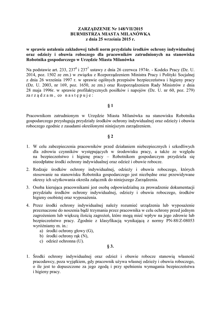 ZARZĄDZENIE Nr 148/VII/2015 BURMISTRZA MIASTA MILANÓWKA z dnia 25 września 2015 r. w sprawie ustalenia zakładowej tabeli norm przydziału środków ochrony indywidualnej oraz odzieży i obuwia roboczego dla pracowników zatrudnionych na stanowisku Robotnika gospodarczego w Urzędzie Miasta Milanówka Na podstawie art. 233, 2376 i 2377 ustawy z dnia 26 czerwca 1974r. - Kodeks Pracy (Dz. U. 2014, poz. 1502 ze zm.) w związku z Rozporządzeniem Ministra Pracy i Polityki Socjalnej z dnia 26 września 1997 r. w sprawie ogólnych przepisów bezpieczeństwa i higieny pracy (Dz. U. 2003, nr 169, poz. 1650, ze zm.) oraz Rozporządzeniem Rady Ministrów z dnia 28 maja 1996r. w sprawie profilaktycznych posiłków i napojów (Dz. U. nr 60, poz. 279) za r z ą d z a m , co n a s t ę p u j e : §1 Pracownikom zatrudnionym w Urzędzie Miasta Milanówka na stanowisku Robotnika gospodarczego przysługują przydziały środków ochrony indywidualnej oraz odzieży i obuwia roboczego zgodnie z zasadami określonymi niniejszym zarządzeniem. §2 1. W celu zabezpieczenia pracowników przed działaniem niebezpiecznych i szkodliwych dla zdrowia czynników występujących w środowisku pracy, a także ze względu na bezpieczeństwo i higienę pracy – Robotnikom gospodarczym przydziela się nieodpłatne środki ochrony indywidualnej oraz odzież i obuwie robocze. 2. Rodzaje środków ochrony indywidualnej, odzieży i obuwia roboczego, których stosowanie na stanowisku Robotnika gospodarczego jest niezbędne oraz przewidywane okresy ich użytkowania określa załącznik do niniejszego Zarządzenia. 3. Osoba kierująca pracownikami jest osobą odpowiedzialną za prowadzenie dokumentacji przydziału środków ochrony indywidualnej, odzieży i obuwia roboczego, środków higieny osobistej oraz wyposażenia. 4. Przez środki ochrony indywidualnej należy rozumieć urządzenia lub wyposażenie przeznaczone do noszenia bądź trzymania przez pracownika w celu ochrony przed jednym zagrożeniem lub większą ilością zagrożeń, które mogą mieć wpływ na jego zdrowie lub bezpieczeństwo pracy. Zgodnie z klasyfikacją wynikającą z normy PN-88/Z-08053 wyróżniamy m. in.: a) środki ochrony głowy (G), b) środki ochrony rąk (N), c) odzież ochronna (U). § 3. 1. Środki ochrony indywidualnej oraz odzież i obuwie robocze stanowią własność pracodawcy, poza wyjątkiem, gdy pracownik używa własnej odzieży i obuwia roboczego, o ile jest to dopuszczone za jego zgodą i przy spełnieniu wymagania bezpieczeństwa i higieny pracy. 2. Środki ochrony indywidualnej mogą być użytkowane do czasu utraty ich cech ochronnych, a odzież i obuwie robocze do czasu utraty ich cech użytkowych w stopniu uniemożliwiającym dokonanie naprawy. W tym momencie przechodzą też na własność pracownika. §4 Środki ochrony, odzież i obuwie robocze przeznaczone są do użytku podczas wykonywania pracy, umożliwiają zachowanie higieny i wymogów sanitarnych oraz ochronę wytwarzanego produktu. Środki ochrony indywidualnej, odzież i obuwie robocze winny być przez pracowników użytkowane w miejscu pracy i zgodnie z przeznaczeniem. §5 Pracodawca może nie dopuścić pracownika do pracy bez środków ochrony indywidualnej oraz odzieży i obuwia roboczego przewidzianych do stosowania na danym stanowisku pracy. §6 W przypadku utraty bądź zniszczenia środka ochrony osobistej lub odzieży i obuwia roboczego pracownik otrzymuje nowe wyposażenie, na następujących warunkach: 1) jeżeli utrata lub zniszczenie nastąpiło bez jego winy – bezpłatnie 2) utrata lub zniszczenie nastąpiło z jego winy – za zwrotem kwoty równej zamortyzowanej części wyposażenia. §7 Prawo do otrzymania środków ochrony indywidualnej oraz odzieży i obuwia roboczego pracownik nabywa z dniem zawarcia umowy o pracę, a traci z dniem rozwiązania stosunku pracy. §8 1. Pracodawca wydaje pracownikom nieodpłatnie proszek do prania odzieży roboczej. 2. Ustala się wysokość przydziału środków piorących dla pracowników używających odzieży roboczej w wysokości 2 kg proszku do prania wydawanych pracownikom 1 raz na 6 miesięcy. 3. Ilość wydanego proszku może zostać pomniejszona o okres nieobecności w pracy np. z powodu urlopu czy choroby. §9 Pracodawca zapewnia pracownikom dostęp do środków higieny osobistej dostosowanych do rodzaju i stopnia zanieczyszczenia ciała przy określonych pracach (m.in. mydło, ręczniki papierowe poprzez ich wyłożenie w toaletach Urzędu Miasta Milanówka zlokalizowanych w trzech budynkach urzędu: A, B i C przy ul. Kościuszki 45 i ul. Spacerowej 4). § 10 Pracownicy czynni zawodowo mają zapewniony w sekretariacie Urzędu dostęp do wody zdatnej do picia. § 11 Wykonanie Zarządzenia powierzam Sekretarzowi Miasta. § 12 Zarządzenie wchodzi w życie z dniem podjęcia. Burmistrz Miasta Milanówka /-/ Wiesława Kwiatkowska Przygotowała: Monika Dziewięcka Załącznik do Zarządzenia Nr 148/VII/2015 Burmistrza Miasta Milanówka z dnia 25 września 2015 r. Tabela norm przydziału środków ochrony indywidualnej, odzieży, obuwia roboczego przysługującego Robotnikom gospodarczym oraz okresy ich używalności Stanowisko pracy lub wykonywanie Rodzaj odzieży roboczej i środków określonych ochrony indywidualnej Okres używalności czynności U – ubranie drelichowe Robotnik gospodarczy U – obuwie sk/gum (letnie) 12 miesięcy 12 miesięcy U – obuwie sk/gum ocieplane 12 miesięcy U – kurtka ocieplana 24 miesiące U – kurtka przeciwdeszczowa 12 miesięcy U – kamizelka odblaskowa do zużycia N – rękawice ochronne do zużycia G – czapka z daszkiem 24 miesiące G – czapka ocieplana 24 miesiące