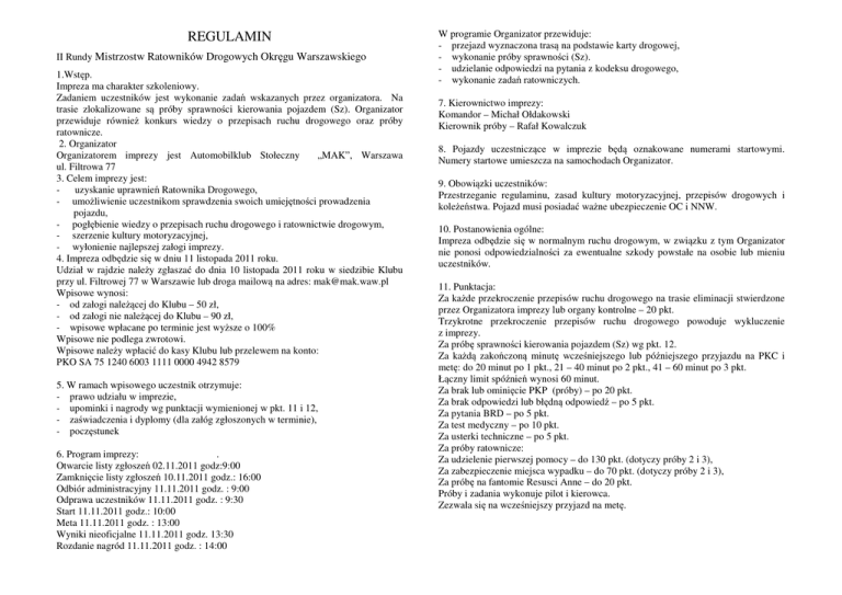 REGULAMIN II Rundy Mistrzostw Ratowników Drogowych Okręgu Warszawskiego 1.Wstęp. Impreza ma charakter szkoleniowy. Zadaniem uczestników jest wykonanie zadań wskazanych przez organizatora. Na trasie zlokalizowane są próby sprawności kierowania pojazdem (Sz). Organizator przewiduje również konkurs wiedzy o przepisach ruchu drogowego oraz próby ratownicze. 2. Organizator Organizatorem imprezy jest Automobilklub Stołeczny „MAK”, Warszawa ul. Filtrowa 77 3. Celem imprezy jest: uzyskanie uprawnień Ratownika Drogowego, - umożliwienie uczestnikom sprawdzenia swoich umiejętności prowadzenia pojazdu, - pogłębienie wiedzy o przepisach ruchu drogowego i ratownictwie drogowym, - szerzenie kultury motoryzacyjnej, - wyłonienie najlepszej załogi imprezy. 4. Impreza odbędzie się w dniu 11 listopada 2011 roku. Udział w rajdzie należy zgłaszać do dnia 10 listopada 2011 roku w siedzibie Klubu przy ul. Filtrowej 77 w Warszawie lub droga mailową na adres: [email protected] Wpisowe wynosi: - od załogi należącej do Klubu – 50 zł, - od załogi nie należącej do Klubu – 90 zł, - wpisowe wpłacane po terminie jest wyższe o 100% Wpisowe nie podlega zwrotowi. Wpisowe należy wpłacić do kasy Klubu lub przelewem na konto: PKO SA 75 1240 6003 1111 0000 4942 8579 5. W ramach wpisowego uczestnik otrzymuje: - prawo udziału w imprezie, - upominki i nagrody wg punktacji wymienionej w pkt. 11 i 12, - zaświadczenia i dyplomy (dla załóg zgłoszonych w terminie), - poczęstunek 6. Program imprezy: . Otwarcie listy zgłoszeń 02.11.2011 godz:9:00 Zamknięcie listy zgłoszeń 10.11.2011 godz.: 16:00 Odbiór administracyjny 11.11.2011 godz. : 9:00 Odprawa uczestników 11.11.2011 godz. : 9:30 Start 11.11.2011 godz.: 10:00 Meta 11.11.2011 godz. : 13:00 Wyniki nieoficjalne 11.11.2011 godz. 13:30 Rozdanie nagród 11.11.2011 godz. : 14:00 W programie Organizator przewiduje: - przejazd wyznaczona trasą na podstawie karty drogowej, - wykonanie próby sprawności (Sz). - udzielanie odpowiedzi na pytania z kodeksu drogowego, - wykonanie zadań ratowniczych. 7. Kierownictwo imprezy: Komandor – Michał Ołdakowski Kierownik próby – Rafał Kowalczuk 8. Pojazdy uczestniczące w imprezie będą oznakowane numerami startowymi. Numery startowe umieszcza na samochodach Organizator. 9. Obowiązki uczestników: Przestrzeganie regulaminu, zasad kultury motoryzacyjnej, przepisów drogowych i koleżeństwa. Pojazd musi posiadać ważne ubezpieczenie OC i NNW. 10. Postanowienia ogólne: Impreza odbędzie się w normalnym ruchu drogowym, w związku z tym Organizator nie ponosi odpowiedzialności za ewentualne szkody powstałe na osobie lub mieniu uczestników. 11. Punktacja: Za każde przekroczenie przepisów ruchu drogowego na trasie eliminacji stwierdzone przez Organizatora imprezy lub organy kontrolne – 20 pkt. Trzykrotne przekroczenie przepisów ruchu drogowego powoduje wykluczenie z imprezy. Za próbę sprawności kierowania pojazdem (Sz) wg pkt. 12. Za każdą zakończoną minutę wcześniejszego lub późniejszego przyjazdu na PKC i metę: do 20 minut po 1 pkt., 21 – 40 minut po 2 pkt., 41 – 60 minut po 3 pkt. Łączny limit spóźnień wynosi 60 minut. Za brak lub ominięcie PKP (próby) – po 20 pkt. Za brak odpowiedzi lub błędną odpowiedź – po 5 pkt. Za pytania BRD – po 5 pkt. Za test medyczny – po 10 pkt. Za usterki techniczne – po 5 pkt. Za próby ratownicze: Za udzielenie pierwszej pomocy – do 130 pkt. (dotyczy próby 2 i 3), Za zabezpieczenie miejsca wypadku – do 70 pkt. (dotyczy próby 2 i 3), Za próbę na fantomie Resusci Anne – do 20 pkt. Próby i zadania wykonuje pilot i kierowca. Zezwala się na wcześniejszy przyjazd na metę. 12. Próba sprawności kierowania pojazdem (Sz). Czas przejazdu próby liczony jest od momentu startu do momentu prawidłowego zatrzymania pojazdu, z linią mety między osiami. Rysunek próby udostępniony jest uczestnikowi w materiałach imprezy. Próby sprawnościowe wykonywane są przez kierowcę wraz z pilotem. Próba musi być wykonana samochodem zgłoszonym przez uczestnika. Użycie pojazdu zastępczego powoduje naliczenie 20 pkt. Czas liczony jest z dokładnością do 0,1 sek. trwania próby – 0,1 pkt. Za potrącenie, wywrócenie, przemieszczenie słupka – po 5 pkt. Za przekroczenie linii mety – 5 pkt. Błędne przejechanie trasy lub nie wystartowanie w Sz – 20 pkt. Zabrania się cofania. Za cofanie pojazdu – 20 pkt. 15. Uwagi końcowe: Zaleca się posiadanie kodeksu drogowego oraz planu Warszawy i okolic. Uczestnicy Rajdu biorą w nim udział na własną odpowiedzialność. Uczestnicy, którzy uzyskali uprawnienia Ratownika Drogowego PZM otrzymują upominki. Zwycięzcy otrzymują nagrody. Postępowanie prawne odnośnie współzawodnictwa i uczestnictwa jest wykluczone. Bezpiecznej drogi życzą: ORGANIZATORZY Automobilklub Stołeczny MOTO AUTO KLUB „MAK” Zarządu Okręgowego Polskiego Związku Motorowego w Warszawie REGULAMIN II Rundy Mistrzostw Ratowników Drogowych Okręgu Warszawskiego Niepodległość 2011. Warszawa, 11 listopada 2011r.