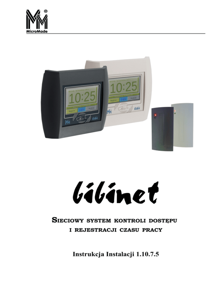 bibinet SIECIOWY SYSTEM KONTROLI DOSTĘPU I REJESTRACJI CZASU PRACY Instrukcja Instalacji 1.10.7.5 bibinet Copyright © 2014 by MicroMade All rights reserved Wszelkie prawa zastrzeżone MicroMade Gałka i Drożdż sp. j. 64-920 PIŁA, ul. Wieniawskiego 16 Tel./fax: 67 213.24.14 E-mail: [email protected] Internet: www.micromade.pl Wszystkie nazwy i znaki towarowe użyte w niniejszej publikacji są własnością odpowiednich firm. 2 Instrukcja Instalacji 1.10.7.5 © 06/2014 MicroMade bibinet Spis treści 1.Informacje ogólne............................................................................................................................................................5 1.1 Wymagania sprzętowe..............................................................................................................................................5 1.2 Struktura sieci komputerowej....................................................................................................................................5 1.2.1 Serwery systemu bibinet...................................................................................................................................6 1.2.2 Terminale w sieci bibi.net................................................................................................................................6 2.Urządzenia systemu bibinet............................................................................................................................................7 2.1 Interfejsy...................................................................................................................................................................7 2.2 Kontrolery.................................................................................................................................................................7 2.3 Czytniki.....................................................................................................................................................................7 2.3.1 Czytniki Unique................................................................................................................................................7 2.3.2 Czytniki Mifare................................................................................................................................................8 2.3.3 Czytniki innych producentów...........................................................................................................................8 2.4 Rejestratory Czasu Pracy..........................................................................................................................................8 2.5 Wyświetlacze............................................................................................................................................................8 2.6 Autonomiczne zamki kontroli dostępu......................................................................................................................8 3. Oprogramowanie............................................................................................................................................................9 3.1 Dostępne licencje......................................................................................................................................................9 3.2 Programy - klienci sieci bibi.net...............................................................................................................................9 3.3 Kodowanie transmisji – klucze sprzętowe..............................................................................................................10 3.4 Programy narzędziowe............................................................................................................................................10 4.Instalacja oprogramowania 1.10.7.5............................................................................................................................11 4.1 Reinstalacja z wersji wcześniejszych oprogramowania..........................................................................................11 4.1.1 Możliwe problemy z reinstalacją....................................................................................................................12 4.2 Instalacja oprogramowania w nowym systemie bibinet..........................................................................................13 4.2.1 Przed instalacją...............................................................................................................................................13 4.2.2 Instalacja programów.....................................................................................................................................14 4.2.3 Wytworzenie bazy danych..............................................................................................................................20 4.2.4 Konfiguracja kluczy sprzętowych bibi.HAK.................................................................................................25 4.2.5 Zakończenie procesu instalacji.......................................................................................................................31 4.3 Instalacja wersji DEMO..........................................................................................................................................32 5.Konfiguracja urządzeń systemu bibinet......................................................................................................................34 5.1 Deklaracje wstępne w programie bibi.....................................................................................................................34 5.1.1 Deklaracja wydziałów i grup pracowników...................................................................................................34 5.1.2 Deklaracja stref dostępu i obszarów zabezpieczonych.