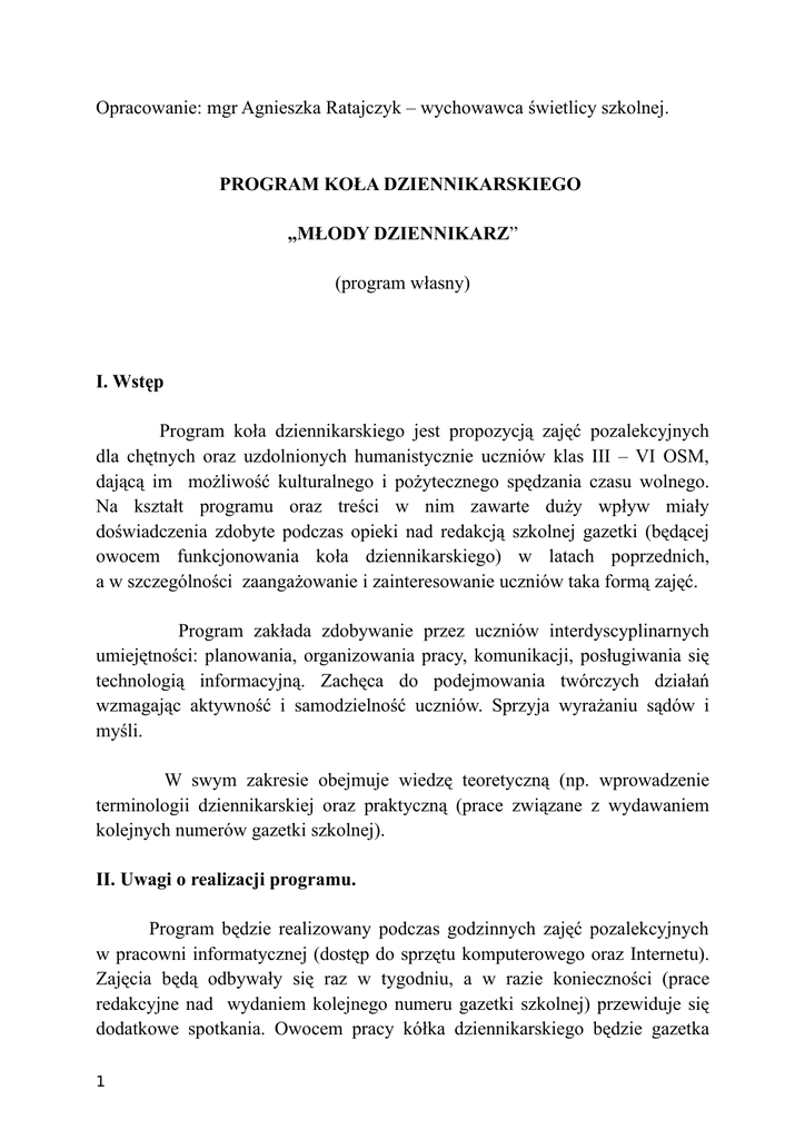 Opracowanie: mgr Agnieszka Ratajczyk – wychowawca świetlicy szkolnej. PROGRAM KOŁA DZIENNIKARSKIEGO „MŁODY DZIENNIKARZ” (program własny) I. Wstęp Program koła dziennikarskiego jest propozycją zajęć pozalekcyjnych dla chętnych oraz uzdolnionych humanistycznie uczniów klas III – VI OSM, dającą im możliwość kulturalnego i pożytecznego spędzania czasu wolnego. Na kształt programu oraz treści w nim zawarte duży wpływ miały doświadczenia zdobyte podczas opieki nad redakcją szkolnej gazetki (będącej owocem funkcjonowania koła dziennikarskiego) w latach poprzednich, a w szczególności zaangażowanie i zainteresowanie uczniów taka formą zajęć. Program zakłada zdobywanie przez uczniów interdyscyplinarnych umiejętności: planowania, organizowania pracy, komunikacji, posługiwania się technologią informacyjną. Zachęca do podejmowania twórczych działań wzmagając aktywność i samodzielność uczniów. Sprzyja wyrażaniu sądów i myśli. W swym zakresie obejmuje wiedzę teoretyczną (np. wprowadzenie terminologii dziennikarskiej oraz praktyczną (prace związane z wydawaniem kolejnych numerów gazetki szkolnej). II. Uwagi o realizacji programu. Program będzie realizowany podczas godzinnych zajęć pozalekcyjnych w pracowni informatycznej (dostęp do sprzętu komputerowego oraz Internetu). Zajęcia będą odbywały się raz w tygodniu, a w razie konieczności (prace redakcyjne nad wydaniem kolejnego numeru gazetki szkolnej) przewiduje się dodatkowe spotkania. Owocem pracy kółka dziennikarskiego będzie gazetka 1 szkolna „Music school”, która wydawana będzie jako dwumiesięcznik. Przygotowywanie kolejnych wydań gazetki odbywać się będzie według opracowanego planu wyznaczającego odpowiedzialnych za poszczególne zadania. III. Cele programu. Działalność koła dziennikarskiego koncentruje się na redagowaniu gazetki szkolnej. Z procesu tego wynikają poniższe cele. Cele ogólne: - wszechstronny rozwój uczniów, - rozbudzanie zainteresowań i zdolności, - kształcenie postaw kreatywnych, - uczenie odpowiedzialności za własną pracę, - rozwijanie umiejętności współpracy w grupie. Cele szczegółowe: - zapoznanie z pracą dziennikarza i zasadami obowiązującymi w tym zawodzie, - doskonalenie umiejętności komunikowania się, - korzystanie z różnych źródeł informacji (encyklopedie, słowniki, prasa, radio, telewizja), - doskonalenie umiejętności czytania ze zrozumieniem, - rozwijanie umiejętności posługiwania się różnymi formami wypowiedzi pisemnych, - doskonalenie umiejętności poprawnego posługiwania się językiem pod względem ortograficznym, stylistycznym i gramatycznym, - przygotowanie uczniów do świadomego i krytycznego odbioru przekazów medialnych, 2 - rozwój wyobraźni, fantazji, ekspresji artystycznej, - wykorzystanie programów i technik komputerowch. IV. Treści programowe. TEMATYKA ZAJĘĆ ZADANIA DO RELIZACJI OSIĄGNIĘCIA UCZNIÓW Uczeń: 1.Organizacja pracy kółka dziennikarskiego. 1.Przedstawienie uczniom programu kółka dziennikarskiego. 2. Poznanie oczekiwań uczniów dotyczących pracy redakcji. 3. Przydzielenie poszczególnych funkcji, zadań do realizacji. 4. Zainicjowanie współpracy. - podejmuje decyzję o współpracy w zespole redakcyjnym, - dostrzega swoje mocne strony, - zna swoje obowiązki, - wyraża swoje opinie, - rozwija sprawność dyskusji. 2.Zasady tworzenia , wydawania i kolportowania gazetki szkolnej. 1.Poznanie pracy dziennikarza i wydawcy. 2.Formułowanie zasad obowiązujących w pracy dziennikarza. - zna formy pracy wydawcy i dziennikarza gazetki, - wie, jakie cechy powinien mieć „dobry” dziennikarz, 3.Słowniczek młodego dziennikarza. 1.Poznanie podstawowych pojęć związanych z dziennikarstwem. - zna podstawowe pojęcia dotyczące pracy dziennikarskiej, - operuje poznanymi pojęciami. 4.Czasopisma i gazety – 1.Poznanie struktury - zna prasę dostępną na 3 źródła wiedzy. czasopisma. 2. Podział czasopism. 3. Poznanie historii czasopiśmiennictwa. rynku, - umie dokonać jej podziału ze względu na częstotliwość ukazywania się i adresatów, - wie jak stworzyć czasopismo, - omawia historię czasopiśmiennictwa. 5.Środki masowego przekazu. 1.Poznanie pojęcia mass media, ich podziału i charakterystyki . 2. Określenie roli środków masowego przekazu w życiu człowieka. - zna środki masowego przekazu, - umie z nich mądrze korzystać, - zna pojęcie mass mediów. 6. Sztuka filmowa. 1.Poznanie budowy filmu. 2. Podział na gatunki filmowe. 3.Poznanie najważniejszych osób pracujących przy budowie filmu . 4. Dokonanie recenzji filmu. - posiada najważniejsze informacje dotyczące sztuki filmowej, - rozwija umiejętność dyskusji, - potrafi stworzyć recenzję filmu. 6. Podstawowe gatunki wypowiedzi dziennikarskiej: • Sprawozdanie • Notatka, • Reportaż, • Wywiad, 1.Poznanie cech i rodzajów poszczególnych gatunków wypowiedzi dziennikarskiej. 2. Tworzenie różnych form wypowiedzi. 3. Kształcenie sprawności językowej i stylistycznej. - rozumie cechy poszczególnych form, - potrafi określić różnice między podanymi formami wypowiedzi, - poznaje swoje twórcze możliwości, - podejmuje próby redagowania wypowiedzi 4 poszczególnych gatunków dziennikarskich, - poszukuje interesujących tematów, - umie przeprowadzić wywiad, -posługuje się językiem charakterystycznym dla danej formy wypowiedzi. 8. Reklama. 1.Poznanie cech i rodzajów reklam. 2.Układanie reklam. - umie określić podstawowe zadania reklamy, - tworzy własne teksty reklamowe, - potrafi krytycznie ocenić reklamę, - układa plan reklamy i sprzedaży gazetki. 9.Technologia komputerowa. 1.Praca z z edytorem tekstu WORD. 2. Formatowanie tekstów. 3. Operacje na plikach i katalogach. 4. Projektowanie i wykonywanie szaty graficznej gazetki szkolnej. - sprawnie posługuje się sprzętem komputerowym, - wykorzystuje programy komputerowe przydatne w redagowaniu gazety. 