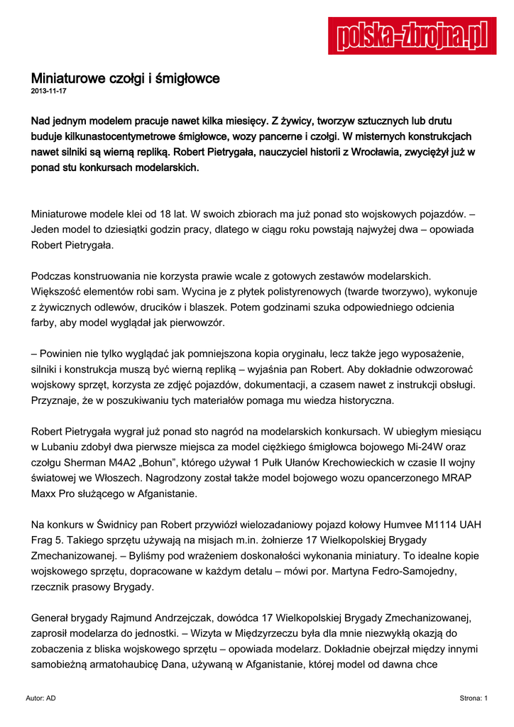 Miniaturowe czołgi i śmigłowce 2013-11-17 Nad jednym modelem pracuje nawet kilka miesięcy. Z żywicy, tworzyw sztucznych lub drutu buduje kilkunastocentymetrowe śmigłowce, wozy pancerne i czołgi. W misternych konstrukcjach nawet silniki są wierną repliką. Robert Pietrygała, nauczyciel historii z Wrocławia, zwyciężył już w ponad stu konkursach modelarskich. Miniaturowe modele klei od 18 lat. W swoich zbiorach ma już ponad sto wojskowych pojazdów. – Jeden model to dziesiątki godzin pracy, dlatego w ciągu roku powstają najwyżej dwa – opowiada Robert Pietrygała. Podczas konstruowania nie korzysta prawie wcale z gotowych zestawów modelarskich. Większość elementów robi sam. Wycina je z płytek polistyrenowych (twarde tworzywo), wykonuje z żywicznych odlewów, drucików i blaszek. Potem godzinami szuka odpowiedniego odcienia farby, aby model wyglądał jak pierwowzór. – Powinien nie tylko wyglądać jak pomniejszona kopia oryginału, lecz także jego wyposażenie, silniki i konstrukcja muszą być wierną repliką – wyjaśnia pan Robert. Aby dokładnie odwzorować wojskowy sprzęt, korzysta ze zdjęć pojazdów, dokumentacji, a czasem nawet z instrukcji obsługi. Przyznaje, że w poszukiwaniu tych materiałów pomaga mu wiedza historyczna. Robert Pietrygała wygrał już ponad sto nagród na modelarskich konkursach. W ubiegłym miesiącu w Lubaniu zdobył dwa pierwsze miejsca za model ciężkiego śmigłowca bojowego Mi-24W oraz czołgu Sherman M4A2 „Bohun”, którego używał 1 Pułk Ułanów Krechowieckich w czasie II wojny światowej we Włoszech. Nagrodzony został także model bojowego wozu opancerzonego MRAP Maxx Pro służącego w Afganistanie. Na konkurs w Świdnicy pan Robert przywiózł wielozadaniowy pojazd kołowy Humvee M1114 UAH Frag 5. Takiego sprzętu używają na misjach m.in. żołnierze 17 Wielkopolskiej Brygady Zmechanizowanej. – Byliśmy pod wrażeniem doskonałości wykonania miniatury. To idealne kopie wojskowego sprzętu, dopracowane w każdym detalu – mówi por. Martyna Fedro-Samojedny, rzecznik prasowy Brygady. Generał brygady Rajmund Andrzejczak, dowódca 17 Wielkopolskiej Brygady Zmechanizowanej, zaprosił modelarza do jednostki. – Wizyta w Międzyrzeczu była dla mnie niezwykłą okazją do zobaczenia z bliska wojskowego sprzętu – opowiada modelarz. Dokładnie obejrzał między innymi samobieżną armatohaubicę Dana, używaną w Afganistanie, której model od dawna chce Autor: AD Strona: 1 wykonać. Potrzeba jednak do tego dokładnych danych haubicy, które trudno zdobyć. – Tutaj mogłem porozmawiać o szczegółach konstrukcji z żołnierzami, którzy strzelają z Dany, oraz zrobić dokładne zdjęcia. Już zabieram się do pracy nad armatohaubicą – stwierdza pan Robert. Autor: AD Strona: 2