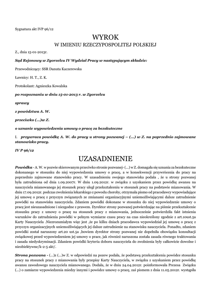 Sygnatura akt IVP 96/12 WYROK W IMIENIU RZECZYPOSPOLITEJ POLSKIEJ Z., dnia 15-01-2013r. Sąd Rejonowy w Zgorzelcu IV Wydział Pracy w następującym składzie: Przewodniczący: SSR Danuta Kaczerewska Ławnicy: H. T., Z. K. Protokolant: Agnieszka Kowalska po rozpoznaniu w dniu 15-01-2013 r. w Zgorzelcu sprawy z powództwa A. W. przeciwko (...)w Z. o uznanie wypowiedzenia umowy o pracę za bezskuteczne I. przywraca powódkę A. W. do pracy u strony pozwanej – (...) w Z. na poprzednio zajmowane stanowisko pracy. IV P 96/12 UZASADNIENIE Powódka - A. W. w pozwie skierowanym przeciwko stronie pozwanej- (...) w Z. domagała się uznania za bezskuteczne dokonanego w stosunku do niej wypowiedzenia umowy o pracę, a w konsekwencji przywrócenia do pracy na poprzednio zajmowane stanowisko pracy. W uzasadnieniu swojego stanowiska podała , że u strony pozwanej była zatrudniona od dnia 1.09.2007r. W dniu 1.09.2012r. w związku z uzyskaniem przez powódkę awansu na nauczyciela mianowanego jej stosunek pracy uległ przekształceniu w stosunek pracy na podstawie mianowania. W dniu 17.09.2012r. podczas zwolnienia lekarskiego z powodu choroby, otrzymała pismo od pracodawcy wypowiadające jej umowę o pracę z przyczyn związanych ze zmianami organizacyjnymi uniemożliwiającymi dalsze zatrudnienie powódki na stanowisku nauczyciela. Zdaniem powódki dokonane w stosunku do niej wypowiedzenie umowy o pracę jest nieuzasadnione i niezgodne z prawem. Dyrektor strony pozwanej potwierdzając na piśmie przekształcenie stosunku pracy z umowy o pracę na stosunek pracy z mianowania, jednocześnie potwierdziła fakt istnienia warunków do zatrudnienia powódki w pełnym wymiarze czasu pracy na czas nieokreślony zgodnie z art.10ust.5a Karty Nauczyciela .Niezrozumiałym więc jest ,że po kilku dniach pracodawca wypowiedział jej umowę o pracę z przyczyn organizacyjnych uniemożliwiających jej dalsze zatrudnienie na stanowisku nauczyciela. Ponadto, zdaniem powódki został naruszony art.20 ust.5a ,bowiem dyrektor strony pozwanej nie dopełniła obowiązku konsultacji związkowej przed wypowiedzeniem jej umowy o prace, jak również naruszona została zasada równego traktowania i zasada niedyskryminacji. Zdaniem powódki kryteria doboru nauczyciela do zwolnienia były całkowicie dowolne i nieobiektywne/k-2-5 akt/. Strona pozwana - (...)z (...)w Z. w odpowiedzi na pozew podała, że podstawą przekształcenia powódce stosunku pracy na stosunek pracy z mianowania były przepisy Karty Nauczyciela, w związku z uzyskaniem przez powódkę awansu zawodowego nauczyciela mianowanego. Dodała, że w dniu 24.04.2012r. poinformowała Prezesa Związku (...) o zamiarze wypowiedzenia miedzy innymi i powódce umowy o pracę, zaś pismem z dnia 11.05.2012r. wystąpiła z pytaniem do Prezesa Związku (...), czy podejmie się on obrony pracowników w związku ze zwolnieniami i zmianami warunków pracy. Z uwagi na to, że powódka od dnia 28.05.2012r. przebywała na zwolnieniu lekarskim z powodu choroby nie mogła jej wręczyć wypowiedzenia umowy o pracę. Natomiast z chwilą uzyskania przez powódkę mianowania ,możliwe było zastosowanie art.20ust.2 Karty nauczyciela/k-12-14 akt/. Sąd ustalił, że: Powódka - A. W. była zatrudniona u strony pozwanej początkowo na podstawie dwóch umów o pracę zawartych na czas określony tj. od dnia 31.03.2006r do dnia 31.08.2006r. i od dnia 1.09.2006r. do dnia 31.08.2007 na stanowisku nauczyciela w pełnym wymiarze czasu pracy .W dniu 1.09.2007r. powódka uzyskała stopień nauczyciela kontraktowego i z dniem 1.09.2007r. została zatrudniona na podstawie umowy o pracę zawartej na czas nieokreślony w pełnym wymiarze czasu pracy na stanowisku nauczyciela/ akta osobowe powódki/. Powódka w dniu 18.06.2006r. uzyskała tytuł licencjata o specjalności – zintegrowana edukacja wczesnoszkolna i przedszkolna, zaś w dniu 18.06.2008r. uzyskała tytuł magistra w zakresie pedagogiki ogólnej/akta osobowe powódki/. W dniu 23.08.2012r.powódka uzyskała stopień awansu zawodowego nauczyciela mianowanego/k-76 akt osobowych powódki cz.B/. Pismem z dnia 30.08.2012r. dyrektor strony pozwanej na podstawie art.10 ust.5b ustawy Karta Nauczyciela poinformowała powódkę, że z dniem 1.09.2012r. w związku z uzyskaniem stopnia nauczyciela mianowanego i spełnieniem warunków określonych w art.10 ust.5 Karty Nauczyciela- stosunek pracy nawiązany na podstawie umowy o pracę zawartej na czas nieokreślony zostaje przekształcony w stosunek pracy na podstawie mianowania/ akta osobowe powódki ,oraz k-6 akt/. Następnie, pismem z dnia 5.09.2012r. pracodawca wypowiedział powódce umowę o pracę z zachowaniem 3 miesięcznego okresu wypowiedzenia na podstawie art.20 ust.1 pkt.2 Karty nauczyciela wskazując, że przyczyną wypowiedzenia powódce umowy o pracę są zmiany organizacyjne dotyczące ograniczenia zatrudnienia w roku szkolnym 2012/13 uniemożliwiające dalsze zatrudnianie powódki na stanowisku nauczyciela/ k-75 akt osobowych powódki cz.B oraz k-7 akt/. Pismem z dnia 24.04.2012r. dyrektor strony pozwanej wystąpiła z pismem skierowanym imiennie do Prezesa Związku Zawodowego (...) Oddział w Z. informującym Prezesa tego związku zawodowego o zamiarze wypowiedzenia umowy o pracę na podstawie art.20 ust.2 Karty Nauczyciela, 6 nauczycielom, w tym także z powódce/k-15 akt/. Pismem z dnia 11.05. 2012r. dyrektor strony pozwanej wystąpiła imiennie do Prezesa (...)/Z. o informację, czy Prezes związku zawodowego podejmie się obrony pracowników wytypowanych do zwolnienia, a będących członkami tego związku zawodowego/k-17 akt/. W odpowiedzi na to pismo Prezes Związku Zawodowego (...) w Z. poinformowała dyrektor strony pozwanej, że związek zawodowy podejmie się negocjacji w sprawie praw pracowniczych członków ogniska (...) w Ognisku (...) działającym w (...)w Z./k-18 akt/. W roku szkolnym 2011/2012 zatwierdzono w arkuszu organizacyjnym Przedszkola (...) oddziały, w tym