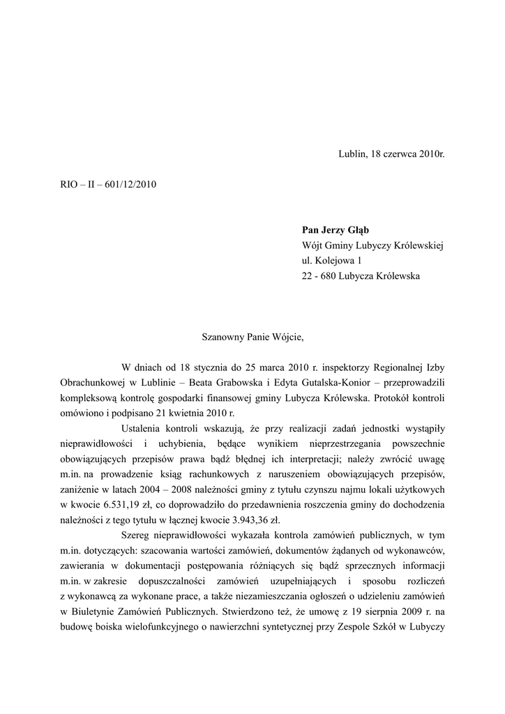 Lublin, 18 czerwca 2010r. RIO – II – 601/12/2010 Pan Jerzy Głąb Wójt Gminy Lubyczy Królewskiej ul. Kolejowa 1 22 - 680 Lubycza Królewska Szanowny Panie Wójcie, W dniach od 18 stycznia do 25 marca 2010 r. inspektorzy Regionalnej Izby Obrachunkowej w Lublinie – Beata Grabowska i Edyta Gutalska-Konior – przeprowadzili kompleksową kontrolę gospodarki finansowej gminy Lubycza Królewska. Protokół kontroli omówiono i podpisano 21 kwietnia 2010 r. Ustalenia kontroli wskazują, że przy realizacji zadań jednostki wystąpiły nieprawidłowości i uchybienia, będące wynikiem nieprzestrzegania powszechnie obowiązujących przepisów prawa bądź błędnej ich interpretacji; należy zwrócić uwagę m.in. na prowadzenie ksiąg rachunkowych z naruszeniem obowiązujących przepisów, zaniżenie w latach 2004 – 2008 należności gminy z tytułu czynszu najmu lokali użytkowych w kwocie 6.531,19 zł, co doprowadziło do przedawnienia roszczenia gminy do dochodzenia należności z tego tytułu w łącznej kwocie 3.943,36 zł. Szereg nieprawidłowości wykazała kontrola zamówień publicznych, w tym m.in. dotyczących: szacowania wartości zamówień, dokumentów żądanych od wykonawców, zawierania w dokumentacji postępowania różniących się bądź sprzecznych informacji m.in. w zakresie dopuszczalności zamówień uzupełniających i sposobu rozliczeń z wykonawcą za wykonane prace, a także niezamieszczania ogłoszeń o udzieleniu zamówień w Biuletynie Zamówień Publicznych. Stwierdzono też, że umowę z 19 sierpnia 2009 r. na budowę boiska wielofunkcyjnego o nawierzchni syntetycznej przy Zespole Szkół w Lubyczy 2 Królewskiej zawarto przed upływem wymaganego terminu, z innym terminem zakończenia robót, niż wskazany w specyfikacji istotnych warunków tego zamówienia i w ofercie wykonawcy oraz mimo tego, że wykonawca przed jej zawarciem wniósł zabezpieczenie należytego wykonania umowy w kwocie mniejszej o 27.574,79zł od wymaganej, przy czym obie strony – niezgodnie z prawdą – potwierdziły w umowie wniesienie zabezpieczenia w wymaganej wysokości. Umową z 17 czerwca 2009r. na termomodernizacja budynku Przedszkola Samorządowego w Lubyczy Królewskiej przekroczono zakres upoważnienia do zaciągania zobowiązań o kwotę 44.879,57 zł. W zakresie nieprawidłowości o incydentalnym charakterze lub wyeliminowanych w trakcie kontroli, po udzieleniu przez kontrolujących stosownego instruktażu – nie formułowano wniosków pokontrolnych. Poniżej podaję stwierdzone nieprawidłowości i uchybienia oraz wnioski, co do sposobu ich wyeliminowania, stosownie do przepisów art. 9 ust. 2 ustawy z dnia 7 października 1992 r. o regionalnych izbach obrachunkowych (Dz. U. z 2001 r. Nr 55, poz. 577 z późn. zm.). W załączniku do wystąpienia pokontrolnego wskazuję osoby odpowiedzialne za stwierdzone nieprawidłowości. 1. W zakresie księgowości i sprawozdawczości: 1.1. Niekompletne i nieprawidłowe opracowanie dokumentacji opisującej przyjęte zasady (politykę) rachunkowości, w wyniku: - nieokreślenia metod wyceny aktywów i pasywów oraz ustalania wyniku finansowego, - ustalenia w zakładowym planie kont możliwości księgowania błędnych zapisów wynikających z dowodu bankowego na koncie 133-1 „sumy do wyjaśnienia” i w konsekwencji księgowanie mylnych wpłat na tym koncie, - niewskazania zasad prowadzenia kont ksiąg pomocniczych do kont księgi głównej budżetu gminy: 222 „Rozliczenie dochodów budżetowych” i 223 „Rozliczenie wydatków budżetowych”. Opracować w sposób prawidłowy i kompletny dokumentację opisującą przyjęte zasady (politykę) rachunkowości, w tym: - określić metody wyceny aktywów i pasywów oraz ustalania wyniku finansowego, - dostosować zasady klasyfikacji zdarzeń dotyczących stwierdzenia błędów w dowodach bankowych do zasad określonych w rozporządzeniu Ministra Finansów z dnia 28 lipca 2006 r. w sprawie szczególnych zasad rachunkowości oraz planów kont dla budżetu państwa, budżetów jednostek samorządu terytorialnego oraz niektórych jednostek sektora finansów publicznych (Dz. U. Nr 142, poz. 1020 3 z późn. zm.), zwanego w dalszej części tego wystąpienia „rozporządzeniem Ministra Finansów z dnia 28 lipca 2006 r.”, obowiązującego do czasu wejścia w życie rozporządzenia Ministra Finansów wydanego na podstawie przepisów art. 40 ust. 4 pkt 1 lit. a ustawy z dnia 27 sierpnia 2009 r. o finansach publicznych (Dz. U. Nr 157, poz. 1240 z późn. zm), zgodnie z przepisami art. 119 ust. 1 ustawy z dnia 27 sierpnia 2009 r. Przepisy wprowadzające ustawę o finansach publicznych (Dz. U. Nr 157, poz. 1241 z późn. zm), mając na uwadze, że w razie stwierdzenia błędu w dowodzie bankowym należy księgować sumy zgodnie z wyciągiem, natomiast różnicę wynikającą z błędu należy odnosić na konto 240, jako „sumy do wyjaśnienia”, - określić zasady prowadzenia kont ksiąg pomocniczych do kont księgi głównej budżetu gminy: 222 „Rozliczenie dochodów budżetowych” i 223 „Rozliczenie wydatków budżetowych” (w sposób umożliwiający ustalenie stanu rozliczeń z poszczególnymi jednostkami budżetowymi, zgodnie z zasadami funkcjonowania tych kont określonymi w załączniku Nr 1 do cytowanego rozporządzenia) oraz ich powiązania z kontami księgi głównej, stosownie do przepisów art. 10 ust. 1 pkt 2 i 3 lit. a ustawy z dnia 29 września 1994 r. o rachunkowości (Dz. U. z 2009 r. Nr 152, poz. 223 z późn. zm.), w związku z § 3 rozporządzenia Ministra Finansów z dnia 28 lipca 2006 r. Aktualizacja dokumentacji opisującej przyjęte zasady rachunkowości należy do obowiązków kierownika jednostki, zgodnie z przepisami art. 10 ust. 2 cytowanej ustawy – str. 8, 10, 109 protokołu. 1.2. Dokonywanie zapisów w dzienniku budżetu i Urzędu Gminy bez wskazania daty zapisu. Zapisów w dzienniku budżetu i w dzienniku Urzędu Gminy dokonywać ze wskazaniem da