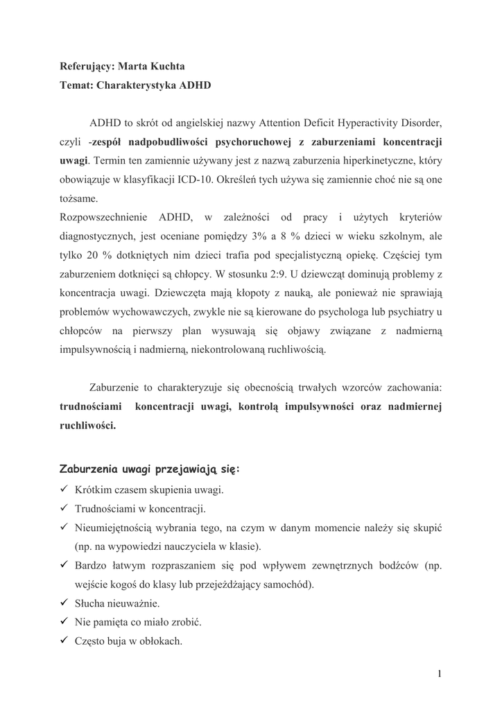 Referujący: Marta Kuchta Temat: Charakterystyka ADHD ADHD to
