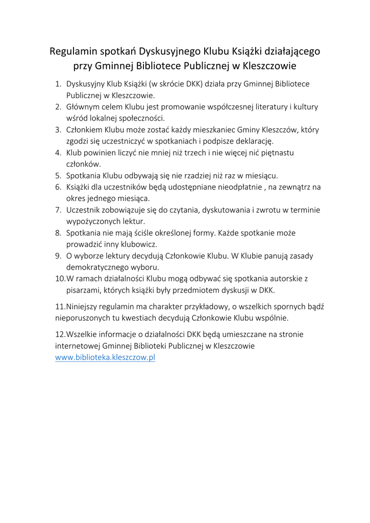 Regulamin spotkań Dyskusyjnego Klubu Książki działającego przy