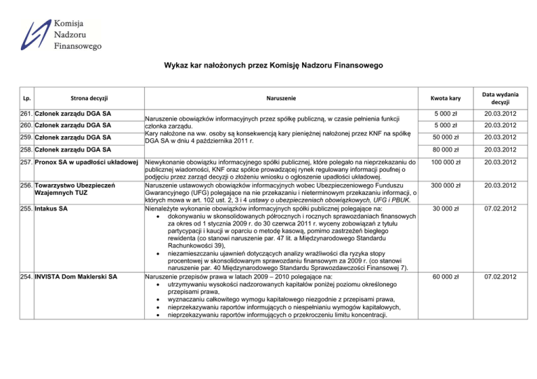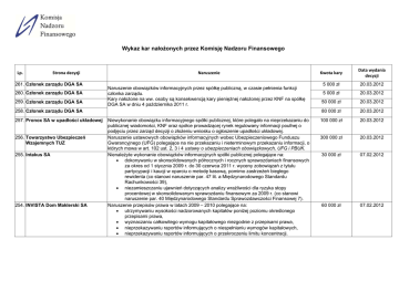 Wykaz kar nałożonych przez Komisję Nadzoru Finansowego Lp. Strona decyzji 261. Członek zarządu DGA SA 260. Członek zarządu DGA SA 259. Członek zarządu DGA SA Naruszenie Naruszenie obowiązków informacyjnych przez spółkę publiczną, w czasie pełnienia funkcji członka zarządu. Kary nałożone na ww. osoby są konsekwencją kary pieniężnej nałożonej przez KNF na spółkę DGA SA w dniu 4 października 2011 r. 258. Członek zarządu DGA SA 257. Pronox SA w upadłości układowej 256. Towarzystwo Ubezpieczeń Wzajemnych TUZ 255. Intakus SA 254. INVISTA Dom Maklerski SA Niewykonanie obowiązku informacyjnego spółki publicznej, które polegało na nieprzekazaniu do publicznej wiadomości, KNF oraz spółce prowadzącej rynek regulowany informacji poufnej o podjęciu przez zarząd decyzji o złożeniu wniosku o ogłoszenie upadłości układowej. Naruszenie ustawowych obowiązków informacyjnych wobec Ubezpieczeniowego Funduszu Gwarancyjnego (UFG) polegające na nie przekazaniu i nieterminowym przekazaniu informacji, o których mowa w art. 102 ust. 2, 3 i 4 ustawy o ubezpieczeniach obowiązkowych, UFG i PBUK. Nienależyte wykonanie obowiązków informacyjnych spółki publicznej polegające na: dokonywaniu w skonsolidowanych półrocznych i rocznych sprawozdaniach finansowych za okres od 1 stycznia 2009 r. do 30 czerwca 2011 r. wyceny zobowiązań z tytułu partycypacji i kaucji w oparciu o metodę kasową, pomimo zastrzeżeń biegłego rewidenta (co stanowi naruszenie par. 47 lit. a Międzynarodowego Standardu Rachunkowości 39), niezamieszczaniu ujawnień dotyczących analizy wrażliwości dla ryzyka stopy procentowej w skonsolidowanym sprawozdaniu finansowym za 2009 r. (co stanowi naruszenie par. 40 Międzynarodowego Standardu Sprawozdawczości Finansowej 7). Naruszenie przepisów prawa w latach 2009 – 2010 polegające na: utrzymywaniu wysokości nadzorowanych kapitałów poniżej poziomu określonego przepisami prawa, wyznaczaniu całkowitego wymogu kapitałowego niezgodnie z przepisami prawa, nieprzekazywaniu raportów informujących o niespełnianiu wymogów kapitałowych, nieprzekazywaniu raportów informujących o przekroczeniu limitu koncentracji. Kwota kary Data wydania decyzji 5 000 zł 20.03.2012 5 000 zł 20.03.2012 50 000 zł 20.03.2012 80 000 zł 20.03.2012 100 000 zł 20.03.2012 300 000 zł 20.03.2012 30 000 zł 07.02.2012 60 000 zł 07.02.2012 253. X – Trade Brokers Dom Maklerski SA Naruszenie art. 105 ust. 1 pkt 3 ustawy o obrocie instrumentami finansowymi, poprzez stosowanie w okresie od grudnia 2009 r. do czerwca 2011 r. współczynników delta obliczonych za pomocą własnych modeli wyceny opcji bez uzyskania zgody KNF. 252. Thabino Holdings Limited z Cypru 1. Niepowiadomienie w ustawowym terminie KNF o przekroczeniu progu 25% liczby głosów Polrest SA w czerwcu 2010 r. (akcjonariusz spółki publicznej 2. Niewskazanie w zawiadomieniu o przekroczeniu progu 25% liczby głosów Polrest SA Polrest) skierowanym do KNF informacji dotyczących zamiarów dalszego zwiększania udziału w ogólnej liczbie głosów w okresie 12 miesięcy od złożenia zawiadomienia oraz celu zwiększania tego udziału. 3. Niepowiadomienie w ustawowym terminie KNF o zmianie zamiaru dalszego zwiększania stanu posiadania akcji Polrest SA, która nastąpiła w związku z niemożliwością zawarcia umowy przyrzeczonej sprzedaży akcji Polrest SA. 4. Nieprzeprowadzenie wezwania do zapisywania się na sprzedaż lub zamianę akcji Polrest SA w liczbie nie mniejszej niż 10% liczby głosów, w związku z nabyciem w czerwcu 2010 r. akcji stanowiących więcej niż 10% liczby głosów w okresie krótszym niż 60 dni. 251. Osoba fizyczna Nieprzekazanie raportu podmiotu uprawnionego do badania sprawozdań finansowych z przeglądu półrocznego skróconego sprawozdania finansowego wraz z raportem okresowym za I prezes zarządu Zakładów półrocze 2009 r. oraz opinii podmiotu uprawnionego do badania sprawozdań finansowych o Lniarskich „Orzeł” SA badanym rocznym sprawozdaniu finansowym oraz raportu podmiotu uprawnionego do badania sprawozdań finansowych z badania rocznego sprawozdania finansowego wraz z raportem okresowym za rok 2009 250. Osoba fizyczna Nieprzekazanie opinii podmiotu uprawnionego do badania sprawozdań finansowych o badanym były wiceprezes zarządu Zakładów rocznym sprawozdaniu finansowym oraz raportu podmiotu uprawnionego do badania sprawozdań finansowych z badania rocznego sprawozdania finansowego wraz z raportem Lniarskich „Orzeł” SA okresowym za rok 2009 249. Osoba fizyczna Nieprzekazanie raportu podmiotu uprawnionego do badania sprawozdań finansowych z były wiceprezes zarządu Zakładów przeglądu półrocznego skróconego sprawozdania finansowego wraz z raportem okresowym za I półrocze 2009 r. Lniarskich „Orzeł” SA 248. Osoba fizyczna Dwudziestodwukrotne naruszenie obowiązków informacyjnych związanych ze znacznymi pakietami akcji spółek publicznych One–2–One SA, Procad SA i PTS Plast – Box SA, akcjonariusz spółek publicznych polegające na niezawiadomieniu w ustawowym terminie spółki i KNF o zmianach łącznego 247. Osoba fizyczna udziału w ogólnej liczbie głosów w ww. spółkach w okresie listopad 2008 r. – wrzesień 2010 r.: akcjonariusz spółek publicznych pięciu przypadkach zwiększenia/ zmniejszenia łącznego udziału powyżej 5 %, pięciu przypadkach zwiększenia/ zmniejszenia łącznego udziału powyżej 10 %, pięciu przypadkach zwiększenia/ zmniejszenia łącznego udziału powyżej 15 % , siedmiu przypadkach zwiększenia/ zmniejszenia dotychczas posiadanego łącznego udziału ponad 10 % ogólnej liczby głosów o co najmniej 2 %. 246. Cyproman Services Limited z Cypru Niepowiadomienie w ustawowym terminie o pośrednim przekroczeniu progu 5% i 10% liczby głosów na walnym zgromadzeniu spółki publicznej Atlas Estates Limited w wyniku rozrachunku (akcjonariusz spółki publicznej transakcji zawartych w cz