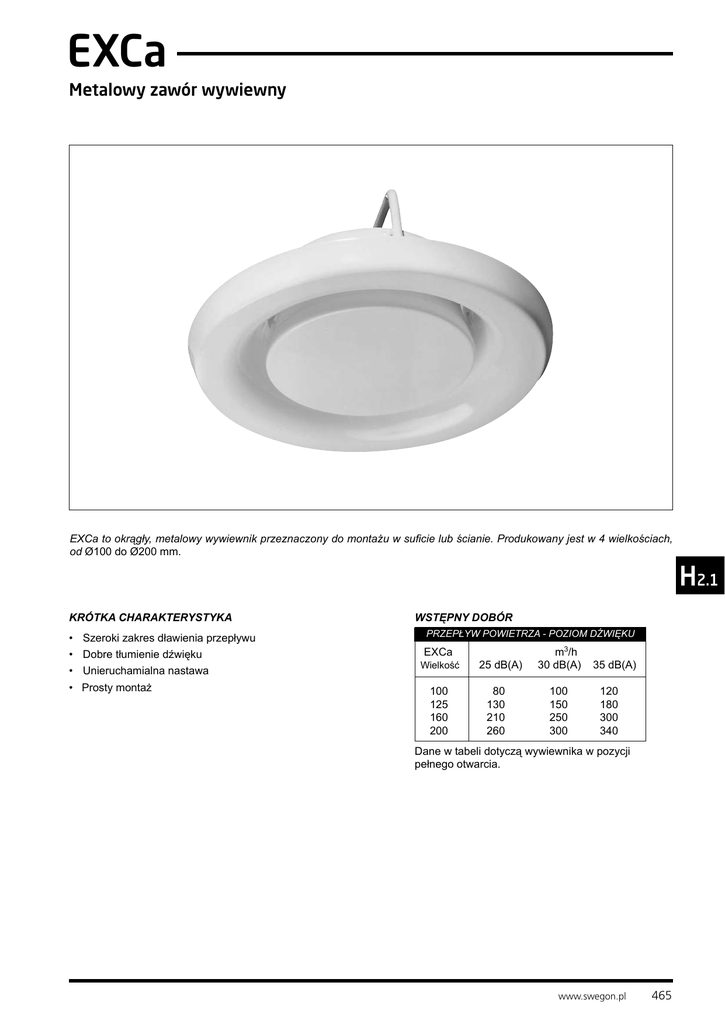 EXCa Metalowy zawór wywiewny EXCa to okrągły, metalowy wywiewnik przeznaczony do montażu w suficie lub ścianie. Produkowany jest w 4 wielkościach, od Ø100 do Ø200 mm. WSTĘPNY DOBÓR KRÓTKA CHARAKTERYSTYKA • Szeroki zakres dławienia przepływu • Dobre tłumienie dźwięku • Unieruchamialna nastawa • Prosty montaż PRZEPŁYW POWIETRZA - POZIOM DŹWIĘKU EXCa Wielkość 100 125 160 200 25 dB(A) 80 130 210 260 m3/h 30 dB(A) 35 dB(A) 100 150 250 300 120 180 300 340 Dane w tabeli dotyczą wywiewnika w pozycji pełnego otwarcia. www.swegon.pl 465 H2.1 EXCa KONSTRUKCJA Wywiewnik składa się z trzech części: zewnętrznego i wewnętrznego stożka oraz ramki mocujacej. Ramka mocująca posiada rękaw przyłączeniowy do podłączenia kanału oraz gniazdo bagnetowe dla przyłączenia stożka. Aerodynamicznie wyprofilowany stożek zewnętrzny posiada taśmę uszczelniającą, która może być połączona z ramką mocującą. Stożek wewnętrzny, który jest zamocowany na nagwintowanym pręcie w stożku zewnętrznym, posiada możliwość regulacji położenia oraz jego unieruchomienia. Rysunek 1 MATERIAŁY I WYKOŃCZENIE POWIERZCHNI Stożki wywiewnika i ramka mocująca wykonane są z blachy stalowej, ocynkowanej. Wywiewnik standardowo pomalowany jest na kolor biały RAL 9010. Istnieją również inne standardowe kolory: ciemnoszary RAL 7037, jasnoszary metalik RAL 9006 i czarny RAL 9005. WYKONANIE SPECJALNE Wywiewniki mogą być pomalowane na dowolny kolor z palety RAL. Wywiewniki mogą być wykonane z blachy nierdzewnej. Rysunek 2 WYPOSAŻENIE DODATKOWE Ramka mocująca EXCT 2 Ramka mocująca z uszczelką gumową. Ramka mocująca EXCT 3 Ramka mocująca stożkowa. Ramka ma większą średnicę wewnętrzną niż zewnętrzna średnica elementu kanału, do którego będzie podłączona np. bezpośrednio do kolanka. INSTALACJA (Patrz: Rysunek 1) Obręcz mocującą należy umieścić w otworze o wymiarach kanału podłączeniowego. Wywiewnik wkręca się w gniazdo bagnetowe w ramce mocującej. REGULACJA WYWIEWNIKA (Patrz: Rysunek 2) Poprzez obrót stożka wewnętrznego zgodnie z ruchem wskazówek zegara zwiększa się spadek ciśnienia, a poprzez obrót stożka wewnętrznego przeciwnie do ruchu wskazówek zegara zmniejsza się spadek ciśnienia. Więcej o regulacji i współczynniku k - patrz rozdział Regulacja nawiewników. Wywiewnik regulowany jest w czasie pomiaru przepływu powietrza w systemie. Pomiary odbywają się przyrządami pomiarowymi wg rysunku 3. Dwa ekstremalne położenia stożka pokazane są na rys. 2. MONTAŻ Ramkę mocującą wywiewnika montuje się w kanale spiro przytwierdzając ją nitami zrywalnymi do kanału. Wywiewnik wkręca się w ramkę mocującą. KONSERWACJA W razie konieczności można wyczyścić wywiewnik przy użyciu letniej wody i detergentów lub za pomocą odkurzacza ze szczotką na końcówce. DANE TECHNICZNE • Poziom dźwięku dB(A) odpowiada pomieszczeniu o chłonności akustycznej 10 m2 Sabine. • Ustawienia zerowe stożka wewnętrznego wg rys. 2. • Dane dotyczą wywiewnika EXCa + EXCT 2 466 www.swegon.pl Rysunek 3 EXCa Dane akustyczne - EXCa dla położenia stożka w pozycji 0 mm Poziom mocy akustycznej Lw(dB) Współczynnik KOK Wielkość EXCa Tłumienie dźwięku ∆L (dB) Współczynnik ∆L Wielkość Częstotliwość środkowa pasma, Hz 125 250 500 1000 2000 4000 8000 100 125 160 200 -4 -2 0 -1 -6 -1 -2 -6 -5 -2 -1 -6 -1 -3 0 -2 -1 0 -5 -6 -9 -10 -7 -10 -12 -11 -11 -15 Tol. ± 3 2 2 2 2 2 3 EXCa Częstotliwość środkowa pasma, Hz 63 125 250 500 1000 2000 4000 8000 100 125 160 200 23 21 19 15 18 14 12 17 12 11 14 12 11 13 11 11 12 12 11 13 14 11 14 12 5 7 5 7 6 6 7 7 Tol. ± 6 3 2 2 2 3 2 2 Wywiewnik EXCa - wyciąg Przepływ - Spadek ciśnienia - Poziom dźwięku • Charakterystyk nie można wykorzystywać do regulacji wywiewników. • Dane dla różnych pozycji stożka wewnętrznego w stosunku do stożka zewnętrznego, w mm. • Wartość dB(A) dotyczy pomieszczeń o chłonności akustycznej 4 dB i kubaturze 30 m3. • Wartość dB(C) jest zwykle wyższa o 6-9 dB niż wartość dB(A). EXCa EXCa 100100 EXCa EXCa 125125 wielkość otwarcia Δpt Pa 500 400 300 t 200 -15 -12 -10 -5 0 40 dB(A) +5 35 0 +1 30 25 100 1000 wielkość otwarcia Δpt Pa 0 25 30 100 50 40 30 H2.1 50 40 30 20 5 10 20 30 20 40 30 50 20 10 40 l/s 50 1000 wielkość otwarcia -10 -5 0 t +5 0 +1 5 1 + 40 dB(A) 35 200 1000 Δpt Pa 40 100 50 l/s 200 100 m /h 3 -3 +5 0 20 0 +2 5 +2 40 dB(A) 35 30 25 100 20 50 40 30 20 50 40 30 20 30 100 40 50 20 100 l/s 200 300 400 m /h 3 0 +1 5 +1 200 25 wielkość otwarcia t 500 400 300 30 100 50 30 EXCa EXCa 200200 Δpt Pa 500 400 300 20 40 100 m /h 3 EXCa EXCa 160160 +5 40 dB(A) 35 20 10 -5 0 +1 500 400 300 200 20 -10 t 20 30 100 40 50 100 l/s 200 300 400 m3 /h www.swegon.pl 467 EXCa WYMIARY I CIĘŻAR Rysunek 4. Wywiewnik EXC EXCa Wielkość EXCa 100 125 160 200 A B ØD kg 70 85 85 108 16 16 16 16 142 173 205 252 0.265 0.350 0.475 0.700 Ramka mocująca EXCT 2 Rysunek 5. Ramka mocująca EXCT 2 - z uszczelką gumową Wielkość ØD H kg 100 125 160 200 98 123 158 198 50 50 50 50 0.100 0.125 0.190 0.240 EXCa 2 Rysunek 6. Ramka mocująca EXCT 3 - do montażu bezpośrednio na kolanku kanału spiro Ramka mocująca EXCT 3 Wielkość ØD H kg 100 125 160 200 102 127 162 202 55 55 55 55 0.100 0.125 0.190 0.240 EXCa 3 SPECYFIKACJA Produkt Okrągły wywiewnik z ramką mocującą EXCa -aaa Wielkość: 100, 125, 160, 200 Ramka mocująca z uszczelką Ramka mocująca do podłączenia np. kolanka kanału spiro EXCT 2 EXCT 3 Ramkę mocującą należy dobrać dla jednej z alternatyw 1, 2 lub 3. 468 www.swegon.pl Dodatkowych informacji technicznych nie zawartych w tym katalogu udzielają biura techniczno-handlowe Swegon.