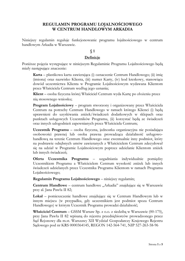 REGULAMIN PROGRAMU LOJALNOŚCIOWEGO W CENTRUM HANDLOWYM ARKADIA Niniejszy regulamin reguluje funkcjonowanie programu lojalnościowego w centrum handlowym Arkadia w Warszawie. §1 Definicje Poniższe pojęcia występujące w niniejszym Regulaminie Programu Lojalnościowego będą miały następujące znaczenie: Karta – plastikowa karta zawierająca (i) oznaczenie Centrum Handlowego; (ii) imię (imiona) oraz nazwisko Klienta, (iii) numer Karty, (iv) kod kreskowy, stanowiąca dowód uczestnictwa Klienta w Programie Lojalnościowym wydawana Klientom przez Właściciela Centrum według jego uznania; Klient – osoba fizyczna której Właściciel Centrum wyda Kartę po złożeniu przez nią stosownego wniosku; Program Lojalnościowy – program stworzony i organizowany przez Właściciela Centrum na potrzeby Centrum Handlowego w ramach którego Klienci (i) będą uprawnieni do uzyskiwania zniżek/świadczeń dodatkowych w sklepach oraz punktach usługowych Uczestników Programu, (ii) korzystać będą ze świadczeń oraz innych udogodnień zapewnianych przez Właściciela Centrum; Uczestnik Programu – osoba fizyczna, jednostka organizacyjna nie posiadająca osobowości prawnej lub osoba prawna prowadząca działalność usługowohandlową na terenie Centrum Handlowego oraz ewentualnie inny podmiot, który na podstawie odrębnych umów zawieranych z Właścicielem Centrum zdecydował się na udział w Programie Lojalnościowym poprzez udzielanie Klientom zniżek lub innych świadczeń; Oferta Uczestnika Programu – uzgadniania indywidualnie pomiędzy Uczestnikiem Programu a Właścicielem Centrum wysokość zniżek lub innych świadczeń udzielanych przez Uczestnika Programu Klientom w ramach Programu Lojalnościowego; Regulamin Programu Lojalnościowego – niniejszy regulamin; Centrum Handlowe – centrum handlowe „Arkadia” znajdujące się w Warszawie przy al. Jana Pawła II 82; Lokal – pomieszczenie handlowe znajdujące się w Centrum Handlowym lub w innym miejscu (w przypadku, gdy uczestnikiem jest podmiot spoza Centrum Handlowego) w którym Uczestnik Programu prowadzi działalność; Właściciel Centrum – GSSM Warsaw Sp. z o.o. z siedzibą w Warszawie (00-175), przy Jana Pawła II 82 wpisaną do rejestru przedsiębiorców prowadzonego przez Sąd Rejonowy dla m.st. Warszawy XII Wydział Gospodarczy Krajowego Rejestru Sądowego pod nr KRS 0000364145, REGON 142-564-741, NIP 527-263-58-96 Strona 1 z 5 Koordynator – Expansja Advertinsing Sp. z o.o. z siedzibą w Poznaniu, przy ul. Kordeckiego 47 (kod pocztowy 60-144), wpisana do rejestru przedsiębiorców prowadzonego przez Sąd Rejonowy Poznań – Nowe Miasto i Wilda w Poznaniu, VIII Wydział Gospodarczy Krajowego Rejestru Sądowego pod numerem KRS 0000287294, kapitał zakładowy 1.100.000,00 złotych, NIP 7811808030. § 2. Klient 1. 2. 3. 4. 5. 6. 7. 8. 9. W Programie Lojalnościowym może wziąć udział w charakterze Klienta osoba fizyczna, która ukończyła 18 lat w chwili składania wniosku o wydanie Karty. Za zgodą przedstawiciela ustawowego w Programie Lojalnościowym może wziąć udział także osoba fizyczna, która ukończyła 13 lat w chwili składania wniosku o wydanie Karty. Celem wzięcia udziału w Programie Lojalnościowym osoba, o której mowa w ustępie poprzedzającym, musi złożyć wniosek o wydanie Karty. Wzór wniosku jest ustalany przez Właściciela Centrum a jego ewentualna zmiana w trakcie obowiązywania Programu Lojalnościowego nie stanowi zmiany Regulaminu Programu Lojalnościowego. Wniosek można złożyć poprzez: a. wypełnienie formularza wniosku dostępnego na stronie internetowej Centrum Handlowego www.arkadia.com.pl b. wypełnienie wydrukowanego formularza wniosku dostępnego w Recepcji Centrum Handlowego. Warunkiem wydania Karty jest prawidłowe i kompletne wypełnienie wniosku. W przypadku składania wniosku za pomocą strony internetowej Centrum Handlowego Kartę można odebrać osobiście w Recepcji Centrum Handlowego w ciągu 60 dni od momentu złożenia wniosku. Po tym terminie Karta może zostać wysłana listem za pośrednictwem Poczty Polskiej na adres zamieszkania Klienta, wskazany w formularzu zgłoszenia, w terminie do 30 dni od momentu otrzymania prośby od Klienta. Prośba musi być złożona do Koordynatora w terminie maksymalnie do 90 dni od momentu wysłania zgłoszenia poprzez stronę internetową Centrum Handlowego za pomocą adresu e-mail: [email protected] lub przesłana drogą pocztową na adres Koordynatora z dopiskiem „Karta Stałego Klienta”. W przypadku składania wniosku w Recepcji Centrum Handlowego Karta zostanie wydana niezwłocznie po złożeniu wniosku. Karta jest kartą imienną i może być używana wyłącznie przez Klienta, na którego imię i nazwisko została wystawiona. W trakcie obowiązywania Programu Lojalnościowego Właściciel Centrum może zmieniać wygląd Karty oraz jej funkcjonalności (np. zaopatrzenie jej w chip lub pasek magnetyczny). W takim przypadku Właściciel Centrum poinformuje o tym fakcie Klientów i wyznaczy im termin do wymiany Karty, nie krótszy niż 60 dni. Warunkiem udzielenia zniżki/świadczeń dodatkowych jest (i) posiadanie przez Klienta Karty opatrzonej jego imieniem i nazwiskiem; (ii) okazanie jej osobie przyjmującej zapłatę w imieniu Uczestnika Programu. Zniżka/świadczenie dodatkowe przysługuje Klientowi wyłącznie w przypadku dokonywania zakupów/świadczenia usług bezpośrednio w Lokalu. Strona 2 z 5 10. 11. 12. 13. 14. 15. 16. Uczestnik Programu ma prawo odmówić udzielenia zniżki/świadczenia dodatkowego jeżeli osoba występująca o udzielenie zniżki/świadczenia dodatkowego (i) nie posiada Karty, (ii) okazuję Kartę należącą do innej osoby. O każdym takim przypadku należy poinformować dyrekcję Centrum Handlowego. Zniżka/świadczenia dodatkowe udzielane przez Uczestnika Programu w ramach Programu Lojalnościowego nie podlegają łączeniu z innymi promocjami oferowanymi przez Uczestnik