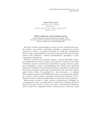 POSTSCRIPTUM POLONISTYCZNE, 2012 • 2 (10) ISSN 1898-1593 MARIA WACŁAWEK Uniwersytet Śląski Katowice Uniwersytet im. Lajosa Kossutha Debreczyn Przez zabawę uczyć polszczyzny Achtelik Aleksandra, Niesporek-Szamburska Bernadeta, 2009, Bawimy się w polski 1. Podręcznik do nauki języka polskiego dla dzieci, Katowice: Śląskie Centrum Edukacji Regionalnej. Już same nazwiska wprowadzające tę nową na rynku wydawniczym pozycję świadczą o jej wartości. Aleksandra Achtelik to współautorka znanych, cenionych w Polsce i za granicą materiałów do nauki jpjo (podręcznika, zbioru zadań), współredaktorka tomów przeznaczonych dla nauczycieli jpjo, autorka wielu artykułów z zakresu glottodydaktyki, specjalistka w pracy z grupami początkującymi. Podobnie wymowne jest nazwisko drugiej z autorek. Bernadeta Niesporek-Szamburska od wielu lat zajmuje się językowym obrazem świata dzieci i młodzieży, językową twórczością użytkowników tej grupy wiekowej, aspektami komunikacji w szkole i glottodydaktyką. Jest autorką wielu opracowań naukowych z dydaktyki nauczania języka polskiego i materiałów metodycznych dotyczących kształcenia językowego, przeznaczonych dla nauczycieli różnych typów szkół w Polsce. Uczestniczyła też – jako wykonawca – w realizacji kilku projektów badawczych MNiSW dotyczących nauczania języka polskiego w szkole, między innymi w projekcie poświęconym badaniom nad komunikatywnością i funkcjami podręczników do nauczania języka polskiego. Recenzowana pozycja to pakiet pomocy dydaktycznych składający się z następujących części: 1) podręcznika do nauki języka polskiego dla dzieci (baza); 2) zeszytu ćwiczeń; 3) klucza do zadań z komentarzem dydaktycznym; 4) 2 płyt CD z nagraniami tekstów i piosenek. Jest to pierwszy z cyklu 398 POSTSCRIPTUM POLONISTYCZNE, 2012 • 2 (10) trzech podręczników (wraz z obudową) dla odbiorcy dziecięcego i młodzieżowego (w wieku 8–12 lat), uczącego się języka polskiego poza granicami Polski (jako języka pierwszego lub drugiego), przede wszystkim pochodzącego z rodzin polonijnych o kompetencjach językowych zbliżonych do poziomu A1. Na rynku wydawniczym mało jest pozycji skierowanych do odbiorców właśnie w tym przedziale wiekowym1. Dlatego Bawimy się w polski 1 jest opracowaniem ważnym, które dobrze wypełnia lukę wydawniczą, spełnia oczekiwania wciąż mało docenianej, choć liczebnie znaczącej grupy adresatów. Bliższa analiza zawartości treści, doboru i rozkładu materiału recenzowanego cyklu potwierdza wstępną, pozytywną ocenę. Zadania, typy ćwiczeń, tematyka dostosowane są do wieku i zainteresowań potencjalnych odbiorców. Materiał został tak pogrupowany, by powoli, systematycznie (spiralnie) wzrastał, co zdecydowanie ułatwia i usprawnia proces uczenia się. Podręcznik ma przemyślaną kompozycję, zamyka się w 20 rozdziałach: 15 z nich to jednostki edukacyjne, 3 to jednostki o charakterze powtórzeniowym, w podręczniku znajduje się także jednostka podsumowująca oraz test końcowy, przygotowujący uczniów do egzaminów z zadaniami certyfikacyjnymi. Każda jednostka ma podobną budowę, co również służy systematyzacji i zapamiętywaniu materiału. Tworzą ją cztery części: a) ilustracja prezentująca słownictwo i zarysowaną sytuację komunikacyjną, której towarzyszy nagranie na płycie CD oraz ćwiczenie służące do zapamiętania poznawanego słownictwa, b) komiks z nagraniem, c) ćwiczenia – najczęściej związane z aktywnością tekstotwórczą, d) wiersze lub piosenki polskie z repertuaru przeznaczonego dla dzieci (wraz z nagraniem na CD), czasem powtórzenie i utrwalenie materiału – w formie różnorodnych quizów; ćwiczenia wymowy, niekiedy też sugestie dotyczące lektur właściwych wiekowi odbiorcy. Jednostki mogą być omawiane po kolei2, co jest konsekwencją przyjętej spiralnej budowy, narastania materiału, zwłaszcza gramatycznego, ćwiczeń powtórzeniowych, a także fabuły. Autorki (w komentarzu dydaktycznym, dołączonym wraz z kluczem do cyklu) słusznie założyły, że każdy rozdział Warte uwagi są m.in.: Mikielewicz, Weislo 2003; Rabiej 2009; taż 2010; także seria podręczników i pomocy dydaktycznych firmowanych przez Małgorzatę Pawlusiewicz, materiały z zakresu muzyki i tańca autorstwa Magdaleny Szelc-Mays oraz publikacje Liliany Madelskiej dotyczące trudnej sztuki wymowy. Znaczna ich część jest jednak przeznaczona dla dzieci młodszych lub o innych kompetencjach językowych. 2 Nie ma jednak takiego przymusu, można je (jednostki) wybierać ze względu na konkretne potrzeby odbiorców. 1 MARIA WACŁAWEK: Przez zabawę uczyć polszczyzny 399 powinien być zrealizowany podczas trzech jednostek lekcyjnych (135 min.), przyznając zarazem, że właściwie rozłożenie materiału (wydłużenie lub skrócenie przewidywanego czasu) zależy od decyzji nauczyciela i możliwości uczących się. Bawimy się w język polski 1 wydaje się uniwersalny – stanowi samodzielny podręcznik kursowy lub – jak podkreślają same autorki – „może też służyć jako uzupełnienie – pomoc w doskonaleniu kompetencji w zakresie znajomości języka polskiego – dla dzieci uczących się za granicą według programów polskich, dla których realizacja materiału okazuje się za trudna” (s. 3). Tematyka przedstawiona za pomocą historyjek komiksowych nawiązuje do autentycznych, typowych sytuacji komunikacyjnych związanych z dzieciństwem i wczesną adolescencją (w domu, w sklepie, podczas zabawy, na dyskotece, w czasie uprawiania sportu). Autorki odwołują się z jednej strony do ważnych, uniwersalnych, bliskich młodym kręgów tematycznych, z drugiej zaś – typowo polskich elementów socjokulturowych, przybliżają polską tradycję, święta, zwyczaje (w pierwszej części cyklu pojawiają się m.in. andrzejki, piosenki dziecięce i ludowe). Wprowadza się – właściwe również młody