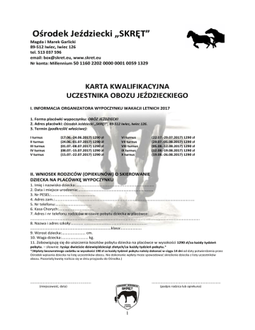 Ośrodek Jeździecki „SKRĘT” Magda i Marek Garlicki 89-512 Iwiec, Iwiec 126 tel. 513 037 596 email: [email protected], www.skret.eu Nr konta: Millennium 50 1160 2202 0000 0001 0059 1329 KARTA KWALIFIKACYJNA UCZESTNIKA OBOZU JEŹDZIECKIEGO I. INFORMACJA ORGANIZATORA WYPOCZYNKU WAKACJI LETNICH 2017 1. Forma placówki wypoczynku: OBÓZ JEŹDZIECKI 2. Adres placówki: Ośrodek Jeździecki „SKRĘT”, 89-512 Iwiec, Iwiec 126. 3. Termin (podkreślić właściwe): I turnus II turnus III turnus IV turnus V turnus (17.06.-24.06.2017) 1290 zł (24.06.-01.07.2017) 1290 zł (01.07.-08.07.2017) 1290 zł (08.07.-15.07.2017) 1290 zł (15.07.-22.07.2017) 1290 zł VI turnus VII turnus VIII turnus IX turnus X turnus (22.07.-29.07.2017) 1290 zł (29.07.-05.08.2017) 1290 zł (05.08.-12.08.2017) 1290 zł (12.08.-19.08.2017) 1290 zł (19.08.-26.08.2017) 1290 zł II. WNIOSEK RODZICÓW (OPIEKUNÓW) O SKIEROWANIE DZIECKA NA PLACÓWKĘ WYPOCZYNKU 1. Imię i nazwisko dziecka:…………………………………………..……………………….. 2. Data i miejsce urodzenia:……………………………………….………………………… 3. Nr PESEL:……………………………………… 4. Adres zam.:……….………….……………….…………………………………………………………………………………...... 5. Nr telefonu:……………………………... 6. Kasa Chorych:……………..……………… 7. Adres i nr telefonu rodziców w czasie pobytu dziecka w placówce: ………………………………………………………………………………………………………………………………………………………. 8. Nazwa i adres szkoły:………… ………………………………………………………. ……………………………………………………………………….klasa:………………… 9. Wzrost dziecka:…………………… cm. 10. Waga dziecka:……………………… kg. 11. Zobowiązuję się do uiszczenia kosztów pobytu dziecka na placówce w wysokości 1290 zł/za każdy tydzień pobytu. – słownie: tysiąc dwieście dziewięćdziesiąt złotych/za każdy tydzień pobytu.* *(Wpłaty bezzwrotnego zadatku w wysokości 190 zł za każdy tydzień pobytu należy dokonać w ciągu 14 dni od daty potwierdzenia przez Ośrodek wpisania dziecka na listę uczestników obozu. Nie dokonanie wpłaty może spowodować skreślenie dziecka z listy uczestników obozu. Pozostałą kwotę rozlicza się w dniu przyjazdu do Ośrodka.) …………………………............................. ……………………………….…………………………… (miejscowość, data) (podpis rodzica lub opiekuna) 1 III. INFORMACJA RODZICÓW (OPIEKUNÓW) O STANIE ZDROWIA DZIECKA – DZIECKO MUSI MIEĆ ZE SOBĄ KASIĄŻECZKĘ ZDROWIA. (np. na co dziecko jest uczulone, jak znosi jazdę samochodem, czy przyjmuje stale leki i w jakich dawkach, czy nosi aparat ortodontyczny, okulary itd.) …………………………………………………………………………………………………………………………………………………………………………… …………………………………………………………………………………………………………………………………………………………………………… …………………………………………………………………………………………………………………………………………………………………………… …………………………………………………………………………………………………………………………………………………………………………… Stwierdzam, że podałem(łam) wszystkie znane mi informacje o dziecku, które mogą pomóc w zapewnieniu właściwej opieki w czasie pobytu dziecka na placówce wypoczynku. …………………………............................. ……………………………….…………………………… (miejscowość, data) (podpis rodzica lub opiekuna) IV. INFORMACJA PIELĘGNIARKI O SZCZEPIENIACH LUB PRZEDSTAWIENIE KSIĄŻECZKI ZDROWIA Z AKTUALNYM WPISEM SZCZEPIEŃ Szczepienia ochronne (podać rok): tężec:…………, błonnica:…………, dur:………… Inne:……………………………………………………………………………………………. …………………………............................. ……………………………….…………………………… (miejscowość, data) (podpis pielęgniarki) V. INFORMACJA O DZIECKU WYCHOWAWCY KLASY (w przypadku braku możliwości uzyskania opinii wychowawcy klasy – wypełnia rodzic lub opiekun) …………………………………………………………………………………………………………………………………………………………………………… …………………………………………………………………………………………………………………………………………………………………………… …………………………………………………………………………………………………………………………………………………………………………… …………………………………………………………………………………………………………………………………………………………………………… …………………………............................. ……………………………….…………………………… (miejscowość, data) (podpis wychowawcy lub rodzica-opiekuna) VI. DECYZJA O KWALIFIKACJI UCZESTNIKA Postanawia się: 1. Zakwalifikować i skierować dziecko do udziału w obozie za odpłatnością …………… zł Słownie:……………………………