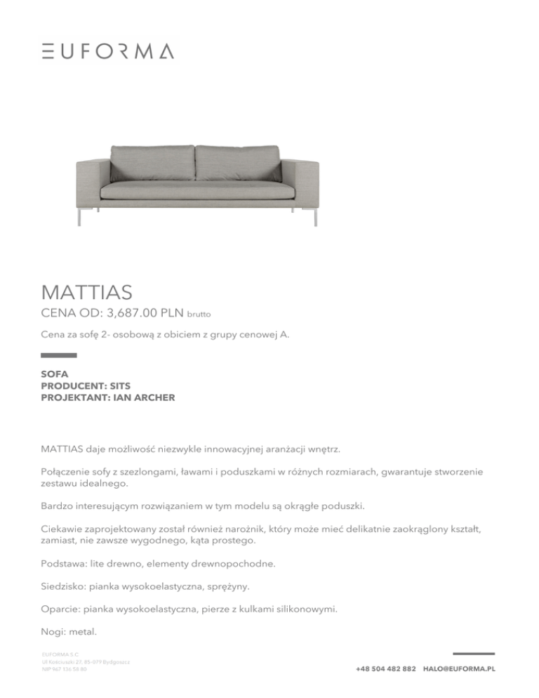 MATTIAS CENA OD: 3,687.00 PLN brutto Cena za sofę 2- osobową z obiciem z grupy cenowej A. SOFA PRODUCENT: SITS PROJEKTANT: IAN ARCHER MATTIAS daje możliwość niezwykle innowacyjnej aranżacji wnętrz. Połączenie sofy z szezlongami, ławami i poduszkami w różnych rozmiarach, gwarantuje stworzenie zestawu idealnego. Bardzo interesującym rozwiązaniem w tym modelu są okrągłe poduszki. Ciekawie zaprojektowany został również narożnik, który może mieć delikatnie zaokrąglony kształt, zamiast, nie zawsze wygodnego, kąta prostego. Podstawa: lite drewno, elementy drewnopochodne. Siedzisko: pianka wysokoelastyczna, sprężyny. Oparcie: pianka wysokoelastyczna, pierze z kulkami silikonowymi. Nogi: metal. Obicie: szeroki wybór tkanin. Powered by TCPDF (www.tcpdf.org)