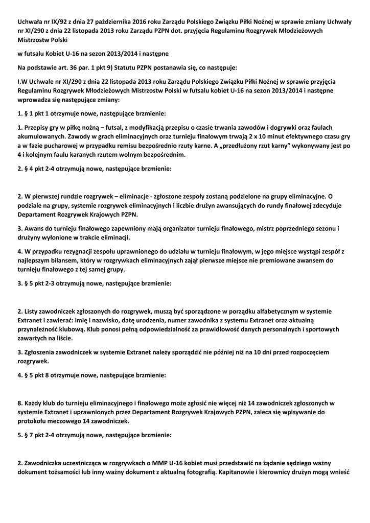 Uchwała nr IX/92 z dnia 27 października 2016 roku Zarządu Polskiego Związku Piłki Nożnej w sprawie zmiany Uchwały nr XI/290 z dnia 22 listopada 2013 roku Zarządu PZPN dot. przyjęcia Regulaminu Rozgrywek Młodzieżowych Mistrzostw Polski w futsalu Kobiet U-16 na sezon 2013/2014 i następne Na podstawie art. 36 par. 1 pkt 9) Statutu PZPN postanawia się, co następuje: I.W Uchwale nr XI/290 z dnia 22 listopada 2013 roku Zarządu Polskiego Związku Piłki Nożnej w sprawie przyjęcia Regulaminu Rozgrywek Młodzieżowych Mistrzostw Polski w futsalu kobiet U-16 na sezon 2013/2014 i następne wprowadza się następujące zmiany: 1. § 1 pkt 1 otrzymuje nowe, następujące brzmienie: 1. Przepisy gry w piłkę nożną – futsal, z modyfikacją przepisu o czasie trwania zawodów i dogrywki oraz faulach akumulowanych. Zawody w grach eliminacyjnych oraz turnieju finałowym trwają 2 x 10 minut efektywnego czasu gry a w fazie pucharowej w przypadku remisu bezpośrednio rzuty karne. A „przedłużony rzut karny” wykonywany jest po 4 i kolejnym faulu karanych rzutem wolnym bezpośrednim. 2. § 4 pkt 2-4 otrzymują nowe, następujące brzmienie: 2. W pierwszej rundzie rozgrywek – eliminacje - zgłoszone zespoły zostaną podzielone na grupy eliminacyjne. O podziale na grupy, systemie rozgrywek eliminacyjnych i liczbie drużyn awansujących do rundy finałowej zdecyduje Departament Rozgrywek Krajowych PZPN. 3. Awans do turnieju finałowego zapewniony mają organizator turnieju finałowego, mistrz poprzedniego sezonu i drużyny wyłonione w trakcie eliminacji. 4. W przypadku rezygnacji zespołu uprawnionego do udziału w turnieju finałowym, w jego miejsce wystąpi zespół z najlepszym bilansem, który w rozgrywkach eliminacyjnych zajął pierwsze miejsce nie premiowane awansem do turnieju finałowego z tej samej grupy. 3. § 5 pkt 2-3 otrzymują nowe, następujące brzmienie: 2. Listy zawodniczek zgłoszonych do rozgrywek, muszą być sporządzone w porządku alfabetycznym w systemie Extranet i zawierać: imię i nazwisko, datę urodzenia, numer zawodnika z systemu Extranet oraz aktualną przynależność klubową. Klub ponosi pełną odpowiedzialność za prawidłowość danych personalnych i sportowych zawartych na liście. 3. Zgłoszenia zawodniczek w systemie Extranet należy sporządzić nie później niż na 10 dni przed rozpoczęciem rozgrywek. 4. § 5 pkt 8 otrzymuje nowe, następujące brzmienie: 8. Każdy klub do turnieju eliminacyjnego i finałowego może zgłosić nie więcej niż 14 zawodniczek zgłoszonych w systemie Extranet i uprawnionych przez Departament Rozgrywek Krajowych PZPN, zaleca się wpisywanie do protokołu meczowego 14 zawodniczek. 5. § 7 pkt 2-4 otrzymują nowe, następujące brzmienie: 2. Zawodniczka uczestnicząca w rozgrywkach o MMP U-16 kobiet musi przedstawić na żądanie sędziego ważny dokument tożsamości lub inny ważny dokument z aktualną fotografią. Kapitanowie i kierownicy drużyn mogą wnieść zastrzeżenia do sprawozdania sędziowskiego w przypadku wątpliwości, co do tożsamości zawodniczki biorącej udział w zawodach, stwierdzonej na podstawie karty zgłoszenia. Zastrzeżenia muszą być wnoszone do sędziego przed rozpoczęciem zawodów. Zawodniczkę, która na żądanie sędziego nie przedstawi ważnego dokumentu tożsamości traktować należy jako zawodniczkę nieuprawnioną do gry. 3.Sprawozdanie sędziowskie winno być wypełnione w systemie Extranet do 12 godz. od zakończenia zawodów. 4.Organizator i sędzia główny turnieju eliminacyjnego niezwłocznie po zakończeniu zawodów zobowiązany jest drogą elektroniczną przesłać na adres – [email protected] wyniki oraz końcową klasyfikacje turnieju. 6. § 9 otrzymuje nowe, następujące brzmienie: 1. Gospodarz zawodów eliminacyjnych jest zobowiązany do zapewnienia opieki medycznej, wynajęcia hali wraz z zapleczem sanitarnym, ochronę, wodę mineralną dla każdej z drużyn. 2. Drużyny biorące udział w turnieju eliminacyjnym wnoszą na konto wskazane przez organizatora w nieprzekraczalnym terminie na 7 dni przed zawodami pod rygorem niedopuszczenia do turnieju wpisowe w wysokości 350,00 zł. 3. Klub organizator turnieju finałowego otrzyma z PZPN dofinansowanie w wysokości 6000 PLN netto. 4. Kierownicy drużyn biorących udział w turniejach eliminacyjnych oraz turnieju finałowym zobowiązani są do stawienia się na odprawie technicznej przed turniejem, organizowanej nie później niż na 10 minut, przed jego rozpoczęciem. Brak obecności na odprawie może skutkować nie dopuszczeniem drużyny do turnieju . 7. § 10 otrzymuje nowe, następujące brzmienie: 1. W przypadku uzyskania w turnieju finałowym równej liczby punktów przez dwie drużyny, o zajętym miejscu kolejno decyduje: a) liczba zdobytych punktów w spotkaniu między tymi drużynami (wynik bezpośredniego spotkania), b) korzystniejsza różnica bramek z rozegranych spotkań, c) przy identycznej różnicy - większa liczba strzelonych bramek, d) w przypadku, gdyby kryteria określone w punktach a-c okazały się nie wystarczające, o kolejności zespołów w tabeli zadecyduje losowanie. 2.W przypadku uzyskania w turnieju finałowym równej ilości punktów przez więcej niż dwie drużyny o zajętym miejscu kolejno decydują: a) liczba zdobytych punktów w spotkaniach między zainteresowanymi drużynami, b) korzystniejsza różnica bramek z tych spotkań, c) większa liczba strzelonych bramek w spotkaniach miedzy zainteresowanymi drużynami, d) większa różnica bramek zdobytych w turnieju finałowym, e) większa liczba strzelonych bramek w turnieju finałowym, f) w przypadku, gdyby kryteria określone w punktach a-e okazały się nie wystarczające, o kolejności zespołów w tabeli zadecyduje losowanie. 8. § 13 pkt 2-3 otrzymują nowe, następujące brzmienie: 2. Zawodniczka, który w czasie trwania turnieju otrzyma bezpośrednią karę wykluczenia zostaje automatycznie ukarana karą zawieszeni
