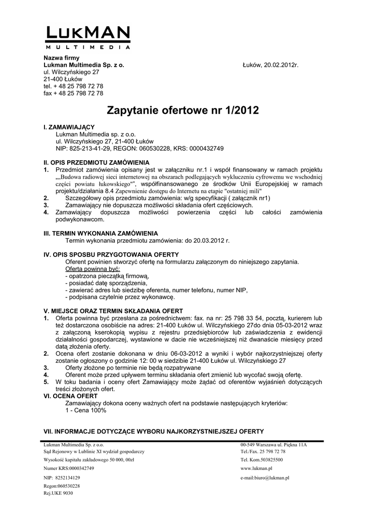 Nazwa firmy Lukman Multimedia Sp. z o. ul. Wilczyńskiego 27 21-400 Łuków tel. + 48 25 798 72 78 fax + 48 25 798 72 78 Łuków, 20.02.2012r. Zapytanie ofertowe nr 1/2012 I. ZAMAWIAJĄCY Lukman Multimedia sp. z o.o. ul. Wilczyńskiego 27, 21-400 Łuków NIP: 825-213-41-29, REGON: 060530228, KRS: 0000432749 II. OPIS PRZEDMIOTU ZAMÓWIENIA 1. Przedmiot zamówienia opisany jest w załączniku nr.1 i współ finansowany w ramach projektu „„Budowa radiowej sieci internetowej na obszarach podlegających wykluczeniu cyfrowemu we wschodniej części powiatu łukowskiego"”, współfinansowanego ze środków Unii Europejskiej w ramach projektu/działania 8.4 Zapewnienie dostępu do Internetu na etapie "ostatniej mili" 2. Szczegółowy opis przedmiotu zamówienia: w/g specyfikacji ( załącznik nr1) 3. Zamawiający nie dopuszcza możliwości składania ofert częściowych. 4. Zamawiający dopuszcza możliwości powierzenia części lub całości zamówienia podwykonawcom. III. TERMIN WYKONANIA ZAMÓWIENIA Termin wykonania przedmiotu zamówienia: do 20.03.2012 r. IV. OPIS SPOSBU PRZYGOTOWANIA OFERTY Oferent powinien stworzyć ofertę na formularzu załączonym do niniejszego zapytania. Oferta powinna być: - opatrzona pieczątką firmową, - posiadać datę sporządzenia, - zawierać adres lub siedzibę oferenta, numer telefonu, numer NIP, - podpisana czytelnie przez wykonawcę. V. MIEJSCE ORAZ TERMIN SKŁADANIA OFERT 1. Oferta powinna być przesłana za pośrednictwem: fax. na nr: 25 798 33 54, pocztą, kurierem lub też dostarczona osobiście na adres: 21-400 Łuków ul. Wilczyńskiego 27do dnia 05-03-2012 wraz z załączoną kserokopią wypisu z rejestru przedsiębiorców lub zaświadczenia z ewidencji działalności gospodarczej, wystawione w dacie nie wcześniejszej niż dwanaście miesięcy przed datą złożenia oferty. 2. Ocena ofert zostanie dokonana w dniu 06-03-2012 a wyniki i wybór najkorzystniejszej oferty zostanie ogłoszony o godzinie 12: 00 w siedzibie 21-400 Łuków ul. Wilczyńskiego 27 3. Oferty złożone po terminie nie będą rozpatrywane 4. Oferent może przed upływem terminu składania ofert zmienić lub wycofać swoją ofertę. 5. W toku badania i oceny ofert Zamawiający może żądać od oferentów wyjaśnień dotyczących treści złożonych ofert. VI. OCENA OFERT Zamawiający dokona oceny ważnych ofert na podstawie następujących kryteriów: 1 - Cena 100% VII. INFORMACJE DOTYCZĄCE WYBORU NAJKORZYSTNIEJSZEJ OFERTY Lukman Multimedia Sp. z o.o. Sąd Rejonowy w Lublinie XI wydział gospodarczy 00-549 Warszawa ul. Piękna 11A Tel./Fax. 25 798 72 78 Wysokość kapitału zakładowego 50 000, 00zł Tel. Kom.503825500 Numer KRS:0000342749 www.lukman.pl NIP: 8252134129 e-mail:[email protected] Regon:060530228 Rej.UKE 9030 O wyborze najkorzystniejszej oferty Zamawiający zawiadomi oferentów telefonicznie VIII. DODATKOWE INFORMACJE Dodatkowych informacji udziela Wojciech Dębski pod numerem telefonu 503 825 500 oraz adresem 21-400 Łuków ul. Wilczyńskiego 27 IX. Opis warunków udziału w postępowaniu O udzielenie zamówienia mogą ubiegać się wykonawcy: 1. Posiadający uprawnienia do wykonywania określonej działalności lub czynności, jeżeli ustawy nakładają obowiązek posiadania takich uprawnień 2. Posiadają niezbędną wiedzę i doświadczenie oraz dysponują potencjałem technicznym i finansowym gwarantującymi prawidłową realizację zamówienia. Informacje o sposobie porozumiewania się Zamawiającego z Wykonawcami. 1. Postępowanie o udzielenie zamówienia prowadzone jest z zachowaniem formy pisemnej Opis sposobu przygotowywania ofert. 1. Wykonawca może złożyć jedną ofertę, w formie pisemnej, w języku polskim, pismem czytelnym. 2. Oferta oraz wszystkie wymagane druki, formularze, oświadczenia, opracowane zestawienia i wykazy składane wraz z ofertą wymagają podpisu osób uprawnionych do reprezentowania firmy w obrocie gospodarczym, zgodnie z aktem rejestracyjnym oraz przepisami prawa. 3. Oferta i załączniki podpisane przez upoważnionego przedstawiciela wykonawcy wymagają załączenia właściwego pełnomocnictwa lub umocowania prawnego. 4. Poprawki w ofercie muszą być naniesione czytelnie oraz opatrzone podpisem osoby/ osób podpisującej ofertę. Oferta musi zawierać : 1. Formularz ofertowy, określający cenę jednostkową za oferowane materiały, zgodnie ze wzorem stanowiącym dodatek nr 1 do zapytania ofertowego. 2. Oświadczenie o spełnieniu warunków udziału w postępowaniu. 3. Oświadczenie, iż oferta nie zawiera informacji stanowiących tajemnicę przedsiębiorstwa w rozumieniu przepisów o zwalczaniu nieuczciwej konkurencji. Opis sposobu obliczenia ceny Cena podana w ofercie powinna obejmować wszystkie koszty i składniki związane z wykonaniem zamówienia (w tym koszt dostawy i instalacji zamówionego sprzętu), musi być podana w PLN cyfrowo i słownie, z wyodrębnieniem należnego podatku VAT. Cena może być tylko jedna za oferowany przedmiot zamówienia, nie dopuszcza się wariantowości cen. Cena nie ulega zwiększeniu w okresie związania ofertą. Miejsce oraz termin składania ofert. Oferty należy składać w siedzibie Lukman Multimedia Termin składania ofert: 05.03.2012 Oferty złożone po terminie będą zwrócone wykonawcom bez otwierania. Miejsce otwarcia ofert: w siedzibie zamawiającego. Kryteria wyboru oferty. Przy wyborze oferty Zamawiający kierował się będzie kryterium: cena 100 %. Zamawiający odrzuci ofertę, jeżeli jej treść nie odpowiada treści zapytania ofertowego, Pozostałe oferty oceniane będą punktowo. Maksymalna ilość punktów, jaką może otrzymać oferta wynosi 100 pkt. Ofertom przyznane zostaną punkty obliczone według wzoru: Cmin Lukman Multimedia Sp. z o.o. Sąd Rejonowy w Lublinie XI wydział gospodarczy 00-549 Warszawa ul. Piękna 11A Tel./Fax. 25 798 72 78 Wysokość kapitału zakładowego 50 000, 00zł Tel. Kom.503825500 Numer KRS:0000342749 www.lukman.pl NIP: 8252134129 