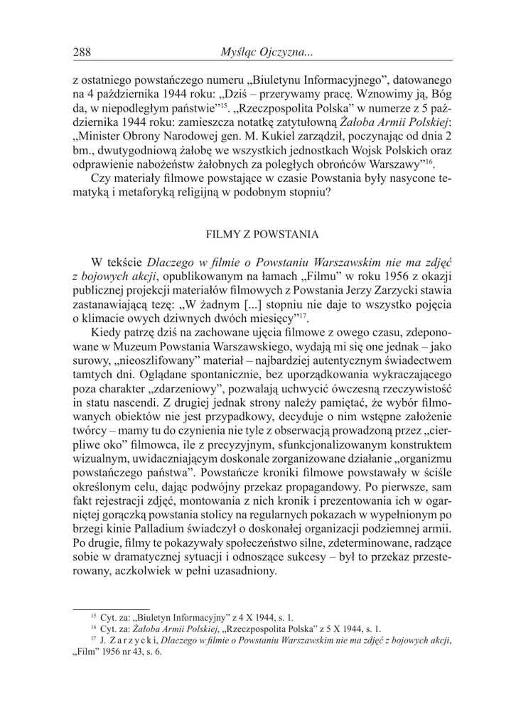 288 Myśląc Ojczyzna... z ostatniego powstańczego numeru „Biuletynu Informacyjnego”, datowanego na 4 października 1944 roku: „Dziś – przerywamy pracę. Wznowimy ją, Bóg da, w niepodległym państwie”15. „Rzeczpospolita Polska” w numerze z 5 października 1944 roku: zamieszcza notatkę zatytułowną Żałoba Armii Polskiej: „Minister Obrony Narodowej gen. M. Kukiel zarządził, poczynając od dnia 2 bm., dwutygodniową żałobę we wszystkich jednostkach Wojsk Polskich oraz odprawienie nabożeństw żałobnych za poległych obrońców Warszawy”16. Czy materiały filmowe powstające w czasie Powstania były nasycone tematyką i metaforyką religijną w podobnym stopniu? FILMY Z POWSTANIA W tekście Dlaczego w filmie o Powstaniu Warszawskim nie ma zdjęć z bojowych akcji, opublikowanym na łamach „Filmu” w roku 1956 z okazji publicznej projekcji materiałów filmowych z Powstania Jerzy Zarzycki stawia zastanawiającą tezę: „W żadnym [...] stopniu nie daje to wszystko pojęcia o klimacie owych dziwnych dwóch miesięcy”17. Kiedy patrzę dziś na zachowane ujęcia filmowe z owego czasu, zdeponowane w Muzeum Powstania Warszawskiego, wydają mi się one jednak – jako surowy, „nieoszlifowany” materiał – najbardziej autentycznym świadectwem tamtych dni. Oglądane spontanicznie, bez uporządkowania wykraczającego poza charakter „zdarzeniowy”, pozwalają uchwycić ówczesną rzeczywistość in statu nascendi. Z drugiej jednak strony należy pamiętać, że wybór filmowanych obiektów nie jest przypadkowy, decyduje o nim wstępne założenie twórcy – mamy tu do czynienia nie tyle z obserwacją prowadzoną przez „cierpliwe oko” filmowca, ile z precyzyjnym, sfunkcjonalizowanym konstruktem wizualnym, uwidaczniającym doskonale zorganizowane działanie „organizmu powstańczego państwa”. Powstańcze kroniki filmowe powstawały w ściśle określonym celu, dając podwójny przekaz propagandowy. Po pierwsze, sam fakt rejestracji zdjęć, montowania z nich kronik i prezentowania ich w ogarniętej gorączką powstania stolicy na regularnych pokazach w wypełnionym po brzegi kinie Palladium świadczył o doskonałej organizacji podziemnej armii. Po drugie, filmy te pokazywały społeczeństwo silne, zdeterminowane, radzące sobie w dramatycznej sytuacji i odnoszące sukcesy – był to przekaz przesterowany, aczkolwiek w pełni uzasadniony. Cyt. za: „Biuletyn Informacyjny” z 4 X 1944, s. 1. Cyt. za: Żałoba Armii Polskiej, „Rzeczpospolita Polska” z 5 X 1944, s. 1. 17 J. Z a r z y c k i, Dlaczego w filmie o Powstaniu Warszawskim nie ma zdjęć z bojowych akcji, „Film” 1956 nr 43, s. 6. 15 16 Myśląc Ojczyzna... 289 W nieuporządkowanych materiałach filmowych, które zachowały się do dziś, ujęcia odnoszące się w jakikolwiek sposób do sfery sacrum nie są reprezentowane zbyt obficie. W materiałach tych odnaleźć można wiele ujęć ukazujących powstańcze groby i cmentarze, sporo nagrań dokumentujących Msze Święte i pogrzeby, jedną scenę ślubu, kilka ujęć figury Chrystusa z krzyżem sprzed kościoła Świętego Krzyża i wreszcie obszerny – w porównaniu z innymi materiałami tego typu – materiał filmowy z akcji bojowej w tym kościele, zawierający między innymi ujęcie upadającego krzyża, płonącego na tle nieba o zmierzchu. Na podstawie tego nieuporządkowanego zbioru filmowych obserwacji można wyciągnąć dwa wnioski natury ogólnej. Po pierwsze, podczas Powstania istniało normalne życie religijne, wpisujące się w obraz całego bogactwa funkcjonowania organizmu powstańczego miasta – wiara i religia pełniły w nim zauważalną i istotną rolę. Po drugie, ujęcia filmowe ukazujące sferę sacrum każą doszukiwać się w nich drugiego dna – przedstawione zdarzenia lub rekwizyty związane z wiarą i religią mają w sobie pewien naddatek, który buduje znaczenia wykraczające poza reportaż z życia powstańczej Warszawy. Aby to uwidocznić, pokażę, jak ujęcia te funkcjonowały w kronikach filmowych prezentowanych widzom w sierpniu 1944 roku w kinie Palladium. Dokonam także semantycznej analizy sekwencji, dla których tłem była sceneria kościoła Świętego Krzyża – w moim przekonaniu ta właśnie sekwencja szczególne nasycona jest zmetaforyzowanym znaczeniem i w największym stopniu wykazuje ów znaczeniowy naddatek. Pierwszy odcinek kroniki relacjonuje przebieg wydarzeń, zgodnie ze wspomnianym już schematem ukazując powszechną samoorganizację i chęć walki. Ten mobilizujący przekaz spuentowany zostaje w zakończeniu sceną Mszy Świętej i przyjmowania komunii – powstańcze ciało i duch zjednoczone są wspólnym celem, namaszczone do działania i wspierane przez nadprzyrodzoną siłę. Odcinek drugi zawiera scenę ślubu, przekazującą komunikat, że pomimo wszechobecnego dramatu życie toczy się dalej. Ślub funkcjonuje tu przede wszystkim jako wydarzenie prywatne, ale jednocześnie rzutujące na otoczenie – odbywa się w aurze zacieśniania powstańczej wspólnoty. W tej odsłonie kroniki pojawia się także sekwencja ukazująca Mszę Świętą sprawowaną piętnastego sierpnia z okazji święta zarówno religijnego, jak i narodowego, upamiętniającego „Cud nad Wisłą” – w tym momencie sfera wiary pozostaje w ścisłej relacji ze sferą narodową. W trzeciej i ostatniej odsłonie kroniki centralne miejsce zajmuje scena „walk” w kościele św. Krzyża – scena ta wymaga odrębnej i bardziej wnikliwej analizy. Jak wspomniałem wcześniej, sekwencja filmowa ukazująca akcję w kościele, oglądana wnikliwie, okazuje się dosyć odległa od opisu przedstawionego przez uczestnika pokazu w kinie Palladium w cytowanej tu relacji. Ten fragment kroniki nie odnosi się (poza miejscem akcji) do zajść, które miały