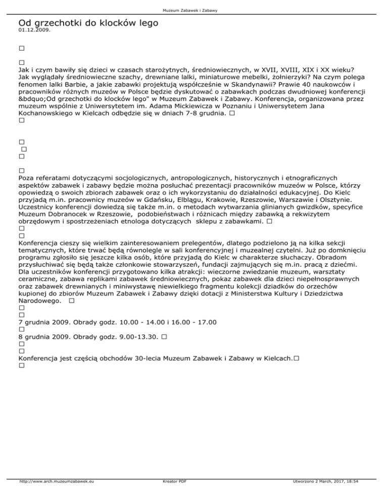 Muzeum Zabawek i Zabawy Od grzechotki do klocków lego 01.12.2009. Jak i czym bawiły się dzieci w czasach starożytnych, średniowiecznych, w XVII, XVIII, XIX i XX wieku? Jak wyglądały średniowieczne szachy, drewniane lalki, miniaturowe mebelki, żołnierzyki? Na czym polega fenomen lalki Barbie, a jakie zabawki projektują współcześnie w Skandynawii? Prawie 40 naukowców i pracowników różnych muzeów w Polsce będzie dyskutować o zabawkach podczas dwudniowej konferencji „Od grzechotki do klocków lego" w Muzeum Zabawek i Zabawy. Konferencja, organizowana przez muzeum wspólnie z Uniwersytetem im. Adama Mickiewicza w Poznaniu i Uniwersytetem Jana Kochanowskiego w Kielcach odbędzie się w dniach 7-8 grudnia. Poza referatami dotyczącymi socjologicznych, antropologicznych, historycznych i etnograficznych aspektów zabawek i zabawy będzie można posłuchać prezentacji pracowników muzeów w Polsce, którzy opowiedzą o swoich zbiorach zabawek oraz o ich wykorzystaniu do działalności edukacyjnej. Do Kielc przyjadą m.in. pracownicy muzeów w Gdańsku, Elblągu, Krakowie, Rzeszowie, Warszawie i Olsztynie. Uczestnicy konferencji dowiedzą się także m.in. o metodach wytwarzania glinianych gwizdków, specyfice Muzeum Dobranocek w Rzeszowie, podobieństwach i różnicach między zabawką a rekwizytem obrzędowym i spostrzeżeniach etnologa dotyczących sklepu z zabawkami. Konferencja cieszy się wielkim zainteresowaniem prelegentów, dlatego podzielono ją na kilka sekcji tematycznych, które trwać będą równolegle w sali konferencyjnej i muzealnej czytelni. Już po domknięciu programu zgłosiło się jeszcze kilka osób, które przyjadą do Kielc w charakterze słuchaczy. Obradom przysłuchiwać się będą także członkowie stowarzyszeń, fundacji zajmujących się m.in. pracą z dziećmi. Dla uczestników konferencji przygotowano kilka atrakcji: wieczorne zwiedzanie muzeum, warsztaty ceramiczne, zabawa replikami zabawek średniowiecznych, pokaz zabawek dla dzieci niepełnosprawnych oraz zabawek drewnianych i miniwystawę niewielkiego fragmentu kolekcji dziadków do orzechów kupionej do zbiorów Muzeum Zabawek i Zabawy dzięki dotacji z Ministerstwa Kultury i Dziedzictwa Narodowego. 7 grudnia 2009. Obrady godz. 10.00 - 14.00 i 16.00 - 17.00 8 grudnia 2009. Obrady godz. 9.00-13.30. Konferencja jest częścią obchodów 30-lecia Muzeum Zabawek i Zabawy w Kielcach. http://www.arch.muzeumzabawek.eu Kreator PDF Utworzono 2 March, 2017, 18:54