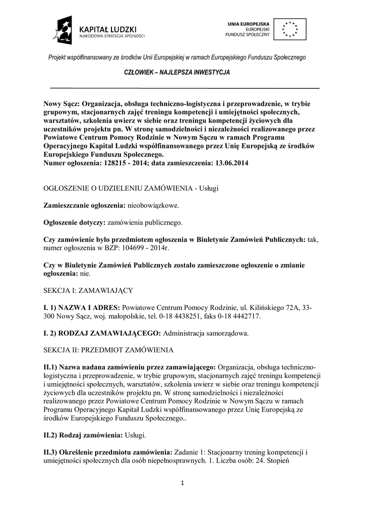 Projekt współfinansowany ze środków Unii Europejskiej w ramach Europejskiego Funduszu Społecznego CZŁOWIEK – NAJLEPSZA INWESTYCJA Nowy Sącz: Organizacja, obsługa techniczno-logistyczna i przeprowadzenie, w trybie grupowym, stacjonarnych zajęć treningu kompetencji i umiejętności społecznych, warsztatów, szkolenia uwierz w siebie oraz treningu kompetencji życiowych dla uczestników projektu pn. W stronę samodzielności i niezależności realizowanego przez Powiatowe Centrum Pomocy Rodzinie w Nowym Sączu w ramach Programu Operacyjnego Kapitał Ludzki współfinansowanego przez Unię Europejską ze środków Europejskiego Funduszu Społecznego. Numer ogłoszenia: 128215 - 2014; data zamieszczenia: 13.06.2014 OGŁOSZENIE O UDZIELENIU ZAMÓWIENIA - Usługi Zamieszczanie ogłoszenia: nieobowiązkowe. Ogłoszenie dotyczy: zamówienia publicznego. Czy zamówienie było przedmiotem ogłoszenia w Biuletynie Zamówień Publicznych: tak, numer ogłoszenia w BZP: 104699 - 2014r. Czy w Biuletynie Zamówień Publicznych zostało zamieszczone ogłoszenie o zmianie ogłoszenia: nie. SEKCJA I: ZAMAWIAJĄCY I. 1) NAZWA I ADRES: Powiatowe Centrum Pomocy Rodzinie, ul. Kilińskiego 72A, 33300 Nowy Sącz, woj. małopolskie, tel. 0-18 4438251, faks 0-18 4442717. I. 2) RODZAJ ZAMAWIAJĄCEGO: Administracja samorządowa. SEKCJA II: PRZEDMIOT ZAMÓWIENIA II.1) Nazwa nadana zamówieniu przez zamawiającego: Organizacja, obsługa technicznologistyczna i przeprowadzenie, w trybie grupowym, stacjonarnych zajęć treningu kompetencji i umiejętności społecznych, warsztatów, szkolenia uwierz w siebie oraz treningu kompetencji życiowych dla uczestników projektu pn. W stronę samodzielności i niezależności realizowanego przez Powiatowe Centrum Pomocy Rodzinie w Nowym Sączu w ramach Programu Operacyjnego Kapitał Ludzki współfinansowanego przez Unię Europejską ze środków Europejskiego Funduszu Społecznego.. II.2) Rodzaj zamówienia: Usługi. II.3) Określenie przedmiotu zamówienia: Zadanie 1: Stacjonarny trening kompetencji i umiejętności społecznych dla osób niepełnosprawnych. 1. Liczba osób: 24. Stopień 1 Projekt współfinansowany ze środków Unii Europejskiej w ramach Europejskiego Funduszu Społecznego CZŁOWIEK – NAJLEPSZA INWESTYCJA niepełnosprawności: od lekkiego do znacznego; różne rodzaje niepełnosprawności, umożliwiające samodzielny udział w zajęciach. 2. Program zajęć ma obejmować: 24 godzin lekcyjnych (1godzina = 45 min.). 3. Szkolenie obejmuje dwie grupy szkoleniowe: Grupa I: 13 osób, Grupa II: 11 osób, z tym zastrzeżeniem że grupy mogą być większe lub mniejsze, nie więcej niż o 2 osoby. 4. Propozycja harmonogramu zajęć: Grupa I: Dni robocze (od poniedziałku do piątku) 9.00-10.30 (2h) Przerwa kawowa 15 min. 10.45-12.15 (2h) Przerwa obiadowa 30 min. 12.45-14.15 (2h) Grupa II: Dni robocze (od poniedziałku do piątku) 15.3017.00 (2h) Przerwa kawowa 15 min. 17.15-18.45 (2h) Sobota-Niedziela 9.00-10.30 (2h) Przerwa kawowa 10.45-12.15 (2h) 5. Miejsce realizacji: Nowy Sącz- wejście do budynku powinno być dostosowane do potrzeb osób niepełnosprawnych (wjazd dla wózków, winda); sala szkoleniowa powinna być dostosowana do potrzeb osób niepełnosprawnych, do wielkości grup - wyposażona w krzesła i stoliki z możliwością dowolnej aranżacji ich ustawienia, przystosowana do prowadzenia zajęć dydaktycznych; sala powinna być wyposażona w projektor multimedialny, ekran, flipchart (ewentualnie tablica sucho ścierna); sala szkoleniowa musi posiadać okna z dostatecznym naświetleniem naturalnym, posiadać oświetlenie sztuczne, spełniać wymogi bezpieczeństwa i higieny pracy oraz akustyczne, być ogrzewana, posiadać zaplecze sanitarne (toalety dostosowane do potrzeb osób niepełnosprawnych); sala powinna być wentylowana (z dostępem do świeżego powietrza), sala powinna zapewniać możliwość organizacji przerw obiadowo - kawowych. 6. Termin realizacji: do 20 października 2014 r. 7. Zakres zadania: Poszerzony zakres realizacji usługi w SIWZ (z uwagi na ograniczoną ilość znaków w BZP) Zadanie 2: Stacjonarne warsztaty , szkolenie uwierz w siebie dla osób niepełnosprawnych. 1. Liczba osób: 2. Stopień niepełnosprawności: stopień niepełnosprawności od lekkiego do umiarkowanego, umożliwiające samodzielny udział w zajęciach. 2. Program zajęć ma obejmować: 18 godzin lekcyjnych (1godzina = 45 min.). 3. Liczba grup: 1. 4. Propozycja harmonogramu zajęć: Dni robocze (od poniedziałku do piątku) 9.00-10.30 (2h) Przerwa kawowa 15 min. 10.45-12.15 (2h) Przerwa obiadowa 30 min. 12.45-14.15 (2h) 5. Miejsce realizacji: Nowy Sącz - wejście do budynku powinno być dostosowane do potrzeb osób niepełnosprawnych (wjazd dla wózków, winda); sala szkoleniowa powinna być dostosowana do potrzeb osób niepełnosprawnych, do wielkości grup - wyposażona w krzesła i stoliki z możliwością dowolnej aranżacji ich ustawienia, przystosowana do prowadzenia zajęć dydaktycznych; sala powinna być wyposażona w projektor multimedialny, ekran, flipchart (ewentualnie tablica sucho ścierna); sala szkoleniowa musi posiadać okna z dostatecznym naświetleniem naturalnym, posiadać oświetlenie sztuczne, spełniać wymogi bezpieczeństwa i higieny pracy oraz akustyczne, być ogrzewana, posiadać zaplecze sanitarne (toalety dostosowane do potrzeb osób niepełnosprawnych); sala powinna być wentylowana (z dostępem do świeżego powietrza), sala powinna zapewniać możliwość organizacji przerw obiadowo - kawowych. 6. Termin realizacji: do 20 października 2014 r. 7. Zakres zadania: Poszerzony zakres realizacji usługi w SIWZ (z uwagi na ograniczoną ilość znaków w BZP) Zadanie 3: Stacjonarny trening kompetencji życiowych dla osób niepełnosprawnych. 1. Liczba osób: 17. 2. Stopień niepełnosprawności: od lekkiego do znacznego; różne rodzaje niepełnosprawności umożliwiające udział w zajęciach, w tym, 1 osoba - na wózku i