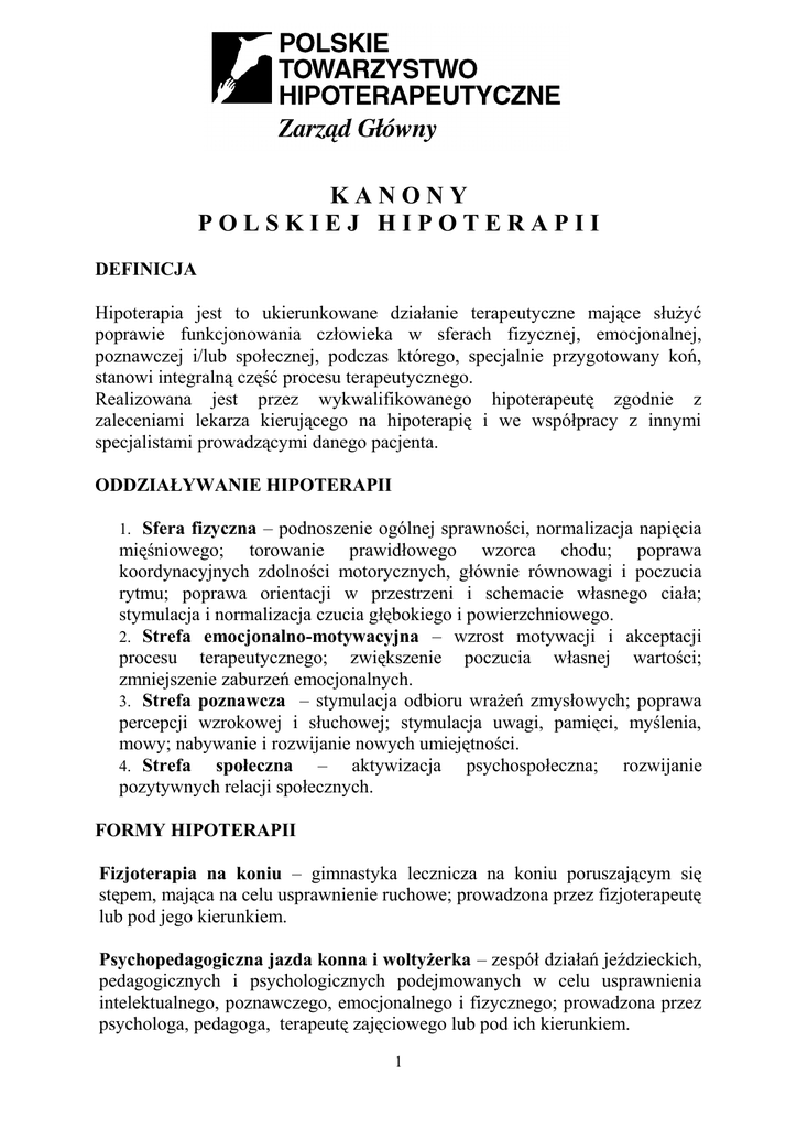 KANONY POLSKIEJ HIPOTERAPII DEFINICJA Hipoterapia jest to ukierunkowane działanie terapeutyczne mające służyć poprawie funkcjonowania człowieka w sferach fizycznej, emocjonalnej, poznawczej i/lub społecznej, podczas którego, specjalnie przygotowany koń, stanowi integralną część procesu terapeutycznego. Realizowana jest przez wykwalifikowanego hipoterapeutę zgodnie z zaleceniami lekarza kierującego na hipoterapię i we współpracy z innymi specjalistami prowadzącymi danego pacjenta. ODDZIAŁYWANIE HIPOTERAPII 1. Sfera fizyczna – podnoszenie ogólnej sprawności, normalizacja napięcia mięśniowego; torowanie prawidłowego wzorca chodu; poprawa koordynacyjnych zdolności motorycznych, głównie równowagi i poczucia rytmu; poprawa orientacji w przestrzeni i schemacie własnego ciała; stymulacja i normalizacja czucia głębokiego i powierzchniowego. 2. Strefa emocjonalno-motywacyjna – wzrost motywacji i akceptacji procesu terapeutycznego; zwiększenie poczucia własnej wartości; zmniejszenie zaburzeń emocjonalnych. 3. Strefa poznawcza – stymulacja odbioru wrażeń zmysłowych; poprawa percepcji wzrokowej i słuchowej; stymulacja uwagi, pamięci, myślenia, mowy; nabywanie i rozwijanie nowych umiejętności. 4. Strefa społeczna – aktywizacja psychospołeczna; rozwijanie pozytywnych relacji społecznych. FORMY HIPOTERAPII Fizjoterapia na koniu – gimnastyka lecznicza na koniu poruszającym się stępem, mająca na celu usprawnienie ruchowe; prowadzona przez fizjoterapeutę lub pod jego kierunkiem. Psychopedagogiczna jazda konna i woltyżerka – zespół działań jeździeckich, pedagogicznych i psychologicznych podejmowanych w celu usprawnienia intelektualnego, poznawczego, emocjonalnego i fizycznego; prowadzona przez psychologa, pedagoga, terapeutę zajęciowego lub pod ich kierunkiem. 1 Terapia kontaktem z koniem – celem terapii jest nawiązanie kontaktu pacjenta ze zwierzęciem, z otaczającym środowiskiem, wreszcie z innymi ludźmi, jej istotą jest kontakt pacjenta z koniem, stworzenie sytuacji terapeutycznej, a nie samo dosiadanie konia; prowadzona przez psychologa, pedagoga, lekarza psychiatrę lub pod ich kierunkiem. Ponadto wyróżnia się jazdę konną dla osób niepełnosprawnych (rekreacyjną i sportową), która nie stanowi części hipoterapii, ale jest z nią ściśle związana i może mieć aspekt terapeutyczny. WSKAZANIA Hipoterapia może przynosić korzyści we wszystkich obszarach funkcjonowania człowieka: fizycznym, motywacyjnym, emocjonalnym, poznawczym oraz społecznym. Każda osoba niepełnosprawna, cierpiąca na jakąkolwiek chorobę czy zaburzenie może wynieść specyficzne dla siebie korzyści z zajęć hipoterapeutycznych. Hipoterapii poddawane są najczęściej osoby z następującymi schorzeniami i zaburzeniami rozwoju. Dzieci Zespoły neurologiczne 1. Mózgowe porażenie dziecięce, konieczna samodzielna kontrola głowy i czynna pozycja siedząca pacjenta. 2. Stany po urazach czaszkowo-mózgowych. 3. Minimalne uszkodzenia mózgu. 4. Choroby mięśni (przy sile mięśni ocenianej w skali Lovetta na min. 3 punkty), konieczna indywidualizacja intensywności i czasu zajęć. 5. Dzieci niedowidzące i niewidome. 6. Choroby i zaburzenia psychiczne. Zespoły ortopedyczne 1. Wady postawy. 2. Skoliozy do 20° wg Coba z wyjątkiem progresujących skolioz idiopatycznych. 3. Stany po amputacji i wady rozwojowe kończyn. Inne 1. Zespoły genetyczne, np. Zespół Down'a (z obowiązkowym zdjęciem rtg bocznym i czynnościowym - odcinka szyjnego kręgosłupa). 2. Przepukliny oponowo-rdzeniowe, w zależności od wysokości uszkodzenia, obrazu klinicznego, współwystępowania wodogłowia. 3. Zespoły psychologiczne: zaburzenia emocjonalne, upośledzenia umysłowe, niedostosowanie społeczne. 4. Opóźnienie psychoruchowe o nieustalonej etiologii. 2 Dorośli 1. Stwardnienie rozsiane. 2. Stany po udarze. 3. Stany po urazach czaszkowo - mózgowych. 4. Inne choroby narządu ruchu na tle neurologicznym i ortopedycznym. 5. Choroby i zaburzenia psychiczne. 6. Uzależnienia. 7. Patologie społeczne. PRZECIWWSKAZANIA Przeciwwskazania bezwzględne - Uczulenie na sierść, pot lub zapach konia. - Nie wygojone rany. - Nietolerancja tej formy terapii przez pacjenta, np. niepohamowany lęk. - Odklejanie siatkówki, wzmożone ciśnienie śródgałkowe. - Brak kontroli głowy w rozwoju motorycznym i czynnej pozycji siedzącej. - Wodogłowie bez wszczepionej zastawki. - Niestabilność kręgów szyjnych występująca np. w zespole Down’a. - Zwichnięcia i podwichnięcia stawów biodrowych. - Skoliozy powyżej 20° wg Coba oraz progresujące skoliozy idiopatyczne. - Choroby mięśni przy sile mięśni ocenianej poniżej 3 punktów w skali Lowetta. - Pogorszenie stanu w zespołach neurologicznych, stanach po urazach czaszkowo-mózgowych, ADHD, chorobach mięśni. - Ostre stany chorób i zaburzeń psychicznych. - Podwyższona temperatura. - Ostre choroby infekcyjne. Przeciwwskazania względne: - Padaczka. - Upośledzenie umysłowe w stopniu głębokim. - Zaburzenia mineralizacji kości. - Utrwalone deformacje i zniekształcenia, przykurcze, ograniczenia zakresu ruchu układu kostno-stawowego. - Przepuklina oponowo-rdzeniowa zlokalizowana w odc. lędźwiowym. - Dyskopatia. - Hemofilia oraz inne skazy krwotoczne. - Schorzenia okulistyczne – wymagana konsultacja. 3 ZESPÓŁ HIPOTERAPEUTYCZNY • Lekarz prowadzący lub konsultujący zespół. • Wykwalifikowany hipoterapeuta. • Współpracownicy: fizjoterapeuta, psycholog, pedagog, pedagog specjalny, logopeda, neurolog, ortopeda lub inny specjalista w zależności od specyfiki problemu pacjenta. HIPOTERAPEUTA 1. Podstawowym obowiązkiem hipoterapeuty jest troska o poprawę stanu osoby korzystającej z jego usług. 2. Program i cele terapii określa hipoterapeuta zgodnie z zaleceniami lekarza kierującego pacjenta na zajęcia oraz według indywidualnych potrzeb podopiecznego i zgodnie z prośbą przedstawioną 