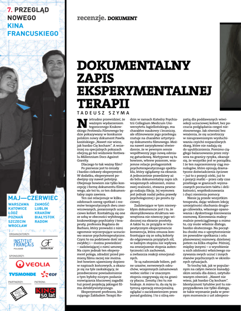 7. PRZEGLĄD NOWEGO KINA FRANCUSKIEGO recenzje. DOKUMENT DOKUMENTALNY ZAPIS EKSPERYMENTALNEJ TERAPII N TADEUSZ SZYMA MAJ—CZERWIEC WARSZAWA KATOWICE ŁÓDŹ POZNAŃ SZCZECIN WROCŁAW ZAMOŚĆ LUBLIN KRAKÓW BIAŁYSTOK RADOM ORGANIZATORZY: SPONSORZY: PARTNERZY: PATRONI: ietrudno przewidzieć, że ważnym wydarzeniem tegorocznego Krakowskiego Festiwalu Filmowego będzie pokazywany w konkursie polskim nowy dokument Pawła Łozińskiego „Nawet nie wiesz, jak bardzo Cię kocham”. A wcześniej na specjalnych pokazach obejrzą go też widzowie festiwalu Millennium Docs Against Gravity. Dlaczego to tak ważny film? Po pierwsze jest to śmiały i bardzo ciekawy eksperyment. W dodatku, eksperyment podwójny czy nawet potrójny. Obejmuje bowiem nie tylko koncepcję i formę dokumentu filmowego, ale też to, co ten dokumentalny zapis zawiera. Ten zaś relacjonuje w kilku odsłonach szereg spotkań i rozmów terapeutycznych dwu znerwicowanych, poranionych uczuciowo kobiet. Kontaktują się one ze sobą w obecności wybitnego krakowskiego psychiatry i terapeuty, profesora Bogdana de Barbaro, który prowadzi z nimi ogromnie wyczerpujące uczuciowo seanse psychoterapeutyczne. Czyni to na podstawie dość niezwykłej i – można powiedzieć – zadziwiającej z nimi umowy. Na czym jednak ten eksperyment polega, zdradzić przed premierą filmu raczej nie można. Jest bowiem ujawniony dopiero w napisach końcowych, a okazuje się na tyle zaskakujący, że przedwczesne powiadomienie o tym byłoby niczym podanie rozwiązania kluczowej zagadki tuż przed projekcją jakiegoś filmu detektywistycznego. Eksperyment profesora, kierującego Zakładem Terapii Ro- dzin w ramach Katedry Psychiatrii Collegium Medicum Uniwersytetu Jagiellońskiego, ma charakter naukowy i leczniczy, ale sfilmowanie jego przebiegu rzutuje na charakter artystyczny dokumentu filmowego. Można nawet zaryzykować stwierdzenie, że w pewnym sensie współtworzy jego nową odmianę gatunkową. Nietypowe są tu bowiem, wbrew pozorom, wzajemne relacje protagonistek psychoterapeutycznego spektaklu, który oglądamy na ekranie. A jednocześnie prawdziwy aż do bólu dokumentalny zapis ich wzajemnych odniesień, mimo swej realności, stwarza pewnego rodzaju fikcję. Jej wymowa jest jednak nadal pełna prawdy psychologicznej i po prostu życiowej. Zadziwiające w tym niezwykłym dokumencie jest i to, że skomplikowana struktura wewnętrzna nie niweczy jego widocznej na ekranie prostoty. A także to, że przyjęta w terapeutycznym eksperymencie konwencja, która zmusza konfrontujące się ze sobą kobiety do odgrywania przyjętych ról, w żadnym stopniu nie wpływa na zmniejszenie stopnia autentyczności ich zachowań, a zwłaszcza reakcji emocjonalnych. Te są nabrzmiałe bólem, pełne urazów, nerwowych odruchów, wzajemnych zahamowań wobec siebie i w znacznym stopniu rozgrywają się na granicy płaczu. Zresztą i łez tu nie brakuje. A mimo to, da się tę intymną operację emocjonalną oglądać z zaciekawieniem przez ponad godzinę. I to z silną em- patią dla poddawanych wiwisekcji uczuciowej kobiet, bez poczucia podglądania czegoś niestosownego. Jak również bez wrażenia, że się uczestniczy w nieuprawnionym wysłuchiwaniu czyichś rozpaczliwych skarg, które nie nadają się do upublicznienia. Pomimo ciągłego balansowania przez reżysera na granicy ryzyka, okazuje się, że wszystko jest w porządku. I że ten naprzemienny ciąg monologów, które opisują dramatyczne doświadczenia życiowe – już to z pozycji córki, już to z pozycji matki – przez cały czas przebiega w granicach wyznaczanych poczuciem taktu i delikatności, współodczuwania i chęci niesienia pomocy. Niesie ją przede wszystkim terapeuta, dając widzom lekcję umiejętności słuchania drugiego człowieka, własnego opanowania i dyskretnego kierowania rozmową. Kierowania maksymalnie powściągliwego a mimo to, czy może właśnie dlatego, bardzo skutecznego. Na początku chodzi mu o uprzytomnienie im powodów spotkania i celu planowanej rozmowy, dzielonej potem na kilka etapów. Później, między innymi – o wyrobienie u nich zdolności właściwego nazywania swych uczuć i innych stanów psychicznych w określonych sytuacjach. To trochę tak, jak w popularnym na całym świecie kanadyjskim serialu dla dzieci, zatytułowanym również: „Nawet nie wiesz, jak bardzo Cię kocham”. Identyczność tytułów jest tu nieprzypadkowa nie tylko dlatego, że takie wyznanie pada w pewnym momencie z ust zdespero- PSYCHOTERAPEUTYCZNY SPEKTAKL wanej matki. W telewizyjnej ekranizacji wzruszającej bajki północnoirlandzkiego pisarza Sama McBratneya o małym brązowym zajączku i jego dużym brązowym tacie, przetłumaczonej na trzydzieści siedem języków i wydanej w nakładzie dwudziestu dwóch milionów egzemplarzy, również chodzi o relacje pomiędzy rodzicem a dzieckiem, o wzajemne zrozumienie oraz naukę nazywania i okazywania uczuć. Tożsamość tytułów i identyczność najważniejszego dla dziecka wyznania rodzica, wyznania miłości, nie mogą zmienić faktu, że aura emocjonalna w książce McBratneya i w jej serialowej ekranizacji a z drugiej strony w filmowym dokumencie Pawła Łozińskiego jest zupełnie odmienna. To, co przeżywają bohaterki terapii, dalekie jest od czułego porozumienia. Zarówno dwudziestopięcioletnia zbuntowana córka, która rozstała się z matką, a wcześniej utraciła też kontakt z ojcem, jak i samotna kobieta w średnim wieku, po wielu przejściach, mimo bardzo różnych osobistych doświadczeń, dźwigają w istocie ten sam ciężar. Przede wszystkim borykają się z konsekwencjami rozbicia rodziny, rozpadu rodzinnego domu, traumy po rozwodzie przeżywanym równie dramatycznie, niezależnie od pozycji życiowej: czy to jako współmałżonka, matka czy córka. Na osobną uwagę zasługuje w tym dokumencie sposób prowadzenia kamery przez Kacpra Lisowskiego i wynikający z tego styl filmowej narracji. Jest to 