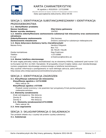 KARTA CHARAKTERYSTYKI W zgodzie z 453/2010 i 1272/2008 (Wszystkie odniesienia do regulacji i dyrektyw UE zostały podane w postaci numeru) Data sporządzenia dokumentu 2012-04-05 SEKCJA 1: IDENTYFIKACJA SUBSTANCJI/MIESZANINY I IDENTYFIKACJA PRZEDSIEBIORSTWA 1.1. Identyfikator produktu Nazwa handlowa Olej lniany gotowany Numer wyrobu dostawcy 104302 1.2. Istotne zidentyfikowane zastosowania substancji lub mieszaniny oraz zastosowania odradzane Zidentyfikowane zastosowania Olej bazowy Zastosowania niezalecane Drewno zawieraj?ce substancje niebezpieczne 1.3. Dane dotyczace dostawcy karty charakterystyki Nazwa firmy Herdins Färgverk Box 711 SE-79129 FALUN Osoba kontaktowa Dag Fredrixon Telefon +23-33060 E-mail [email protected] 1.4. Numer telefonu alarmowego W razie nagłej potrzeby należy skontaktować się ze stosowną infolinią, zadzwonić pod numer 112 (w Europie) lub 911 (w USA i Kanadzie). W przypadku innych krajów należy użyć standardowego numeru pogotowia ratunkowego umieszczonego w telefonie komórkowym. Aby uzyskać informacje o postępowaniu w razie lekkiego zatrucia, patrz witryna http://www.who.int/ipcs/poisons/centre/directory/euro/en/ SEKCJA 2: IDENTYFIKACJA ZAGROZEN 2.1. Klasyfikacja substancji lub mieszaniny Klasyfikacja zgodnie z 1272/2008 Patrz sekcja 16. Klasyfikacja zgodna z 67/548 Produkt został oceniony i nie powinien być przypisany R-lub porównywalnemu niebezpieczeństwu 2.2. Elementy oznakowania Znak ostrzegawczy Nie dotyczy Zwroty R Nie dotyczy Zwroty S Nie dotyczy 2.2. Elementy oznakowania(1272/2008) Patrz sekcja 16. 2.3. Inne zagrozenia SEKCJA 3: SKLAD/INFORMACJA O SKLADNIKACH Ten produkt składa się z czystej lub prawie czystej substancji. 3.1. Substancje Karta charakterystyki dla Olej lniany gotowany. Wydanie 2012-04-05 Strona 1 z 7 Składnik Czystość OLEJ LNIANY GOTOWANY Nr CAS 8001-26-1 80 - 100% Nr WE 232-278-6 Pojawienie się zanieczyszczenia, dodatku stabilizującego lub pojedynczych składników innych niż składnik główny zostało uwzględnione przez wskazanie związku chemicznego i stopnia czystości chemicznej. SEKCJA 4: SRODKI PIERWSZEJ POMOCY 4.1. Opis srodków pierwszej pomocy Ogólnie Nie wskazano Przy wdychaniu W przypadku połknięcia dużej ilości dymu, pyłu lub oparów należy przepłukać nos, usta i gardło wodą; Jeśli objawy nie ustępują, należy skonsultować się z lekarzem. Przy kontakcie z oczami Bezpośrednio po zdarzeniu przemywać szeroko otwarte oczy ciepłą wodą przez 15-20 minut; jeśli objawy nie ustępują, należy skonsultować się z lekarzem. Przy kontakcie ze skórą Zwykłe umycie skóry jest wystarczające; gdy mimo to wystąpią objawy wówczas należy skontaktować się z lekarzem. Zdjąć skażoną odzież. W przypadku połknięcia Uważa się, że nie jest wymagane żadne działanie; Dla bezpieczeństwa spowodować wymioty i skonsultować się z lekarzem. 4.2. Najwazniejsze ostre i opóznione objawy oraz skutki narazenia Informacje o objawach dla tego produktu są niejednoznaczne lub ich brak. SEKCJA 5: POSTEPOWANIE W PRZYPADKU POZARU 5.0 Ogólne środki zaradcze podejmowane w razie pożaru lub bezpośredniego zagrożenia pożarem Powiadomić Straż pożarną - tel. 112 (w Europie). Najpierw ratować osoby znajdujące się w niebezpieczeństwie, później usunąć butle z gazem, artykuły łatwopalne i materiał utleniający. 5.1. Srodki gasnicze Zalecane środki gaśnicze Gasić proszkiem, dwutlenkiem węgla lub pianą gaśniczą. Niewłaściwe środki gaśnicze Nie gasić wodą. 5.2. Szczególne zagrozenia zwiazane z substancja lub mieszanina Niebezpieczne gazy spalinowe Paląc się powoduje wydzielanie dymu zawierającego szkodliwe gazy (tlenek węgla i dwutlenek węgla), a w przypadku niekompletnego spalania, aldehydy i inne substancje toksyczne, drażniące lub szkodliwe dla człowieka bądź środowiska. Szczególne rodzaje ryzyka przy wygaszaniu ognia 5.3. Informacje dla strazy pozarnej W razie pożaru stosować maskę oddechową. 5.4. Inne informacje Właściwości palne wyrobu Palny płyn, lecz trudny do zapalenia. Karta charakterystyki dla Olej lniany gotowany. Wydanie 2012-04-05 Strona 2 z 7 Szczególne rodzaje ryzyka w przypadku pożaru SEKCJA 6: POSTEPOWANIE W PRZYPADKU NIEZAMIERZONEGO UWOLNIENIA DO SRODOWISKA 6.1. Indywidualne srodki ostroznosci, wyposazenie ochronne i procedury w sytuacjach awaryjnych Do usuwania zanieczyszczeń stosować odpowiednie testowane dermatologicznie rękawice ochronne. Przy usuwaniu zanieczyszczeń wymagane mogą być filtry przeciwpyłowe IIb (P2). Nie wdychać produktu i unikać narażenia na kontakt produktu ze skórą i oczami. 6.2. Srodki ostroznosci w zakresie ochrony srodowiska Produkt w rozpatrywanych tu ilościach może zostać uwolniony do środowiska naturalnego bez poważnych skutków dla otoczenia, jednakże duże emisje zanieczyszczeń należy zgłosić służbom ratunkowym i Agencji Ochrony Środowiska. 6.3. Metody i materialy zapobiegajace rozprzestrzenianiu sie skazenia i sluzace do usuwania skazenia Do pochłaniania płynu zastosować obojętny chemicznie środek pochłaniający np. wermikulit. Zebrać materiał w celu utylizacji w zakładzie utylizacji odpadów. Do usuwania produktu nigdy nie wolno używać trocin, odpadów bawełnianych, szmat ani innych palnych materiałów. 6.4. Odniesienia do innych sekcji Aby wybrać odpowiednie rękawice, patrz sekcja 8. SEKCJA 7: POSTEPOWANIE Z SUBSTANCJAMI I MIESZANINAMI ORAZ ICH MAGAZYNOWANIE 7.1. Srodki ostroznosci dotyczace bezpiecznego postepowania 7.1.1.a Zalecenia podano celem umożliwienia bezpiecznego postępowania z substancją lub mieszaniną Substancję tę należy traktować jak potencjalnie niebezpieczną dla zdrowia. 7.1.2. Advice on general occupational hygiene Produkt ten powinien być przechowywany w miejscu niedostępnym dla małych dzieci i w bezpiecznej odległości od produktów spożywczych. Nie jeść, nie pić ani nie palić w miejscach, gdzie przechowywany jest ten produ