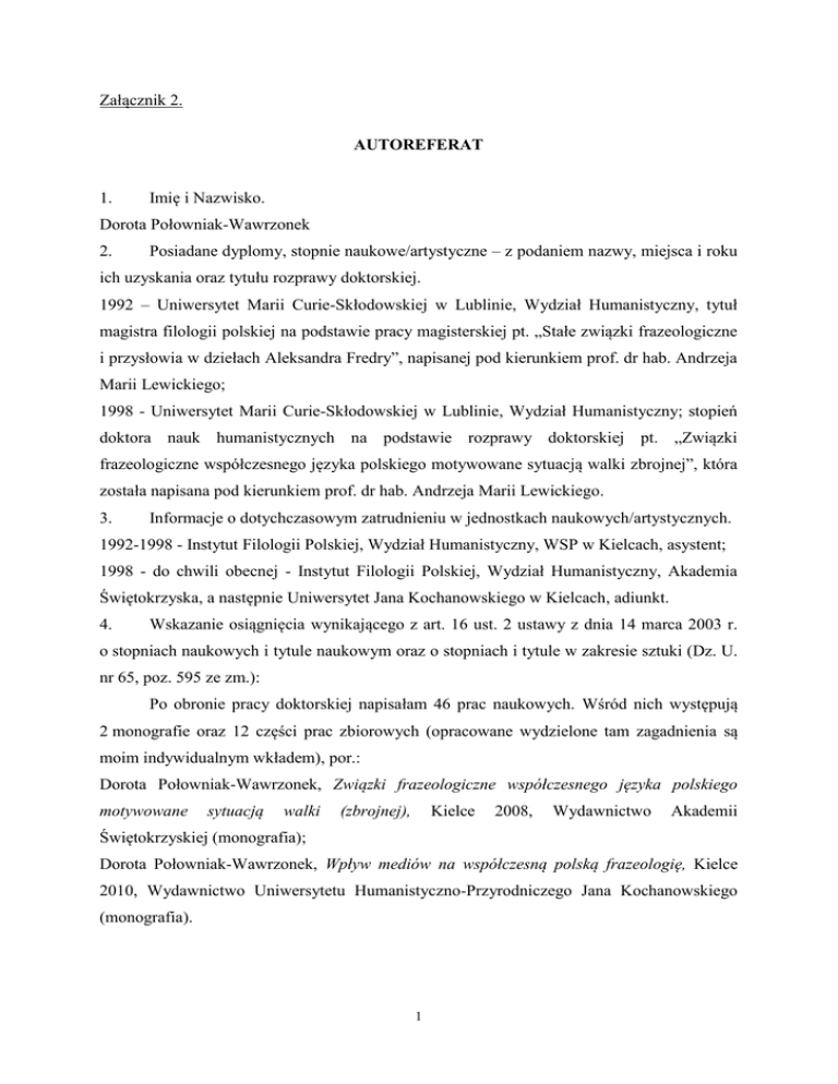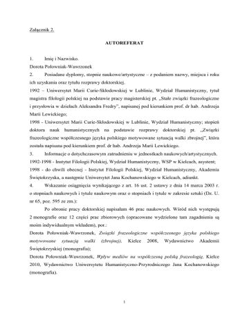 Załącznik 2. AUTOREFERAT 1. Imię i Nazwisko. Dorota Połowniak-Wawrzonek 2. Posiadane dyplomy, stopnie naukowe/artystyczne – z podaniem nazwy, miejsca i roku ich uzyskania oraz tytułu rozprawy doktorskiej. 1992 – Uniwersytet Marii Curie-Skłodowskiej w Lublinie, Wydział Humanistyczny, tytuł magistra filologii polskiej na podstawie pracy magisterskiej pt. „Stałe związki frazeologiczne i przysłowia w dziełach Aleksandra Fredry”, napisanej pod kierunkiem prof. dr hab. Andrzeja Marii Lewickiego; 1998 - Uniwersytet Marii Curie-Skłodowskiej w Lublinie, Wydział Humanistyczny; stopień doktora nauk humanistycznych na podstawie rozprawy doktorskiej pt. „Związki frazeologiczne współczesnego języka polskiego motywowane sytuacją walki zbrojnej”, która została napisana pod kierunkiem prof. dr hab. Andrzeja Marii Lewickiego. 3. Informacje o dotychczasowym zatrudnieniu w jednostkach naukowych/artystycznych. 1992-1998 - Instytut Filologii Polskiej, Wydział Humanistyczny, WSP w Kielcach, asystent; 1998 - do chwili obecnej - Instytut Filologii Polskiej, Wydział Humanistyczny, Akademia Świętokrzyska, a następnie Uniwersytet Jana Kochanowskiego w Kielcach, adiunkt. 4. Wskazanie osiągnięcia wynikającego z art. 16 ust. 2 ustawy z dnia 14 marca 2003 r. o stopniach naukowych i tytule naukowym oraz o stopniach i tytule w zakresie sztuki (Dz. U. nr 65, poz. 595 ze zm.): Po obronie pracy doktorskiej napisałam 46 prac naukowych. Wśród nich występują 2 monografie oraz 12 części prac zbiorowych (opracowane wydzielone tam zagadnienia są moim indywidualnym wkładem), por.: Dorota Połowniak-Wawrzonek, Związki frazeologiczne współczesnego języka polskiego motywowane sytuacją walki (zbrojnej), Kielce 2008, Wydawnictwo Akademii Świętokrzyskiej (monografia); Dorota Połowniak-Wawrzonek, Wpływ mediów na współczesną polską frazeologię, Kielce 2010, Wydawnictwo Uniwersytetu Humanistyczno-Przyrodniczego Jana Kochanowskiego (monografia). 1 Dorota Połowniak-Wawrzonek, Miłość w nauczaniu Jana Pawła II, |w :| Słowo – myśl – ethos w twórczości Jana Pawła II, pod red. Z. Trzaskowskiego, Kielce 2005, Wydawnictwo Jedność, IFP Akademii Świętokrzyskiej im. Jana Kochanowskiego w Kielcach, s. 373-400; Dorota Połowniak-Wawrzonek, Utrwalone związki wyrazowe, zawierające komponent oznaczający walkę (zbrojną), przedstawiane w sytuacji motywującej, |w :| Dialog z rzeczywistością. Język. Literatura. Kultura, pod red. Z. Trzaskowskiego, Kielce 2007, IFP Akademii Świętokrzyskiej im. Jana Kochanowskiego w Kielcach, s. 253-268; Dorota Połowniak-Wawrzonek, Frazeologizmy ktoś rzucił komuś rękawicę, ktoś podniósł a. podjął (rzuconą) rękawicę we współczesnej polszczyźnie, |w:| Preteksty, teksty, konteksty, pod red. M. Barańskiego, Z. Trzaskowskiego, Kielce 2007, IFP Akademii Świętokrzyskiej im. Jana Kochanowskiego w Kielcach, s. 363-368; Dorota Połowniak-Wawrzonek, Miłość a miłosierdzie w nauczaniu Jana Pawła II, |w :| Wyobraźnia miłosierdzia, pod red. ks. P. Borto, ks. R. Kuligowskiego, ks. Z. Trzaskowskiego, ks. A. Żądło, Kraków 2007, Wydawnictwo UNUM, s. 273-294; Dorota Połowniak-Wawrzonek, Frazeologizmy współczesnych tekstach o tematyce ekonomicznej, motywowane walką zbrojną we |w :| Język w marketingu, pod red. K. Michalewskiego, Łódź 2008, Wydawnictwo Uniwersytetu Łódzkiego, s. 166–175; Dorota Połowniak-Wawrzonek, Zapożyczenia zewnętrzne we współczesnej polskiej frazeologii, |w :| Dziedzictwo i teraźniejszość. Polsko – europejski dialog kultur, pod red. M. Marczewskiej, Z. Trzaskowskiego, Kielce 2009, IFP Uniwersytetu HumanistycznoPrzyrodniczego Jana Kochanowskiego w Kielcach, s. 149-159; Dorota Połowniak-Wawrzonek, Utrwalone połączenie słowne matki, żony (i) kochanki we współczesnej polszczyźnie, |w :| Wizerunek kobiety na przestrzeni wieków, pod red. A. Pierścińskiej-Maruszewskiej, B. Kowalskiej-Bakalarz, T. Grudniewskiego, Ostrowiec Św. 2009, Stowarzyszenie „Nauka. Edukacja. Rozwój.”, s. 289-300; Dorota Połowniak-Wawrzonek, Wpływ wypowiedzi polityków na współczesną polską frazeologię, |w :| Język w prawie, administracji i gospodarce, pod red. K. Michalewskiego, Łódź 2010, Wydawnictwo Uniwersytetu Łódzkiego, s. 199-209; Dorota Połowniak-Wawrzonek, Wpływ reklamy na współczesną polską frazeologię, |w :| Współczesna polszczyzna w badaniach językoznawczych. Od gramatyki do języka w komunikacji, pod red. P. Zbróga, Kielce 2010, Wydawnictwo LIBRON, IFP Uniwersytetu Humanistyczno-Przyrodniczego Jana Kochanowskiego w Kielcach, s. 211-222; Dorota Połowniak-Wawrzonek, Tendencja do ekonomii w polskich frazeologizmach powstałych pod wpływem mediów, |w :| Zjawisko ekonomii w języku, tekście i komunikacji, 2 pod. red. R. Bizior i D. Suski, Częstochowa 2010, Wydawnictwo Akademii im. Jana Długosza w Częstochowie, s. 113-127; Dorota Połowniak-Wawrzonek, Połączenia utrwalone dzięki oddziaływaniu wypowiedzi Lecha Wałęsy (analiza wybranych frazeologizmów), |w :| Współczesna polszczyzna w badaniach językoznawczych. Od języka w działaniu do leksyki, pod red. P. Zbróga, Kielce 2011, IFP Uniwersytetu Humanistyczno-Przyrodniczego Jana Kochanowskiego w Kielcach, s. 179-198; Dorota Połowniak-Wawrzonek, Ojczyzna i patriotyzm w nauczaniu Jana Pawła II, |w :| Idee i wartości. Humaniora Jana Pawła II, pod red. M. Marczewskiej, Z. Trzaskowskiego, Kielce 2011, IFP Uniwersytetu Humanistyczno-Przyrodniczego Jana Kochanowskiego w Kielcach, s. 219-234. W wykazie publikacji zamieszczono pozostałe prace naukowe zamieszczone w czasopismach, m.in. artykuły w „Poradniku Językowym”, „Problemach Frazeologii Europejskiej”, „Respectus Philologicus”. Po obronie pracy doktorskiej prowadziłam badania naukowe, które dotyczyły głównie takich zagadnień, jak: I. Zmiany ujawniające się w wykorzystywaniu, funkcjonowaniu metaforyki wywodzącej się z WALKI (ZBROJNE