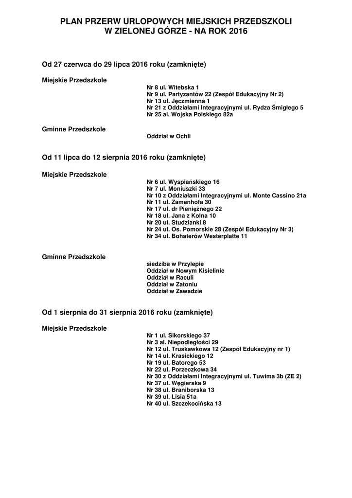 PLAN PRZERW URLOPOWYCH MIEJSKICH PRZEDSZKOLI W ZIELONEJ GÓRZE - NA ROK 2016 Od 27 czerwca do 29 lipca 2016 roku (zamknięte) Miejskie Przedszkole Nr 8 ul. Witebska 1 Nr 9 ul. Partyzantów 22 (Zespół Edukacyjny Nr 2) Nr 13 ul. Jęczmienna 1 Nr 21 z Oddziałami Integracyjnymi ul. Rydza Śmigłego 5 Nr 25 al. Wojska Polskiego 82a Gminne Przedszkole Oddział w Ochli Od 11 lipca do 12 sierpnia 2016 roku (zamknięte) Miejskie Przedszkole Nr 6 ul. Wyspiańskiego 16 Nr 7 ul. Moniuszki 33 Nr 10 z Oddziałami Integracyjnymi ul. Monte Cassino 21a Nr 11 ul. Zamenhofa 30 Nr 17 ul. dr Pieniężnego 22 Nr 18 ul. Jana z Kolna 10 Nr 20 ul. Studzianki 8 Nr 24 ul. Os. Pomorskie 28 (Zespół Edukacyjny Nr 3) Nr 34 ul. Bohaterów Westerplatte 11 Gminne Przedszkole siedziba w Przylepie Oddział w Nowym Kisielinie Oddział w Raculi Oddział w Zatoniu Oddział w Zawadzie Od 1 sierpnia do 31 sierpnia 2016 roku (zamknięte) Miejskie Przedszkole Nr 1 ul. Sikorskiego 37 Nr 3 al. Niepodległości 29 Nr 12 ul. Truskawkowa 12 (Zespół Edukacyjny nr 1) Nr 14 ul. Krasickiego 12 Nr 19 ul. Batorego 53 Nr 22 ul. Porzeczkowa 34 Nr 30 z Oddziałami Integracyjnymi ul. Tuwima 3b (ZE 2) Nr 37 ul. Węgierska 9 Nr 38 ul. Braniborska 13 Nr 39 ul. Lisia 51a Nr 40 ul. Szczekocińska 13