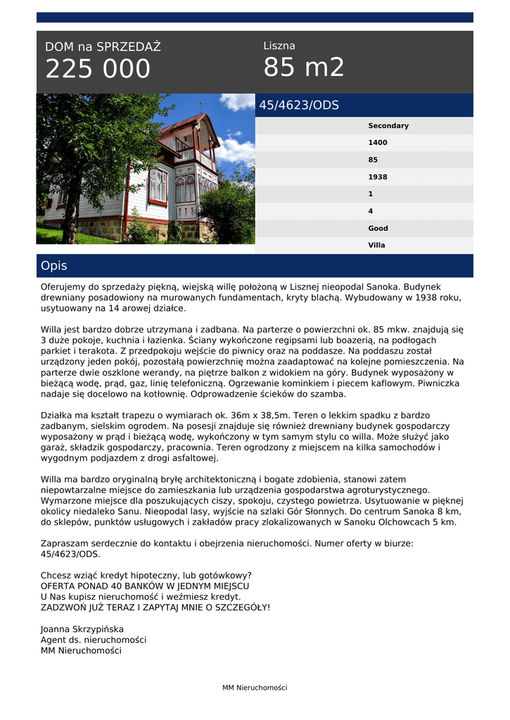 DOM na SPRZEDAŻ 225 000 Liszna 85 m2 45/4623/ODS Secondary 1400 85 1938 1 4 Good Villa Opis Oferujemy do sprzedaży piękną, wiejską willę położoną w Lisznej nieopodal Sanoka. Budynek drewniany posadowiony na murowanych fundamentach, kryty blachą. Wybudowany w 1938 roku, usytuowany na 14 arowej działce. Willa jest bardzo dobrze utrzymana i zadbana. Na parterze o powierzchni ok. 85 mkw. znajdują się 3 duże pokoje, kuchnia i łazienka. Ściany wykończone regipsami lub boazerią, na podłogach parkiet i terakota. Z przedpokoju wejście do piwnicy oraz na poddasze. Na poddaszu został urządzony jeden pokój, pozostałą powierzchnię można zaadaptować na kolejne pomieszczenia. Na parterze dwie oszklone werandy, na piętrze balkon z widokiem na góry. Budynek wyposażony w bieżącą wodę, prąd, gaz, linię telefoniczną. Ogrzewanie kominkiem i piecem kaflowym. Piwniczka nadaje się docelowo na kotłownię. Odprowadzenie ścieków do szamba. Działka ma kształt trapezu o wymiarach ok. 36m x 38,5m. Teren o lekkim spadku z bardzo zadbanym, sielskim ogrodem. Na posesji znajduje się również drewniany budynek gospodarczy wyposażony w prąd i bieżącą wodę, wykończony w tym samym stylu co willa. Może służyć jako garaż, składzik gospodarczy, pracownia. Teren ogrodzony z miejscem na kilka samochodów i wygodnym podjazdem z drogi asfaltowej. Willa ma bardzo oryginalną bryłę architektoniczną i bogate zdobienia, stanowi zatem niepowtarzalne miejsce do zamieszkania lub urządzenia gospodarstwa agroturystycznego. Wymarzone miejsce dla poszukujących ciszy, spokoju, czystego powietrza. Usytuowanie w pięknej okolicy niedaleko Sanu. Nieopodal lasy, wyjście na szlaki Gór Słonnych. Do centrum Sanoka 8 km, do sklepów, punktów usługowych i zakładów pracy zlokalizowanych w Sanoku Olchowcach 5 km. Zapraszam serdecznie do kontaktu i obejrzenia nieruchomości. Numer oferty w biurze: 45/4623/ODS. Chcesz wziąć kredyt hipoteczny, lub gotówkowy? OFERTA PONAD 40 BANKÓW W JEDNYM MIEJSCU U Nas kupisz nieruchomość i weźmiesz kredyt. ZADZWOŃ JUŻ TERAZ I ZAPYTAJ MNIE O SZCZEGÓŁY! Joanna Skrzypińska Agent ds. nieruchomości MM Nieruchomości MM Nieruchomości tel. 502 477 701 Oddział Sanok: ul. Szopena 10 tel. +48 13 492 41 61 +48 881-799-704 e-mail.: [email protected] MM Nieruchomości oddział w Sanoku tel. +48 13 492 41 61 +48 881-799-704 ZAPŁACISZ TYLKO WTEDY, KIEDY OKAŻEMY SIĘ SKUTECZNI! MM 360 tel. +48 881 799 704; +48 13 492 41 61 email: [email protected] MM Nieruchomości Powered by TCPDF (www.tcpdf.org)