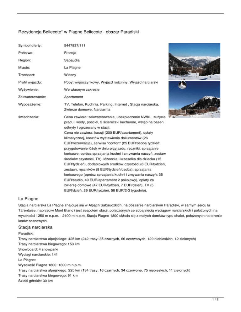 Rezydencja Bellecote* w Plagne Bellecote - obszar Paradiski Symbol oferty: 5447837/111 Państwo: Francja Region: Sabaudia Miasto: La Plagne Transport: Własny Profil wyjazdu: Pobyt wypoczynkowy, Wyjazd rodzinny, Wyjazd narciarski Wyżywienie: We własnym zakresie Zakwaterowanie: Apartament Wyposażenie: TV, Telefon, Kuchnia, Parking, Internet , Stacja narciarska, świadczenia: Cena zawiera: zakwaterowanie, ubezpieczenie NWKL, zużycie Zwierze domowe, Narciarnia prądu i wody, pościel, 2 ściereczki kuchenne, wstęp na basen odkryty i ogrzewany w stacji. Cena nie zawiera: kaucji (200 EUR/apartament), opłaty klimatycznej, kosztów wystawienia dokumentów (26 EUR/rezerwacja), serwisu "confort" (25 EUR/osoba tydzień: przygotowanie łóżek w dniu przyjazdu, ręczniki, sprzątanie końcowe, oprócz sprzątania kuchni i zmywania naczyń, zestaw środków czystości, TV), łóżeczka i krzesełka dla dziecka (15 EUR/tydzień), dodatkowych środków czystości (8 EUR/tydzień, zestaw), ręczników (8 EUR/tydzień/osoba), sprzątania końcowego (oprócz sprzątania kuchni i zmywania naczyń: 35 EUR/studio, 40 EUR/apartament 2 pokojowy), opłaty za zwierzę domowe (47 EUR/tydzień, 7 EUR/dzień), TV (5 EUR/dzień, 29 EUR/tydzień, 58 EUR/2-3 tygodnie). La Plagne Stacja narciarska La Plagne znajduje się w Alpach Sabaudzkich, na obszarze narciarskim Paradiski, w samym sercu la Tarentaise, naprzeciw Mont Blanc i jest zespołem stacji, połączonych ze sobą siecią wyciągów narciarskich i położonych na wysokości 1250 m n.p.m. - 2100 m n.p.m. Stacja Plagne 1800 składa się z małych domków typu chalet, położonych na terenie lasów sosnowych. Stacja narciarska Paradiski: Trasy narciarstwa alpejskiego: 425 km (242 trasy: 35 czarnych, 66 czerwonych, 129 niebieskich, 12 zielonych) Trasy narciarstwa biegowego: 153 km Snowboard: 4 snowparki Wyciągi narciarskie: 141 La Plagne: Wysokość Plagne 1800: 1800 m n.p.m. Trasy narciarstwa alpejskiego: 225 km (134 trasy: 16 czarnych, 34 czerwone, 75 niebieskich, 11 zielonych) Trasy narciarstwa biegowego: 91 km Szlaki górskie: 30 km 1/2 Wyciągi narciarskie: 105 Położenie Rezydencja położona jest na obszarze narciarskim Paradiski, u podnóża tras i oferuje wstęp gratis na basen odkryty i ogrzewany, położony w stacji narciarskiej Plagne Bellecote oraz restaurację, położoną w galerii handlowej, 30 m od rezydencji. Składa się z 2 budynków, zbudowanych z drewna i kamienia, położonych zaledwie 50 m od wyciągów narciarskich, sklepów i usług. Zakwaterowanie: sobota od godz. 17:00 Wykwaterowanie: sobota do godz. 10:00 Zakwaterowanie Apartament 2 pokojowy 5-osobowy: ok. 36 m2, różne ekspozycje, salon z 3 łóżkami 1-osobowymi, sypialnia z 2 łóżkami 1-osobowymi, aneks kuchenny (piec, lodówka, zmywarka), łazienka, oddzielne WC, telefon, gniazdko TV, odkurzacz, balkon (bez mebli ogrodowych). Club dla dzieci Stacja oferuje: mini-club dla dzieci od 2 lat, 100 m od rezydencji, ogród zabaw dla dzieci od 3 do 6 lat, 100 m od rezydencji. TERMINY: od: 2017-03-04 do: 2017-03-11 (8 dni), miejsca: zamów cena od: 465 PLN = 107 EUR od: 2017-03-11 do: 2017-03-18 (8 dni), miejsca: zamów cena od: 443 PLN = 102 EUR od: 2017-03-18 do: 2017-03-25 (8 dni), miejsca: zamów cena od: 443 PLN = 102 EUR od: 2017-03-25 do: 2017-04-01 (8 dni), miejsca: zamów cena od: 443 PLN = 102 EUR od: 2017-04-01 do: 2017-04-08 (8 dni), miejsca: zamów cena od: 443 PLN = 102 EUR od: 2017-04-08 do: 2017-04-15 (8 dni), miejsca: zamów cena od: 413 PLN = 95 EUR CENNIK: Długość pobytu: 8 dni 8 dni 8 dni Grupa cenowa: F1E6 E1D6 E 441 475 7 7 7 15 15 15 2.4 % 2.4 % 2.4 % Pobyt w obiekcie (do wyboru) (*) apartament 2 pokojowy 5-osobowy standardowo dla osób: 5 500 Ubezpieczenie (do wyboru) (*) ubezpieczenie NWKLSKI ubezpieczenie NWKL SKI Ubezpieczenie (opcjonalne) ubezpieczenie od kosztów rezygnacji Waluta: EUR Aktualne ceny z systemu S.A.R.T. (-) - cena usługi, podatku kalkulowana przy osobie lub gratis (*) - kwota wliczona w cenę standardową 2/2