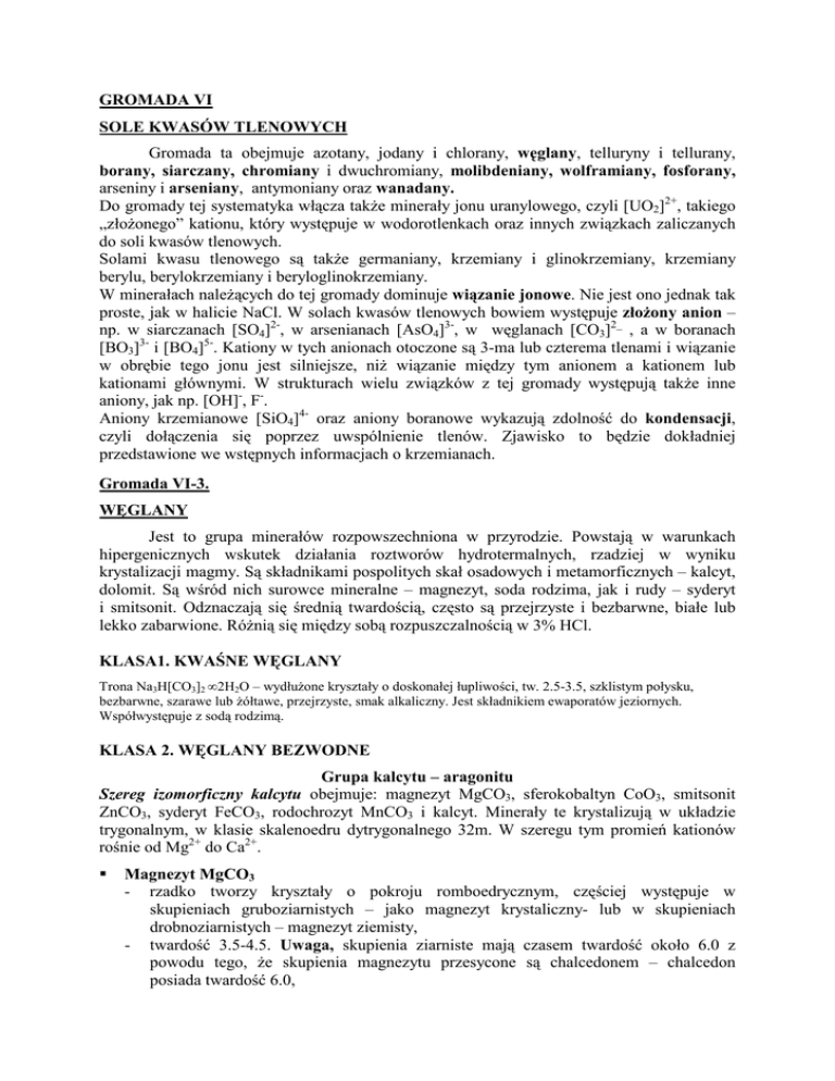 GROMADA VI SOLE KWASÓW TLENOWYCH Gromada ta obejmuje azotany, jodany i chlorany, węglany, telluryny i tellurany, borany, siarczany, chromiany i dwuchromiany, molibdeniany, wolframiany, fosforany, arseniny i arseniany, antymoniany oraz wanadany. Do gromady tej systematyka włącza takŜe minerały jonu uranylowego, czyli [UO2]2+, takiego „złoŜonego” kationu, który występuje w wodorotlenkach oraz innych związkach zaliczanych do soli kwasów tlenowych. Solami kwasu tlenowego są takŜe germaniany, krzemiany i glinokrzemiany, krzemiany berylu, berylokrzemiany i beryloglinokrzemiany. W minerałach naleŜących do tej gromady dominuje wiązanie jonowe. Nie jest ono jednak tak proste, jak w halicie NaCl. W solach kwasów tlenowych bowiem występuje złoŜony anion – np. w siarczanach [SO4]2-, w arsenianach [AsO4]3-, w węglanach [CO3]2_ , a w boranach [BO3]3- i [BO4]5-. Kationy w tych anionach otoczone są 3-ma lub czterema tlenami i wiązanie w obrębie tego jonu jest silniejsze, niŜ wiązanie między tym anionem a kationem lub kationami głównymi. W strukturach wielu związków z tej gromady występują takŜe inne aniony, jak np. [OH]-, F-. Aniony krzemianowe [SiO4]4- oraz aniony boranowe wykazują zdolność do kondensacji, czyli dołączenia się poprzez uwspólnienie tlenów. Zjawisko to będzie dokładniej przedstawione we wstępnych informacjach o krzemianach. Gromada VI-3. WĘGLANY Jest to grupa minerałów rozpowszechniona w przyrodzie. Powstają w warunkach hipergenicznych wskutek działania roztworów hydrotermalnych, rzadziej w wyniku krystalizacji magmy. Są składnikami pospolitych skał osadowych i metamorficznych – kalcyt, dolomit. Są wśród nich surowce mineralne – magnezyt, soda rodzima, jak i rudy – syderyt i smitsonit. Odznaczają się średnią twardością, często są przejrzyste i bezbarwne, białe lub lekko zabarwione. RóŜnią się między sobą rozpuszczalnością w 3% HCl. KLASA1. KWAŚNE WĘGLANY Trona Na3H[CO3]2 • 2H2O – wydłuŜone kryształy o doskonałej łupliwości, tw. 2.5-3.5, szklistym połysku, bezbarwne, szarawe lub Ŝółtawe, przejrzyste, smak alkaliczny. Jest składnikiem ewaporatów jeziornych. Współwystępuje z sodą rodzimą. KLASA 2. WĘGLANY BEZWODNE Grupa kalcytu – aragonitu Szereg izomorficzny kalcytu obejmuje: magnezyt MgCO3, sferokobaltyn CoO3, smitsonit ZnCO3, syderyt FeCO3, rodochrozyt MnCO3 i kalcyt. Minerały te krystalizują w układzie trygonalnym, w klasie skalenoedru dytrygonalnego 32m. W szeregu tym promień kationów rośnie od Mg2+ do Ca2+. Magnezyt MgCO3 - rzadko tworzy kryształy o pokroju romboedrycznym, częściej występuje w skupieniach gruboziarnistych – jako magnezyt krystaliczny- lub w skupieniach drobnoziarnistych – magnezyt ziemisty, - twardość 3.5-4.5. Uwaga, skupienia ziarniste mają czasem twardość około 6.0 z powodu tego, Ŝe skupienia magnezytu przesycone są chalcedonem – chalcedon posiada twardość 6.0, - łupliwość romboedryczna (10 1 1) kryształy są bezbarwne, a skupienia ziarniste są białe, szarawe, Ŝółtawe lub brunatne; połysk kryształów szklisty, skupień drobnoziarnistych – matowy, rozpuszcza się w gorącym HCl, magnezyt ziarnisty powstaje jako produkt hydrotermalny w łupkach talkowych lub w dolomitach, magnezyt ziemisty, zbity powstaje jako jeden z produktów przeobraŜenia zasadowych i ultrazasadowych skał magmowych (serpentynizacji), współwystępuje z serpentynami, opalem i chalcedonem często z jego zieloną odmianą – chryzoprazem, występowanie w Polsce: serpentynity w Górach Sowich, masywu Sobótki, Jordanowa, Szklar, Wir, Grochowej i Braszowic. Syderyt FeCO3 - tworzy kryształy romboedryczne, częściej występuje w skupieniach ziarnistych, zbitych, - w skałach ilastych, często wraz z minerałami ilastymi i kalcytem tworzy konkrecje, zwane sferosyderytami, - tworzy takŜe skupienia sferolitowe i oolitowe, - -tw. 3.5-4.5, doskonała łupliwość romboedryczna (10 1 1), - barwa biaława, Ŝółtawa, brunatna, szarawa: rysa biała. Uwaga ciemniejsza rysa niektórych syderytów spowodowana jest nalotami bądź domieszkami tlenków lub tlenowodorotlenków Ŝelaza. - ulega działaniu silnych kwasów, rozpuszcza się w gorącym HCl, - często zawiera domieszki Ca, Mg i Mn; tworzy roztwory stałe ze smitsonitem (ZnCO3) – monheimity, - krystalizuje w wodnych środowiskach redukcyjnych, znany jako minerał hydrotermalny, zwłaszcza w Ŝyłach kruszconośnych, syderyty ilaste powstają najczęściej na szelfach kontynentalnych, pod wpływem utleniania i wody przeobraŜa się w wodorotlenki Ŝelaza, - występowanie w Polsce: osady jury brunatnej okręgu częstochowskiego, takŜe w karbońskich osadach ilastych GZW i LZW, w osadach ilastych fliszu karpackiego i Ŝyłach hydrotermalnych minerałów kruszcowych Dolnego Śląska, np. Nowa Ruda. Rodochrozyt MnCO3 - niezbyt często wykształca kryształy, wtedy przewaŜa postać skalenoedru i romboedru, - częściej występuje w postaci skupień ziarnistych, promienistych, zbitych, naskorupień, - często zawiera domieszki Ca, Fe Mg i Zn; tworzy szeregi izomorficzne z kalcytem i syderytem, - tw. 3.5-4.0; typowa łupliwość romboedryczna (10 1 1), - barwa róŜowa lub malinowa, - najczęściej występuje w osadach głębokomorskich, oraz w Ŝyłach hydrotermalnych i utworach metasomatowych zawierających Mn, - ulega przeobraŜeniu w tlenki i wodorotlenki manganu. Kalcyt CaCO3 - powszechnie tworzy kryształy, często o duŜej liczbie postaci – romboedry, skalenoedry, słupy; często tworzy szczotki krystaliczne. Stwierdzono zaleŜność występowania postaci krystalograficznych od warunków krystalizacji – stęŜenia CO2, - - - pospolicie występuje w skupieniach ziarnistych, takŜe zbitych, tworzy skupienia oolitowe oraz naciekowe (znane ze zjawisk krasowych stalaktyty i stalagmity); znane są takŜe skupienia cienkosłupowe, włókniste, tw. 3.0; doskonała łupliwość romboedryczna (10 1 1), 