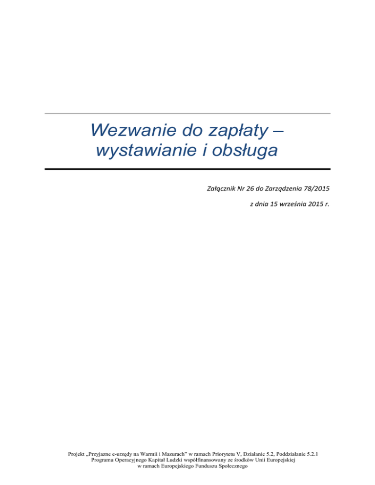 Wezwanie do zapłaty – wystawianie i obsługa Załącznik Nr 26 do Zarządzenia 78/2015 z dnia 15 września 2015 r. Projekt „Przyjazne e-urzędy na Warmii i Mazurach” w ramach Priorytetu V, Działanie 5.2, Poddziałanie 5.2.1 Programu Operacyjnego Kapitał Ludzki współfinansowany ze środków Unii Europejskiej w ramach Europejskiego Funduszu Społecznego Spis treści Użyte pojęcia skróty.........................................................................................................................3 Wprowadzenie.................................................................................................................................3 Wezwanie do zapłaty – wystawianie i obsługa................................................................................3 Informacje, kogo dotyczy procedura................................................................................................4 Wymagane dokumenty do realizacji procedury...............................................................................4 Miejsce składania dokumentów.......................................................................................................4 Opłaty..............................................................................................................................................4 Tryb odwoławczy.............................................................................................................................4 Podstawa prawna.............................................................................................................................4 Załączniki..........................................................................................................................................4 Projekt „Przyjazne e-urzędy na Warmii i Mazurach” w ramach Priorytetu V, Działanie 5.2, Poddziałanie 5.2.1 Programu Operacyjnego Kapitał Ludzki współfinansowany ze środków Unii Europejskiej w ramach Europejskiego Funduszu Społecznego 2 Użyte pojęcia skróty Nie dotyczy Wprowadzenie Przedmiotem procedury jest przedstawienie postępowania windykacyjnego w Urzędzie Gminy Kętrzyn, zmierzającego do wyegzekwowania niezapłaconych w terminie, należności cywilnoprawnych, grzywien nałożonych w drodze mandatu karnego oraz innych należności, do których nie stosuje się przepisów ustawy – Ordynacja podatkowa, stanowiących dochód Gminy oraz Skarbu Państwa. Wezwanie do zapłaty – wystawianie i obsługa Role: Wójt Gminy Kętrzyn – organ prowadzący windykacje w stosunku do należności cywilnoprawnych. Przebieg procedury: KROK 1. Weryfikacja terminu płatności poszczególnych zobowiązań pieniężnych. Organ właściwy na bieżąco kontroluje i weryfikacje terminy zapłaty poszczególnych zobowiązań pieniężnych z tytułu należności cywilnoprawnych. Należności stają się zaległościami następnego dnia po upływie terminu płatności, jeżeli nie jest on dniem ustawowo wolnym od pracy. Jeżeli termin płatności przypada na dzień ustawowo wolny od pracy, terminem płatności jest następny najbliższy dzień powszedni (roboczy). W przypadku nieterminowego regulowania należności naliczane są odsetki za opóźnienie. Uczestnicy: Wójt Gminy Kętrzyn KROK 2. Wystawienie wezwania do zapłaty. W przypadku braku uregulowania należności, organ właściwy wystawia wezwanie do zapłaty. Wezwanie do zapłaty zawiera: imię i nazwisko adresata lub nazwę firmy, należność główną, odsetki, termin płatności, numer rachunku bankowego, na który należy uiścić należność, informację o zagrożeniu skierowania sprawy na drogę postępowania sądowego. Wezwania są numerowane narastająco w danym roku kalendarzowym i ewidencjonowane w prowadzonej dla danego rodzaju należności ewidencji wezwań. Uczestnicy: Wójt Gminy Kętrzyn KROK 3. Wysyłka wezwania. Projekt „Przyjazne e-urzędy na Warmii i Mazurach” w ramach Priorytetu V, Działanie 5.2, Poddziałanie 5.2.1 Programu Operacyjnego Kapitał Ludzki współfinansowany ze środków Unii Europejskiej w ramach Europejskiego Funduszu Społecznego 3 Wezwanie do zapłaty może zostać doręczone podatnikowi drogą tradycyjną za zwrotnym potwierdzeniem odbioru, jak również dostarczone w formie dokumentu elektronicznego w przypadku wyrażenia przez podatnika zgody na komunikację drogą elektroniczną. Uczestnicy: Wójt Gminy Kętrzyn Informacje, kogo dotyczy procedura Procedura dotyczy każdego podmiotu, który posiada nieuregulowane we wskazanym terminie zobowiązania wynikające z tytułu należności cywilnoprawnych. Wymagane dokumenty do realizacji procedury Nie dotyczy Miejsce składania dokumentów Nie dotyczy Opłaty Nie dotyczy Tryb odwoławczy Nie dotyczy Podstawa prawna 1. Ustawa z dnia 23 kwietnia 1964 r. - Kodeks cywilny (Dz. U. 2014 nr 0 poz. 121). Załączniki Nie dotyczy Projekt „Przyjazne e-urzędy na Warmii i Mazurach” w ramach Priorytetu V, Działanie 5.2, Poddziałanie 5.2.1 Programu Operacyjnego Kapitał Ludzki współfinansowany ze środków Unii Europejskiej w ramach Europejskiego Funduszu Społecznego 4