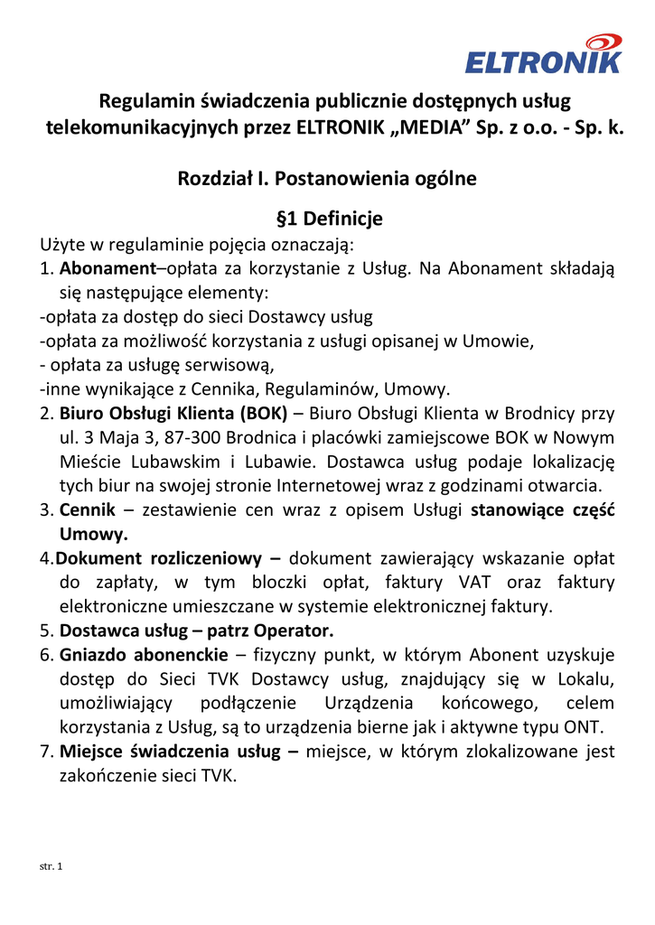 Regulamin świadczenia publicznie dostępnych usług telekomunikacyjnych przez ELTRONIK „MEDIA” Sp. z o.o. - Sp. k. Rozdział I. Postanowienia ogólne §1 Definicje Użyte w regulaminie pojęcia oznaczają: 1. Abonament–opłata za korzystanie z Usług. Na Abonament składają się następujące elementy: -opłata za dostęp do sieci Dostawcy usług -opłata za możliwość korzystania z usługi opisanej w Umowie, - opłata za usługę serwisową, -inne wynikające z Cennika, Regulaminów, Umowy. 2. Biuro Obsługi Klienta (BOK) – Biuro Obsługi Klienta w Brodnicy przy ul. 3 Maja 3, 87-300 Brodnica i placówki zamiejscowe BOK w Nowym Mieście Lubawskim i Lubawie. Dostawca usług podaje lokalizację tych biur na swojej stronie Internetowej wraz z godzinami otwarcia. 3. Cennik – zestawienie cen wraz z opisem Usługi stanowiące część Umowy. 4.Dokument rozliczeniowy – dokument zawierający wskazanie opłat do zapłaty, w tym bloczki opłat, faktury VAT oraz faktury elektroniczne umieszczane w systemie elektronicznej faktury. 5. Dostawca usług – patrz Operator. 6. Gniazdo abonenckie – fizyczny punkt, w którym Abonent uzyskuje dostęp do Sieci TVK Dostawcy usług, znajdujący się w Lokalu, umożliwiający podłączenie Urządzenia końcowego, celem korzystania z Usług, są to urządzenia bierne jak i aktywne typu ONT. 7. Miejsce świadczenia usług – miejsce, w którym zlokalizowane jest zakończenie sieci TVK. str. 1 8. Numer Ewidencyjny - nadany Abonentowi przez Dostawcę usług numer identyfikacyjny w celu ułatwienia dokonywania rozliczeń i komunikowania się z Dostawcą usług. 9. Okres rozliczeniowy-– miesiąc kalendarzowy. 10. Operator – ELTRONIK „Media” Sp. z o. o. – Sp. k. z siedzibą w Brodnicy, adres 87-300 Brodnica ul. 3 Maja 3, zarejestrowany w Sądzie Rejonowym w Toruniu VII Wydział Gospodarczy Krajowego Rejestru Sądowego, pod numerem KRS 0000318789, legitymujący się numerem NIP 874-15-88-284, REGON 871522439 oraz zarejestrowany w Rejestrze przedsiębiorstw telekomunikacyjnych prowadzonych przez Prezesa UKE pod numerem 1674. 11. Pakiet TVK- zestawienie programów telewizyjnych oferowanych przez Dostawcę usług. 12. Plan taryfowy – zakres usługi telefonii stacjonarnej. 13. Protokół Odbioru i Aktywacji- Usługi - dokument, w którym Abonent potwierdza przyjęcie do używania Sprzętu Operatora oraz potwierdza prawidłowy montaż i/lub sprawne funkcjonowanie Zakończenia Sieci i/lub Sprzętu Operatora niezbędnych do świadczenia Usług. 14. Regulamin – niniejszy Regulamin świadczenia usług telekomunikacyjnych przez Operatora, stanowiący część Umowy. 15. Regulamin promocji – regulamin zawierający zasady świadczenia Usług przez Operatora na warunkach innych niż określone w Regulaminie i Cenniku. Jeżeli zapisy w Regulaminie promocji stanowią inaczej niż zapisy w Regulaminie, Umowie lub Cenniku, to obowiązują zapisy Regulaminu promocji, ale tylko w przypadku, gdy Umowa została zawarta na warunkach promocji, stanowiącej część Umowy. 16. Rozliczenie miesięczne kosztów rozmów telefonicznych -kwota należna Dostawcy usług, obejmująca Abonament wraz z kwotą opłat za Połączenia z ostatniego Okresu rozliczeniowego, będąca podstawa do naliczania przez Dostawcę usług opłat za korzystanie z Usługi. str. 2 17. Sieć TVK – będąca własnością Operatora lub posiadana przez niego na podstawie innego tytułu prawnego, sieć telekomunikacyjna służąca do świadczenia Usług. 18. Sprzęt Operatora / Sprzęt – rzeczy oddane Abonentowi do odpłatnego lub nieodpłatnego używania na czas trwania Umowy będące własnością Dostawcy usług lub posiadane przez niego na podstawie innego tytułu prawnego, w tym przykładowo ONT, karta dekodująca. 19. Terminal abonencki – komputer lub inne Urządzenie końcowe umożliwiające odbiór, nadawanie, i przetwarzanie danych wykorzystywany przez Abonenta dla potrzeb korzystania z Usług świadczonych na podstawie Umowy. 20. Umowa - umowa o świadczenie usług telekomunikacyjnych w zakresie określonej usługi/usług zawarta pomiędzy Operatorem a Abonentem. 21. Urządzenie końcowe – urządzenie stanowiące własność Abonenta lub będące w jego posiadaniu na podstawie innego niż własność prawa, w szczególności aparat telefoniczny, komputer, telewizor lub inne podobne urządzenie umożliwiające Abonentowi korzystanie z Usług. 22. Usługi / Publicznie dostępne usługi telekomunikacyjne określone w niniejszym Regulaminie lub Umowie, usługi telekomunikacyjne łącznie ze świadczonymi Usługami dodatkowymi, w tym w szczególności: a)usługi w zakresie telewizji kablowej – dostarczanie programów metodą transmisji sygnału telewizyjnego, b)usługi telefonii stacjonarnej - ustanawianie Połączeń głosowych za pomocą Sieci pozwalających na dwukierunkowa łączność, c)usługi transmisji danych z dostępem do Internetu – zapewnienie transmisji danych, w tym dostępu do Internetu za pośrednictwem Sieci, d) inne – zgodnie z aktualną ofertą Usług Operatora. 23. Usługi dodatkowe – usługi towarzyszące Usłudze wymienione w Cenniku. str. 3 §2 Przedmiot Regulaminu. Regulamin określa zakres i warunki świadczenia Usług przez Dostawcę usług. §3 Zakres świadczenia Usług. 1. Dostawca usług zobowiązuje się do świadczenia Usług w zasięgu istniejących możliwości technicznych, zgodnie z Cennikiem i Regulaminem oraz Regulaminem promocji, na warunkach określonych w Umowie. 2. Nie stanowi zmiany Oferty Programowej usługi telewizji kablowej zmiana kolejności emisji programów w ramach tego samego Pakietu Programowego, zmiana sposobu nadawania obrazu i/lub dźwięku w programach telewizyjnych. Dostawca usług może udostępnić Abonentowi bez dodatkowych opłat dodatkowe programy w ramach Oferty Programowej, w szczególności w okresach testowych lub promocyjnych. Udostępnienie, jak i wycofanie takiego programu nie wymaga zmiany Umowy. Rozd