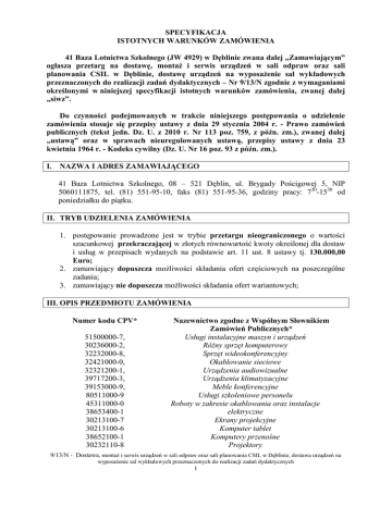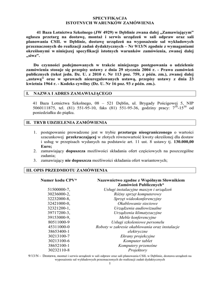 SPECYFIKACJA ISTOTNYCH WARUNKÓW ZAMÓWIENIA 41 Baza Lotnictwa Szkolnego (JW 4929) w Dęblinie zwana dalej „Zamawiającym” ogłasza przetarg na dostawę, montaż i serwis urządzeń w sali odpraw oraz sali planowania CSIL w Dęblinie, dostawę urządzeń na wyposażenie sal wykładowych przeznaczonych do realizacji zadań dydaktycznych – Nr 9/13/N zgodnie z wymaganiami określonymi w niniejszej specyfikacji istotnych warunków zamówienia, zwanej dalej „siwz”. Do czynności podejmowanych w trakcie niniejszego postępowania o udzielenie zamówienia stosuje się przepisy ustawy z dnia 29 stycznia 2004 r. - Prawo zamówień publicznych (tekst jedn. Dz. U. z 2010 r. Nr 113 poz. 759, z późn. zm.), zwanej dalej „ustawą” oraz w sprawach nieuregulowanych ustawą, przepisy ustawy z dnia 23 kwietnia 1964 r. - Kodeks cywilny (Dz. U. Nr 16 poz. 93 z późn. zm.). I. NAZWA I ADRES ZAMAWIAJĄCEGO 41 Baza Lotnictwa Szkolnego, 08 – 521 Dęblin, ul. Brygady Pościgowej 5, NIP 5060111875, tel. (81) 551-95-10, faks (81) 551-95-36, godziny pracy: 730-1530 od poniedziałku do piątku. II. TRYB UDZIELENIA ZAMÓWIENIA 1. postępowanie prowadzone jest w trybie przetargu nieograniczonego o wartości szacunkowej przekraczającej w złotych równowartość kwoty określonej dla dostaw i usług w przepisach wydanych na podstawie art. 11 ust. 8 ustawy tj. 130.000,00 Euro; 2. zamawiający dopuszcza możliwości składania ofert częściowych na poszczególne zadania; 3. zamawiający nie dopuszcza możliwości składania ofert wariantowych; III. OPIS PRZEDMIOTU ZAMÓWIENIA Numer kodu CPV* 51500000-7, 30236000-2, 32232000-8, 32421000-0, 32321200-1, 39717200-3, 39153000-9, 80511000-9 45311000-0 38653400-1 30213100-7 30213100-6 38652100-1 30232110-8 Nazewnictwo zgodne z Wspólnym Słownikiem Zamówień Publicznych* Usługi instalacyjne maszyn i urządzeń Różny sprzęt komputerowy Sprzęt wideokonferencyjny Okablowanie sieciowe Urządzenia audiowizualne Urządzenia klimatyzacyjne Meble konferencyjne Usługi szkoleniowe personelu Roboty w zakresie okablowania oraz instalacje elektryczne Ekrany projekcyjne Komputer tablet Komputery przenośne Projektory 9/13/N - Dostawa, montaż i serwis urządzeń w sali odpraw oraz sali planowania CSIL w Dęblinie, dostawa urządzeń na wyposażenie sal wykładowych przeznaczonych do realizacji zadań dydaktycznych 1 1. Drukarki laserowe Przedmiotem zamówienia jest dostawa, montaż i serwis urządzeń w sali odpraw oraz sali planowania CSIL w Dęblinie – zadanie I, dostawa urządzeń na wyposażenie sal wykładowych przeznaczonych do realizacji zadań dydaktycznych – zadanie II, których szczegółowy zakres został określony w załączniku Nr 1a do siwz. IV. TERMIN WYKONANIA ZAMÓWIENIA 1. Termin realizacji zamówienia: a) Zadanie I – w terminie maksymalnie 90 dni od dnia podpisania umowy, nie dłużej jednak niż do 23 sierpnia 2013 roku. b) Zadanie II – w maksymalnie na trzy miesiące od daty podpisania umowy na wykonanie usługi nie później jednak niż do 30 września 2013 roku. 2. Forma płatności: Rozliczenie za wykonaną dostawę nastąpi przelewem, w terminie 30 dni (trzydziestu dni) od dnia otrzymania przez Zamawiającego prawidłowo wystawionej faktury VAT. Zapłata nastąpi na rachunek bankowy Wykonawcy wynikający z faktury. Za dzień spełnienia świadczenia uznaje się dzień obciążenia rachunku bankowego Zamawiającego. V. WARUNKI UDZIAŁU W POSTĘPOWANIU ORAZ OPIS DOKONYWANIA OCENY SPEŁNIANIA TYCH WARUNKÓW SPOSOBU 1) O udzielenie zamówienia mogą ubiegać się Wykonawcy, którzy spełniają warunki określone przepisami art. 22 ust. 1 ustawy z dnia 29 stycznia 2004r. Prawo zamówień publicznych (Dz. U. z 2010 r. Nr 113, poz. 759 z późn. zm.) dotyczące: a) Posiadania uprawnień do wykonywania określonej działalności lub czynności, jeżeli przepisy prawa nakładają obowiązek ich posiadania. Warunek ten spełnią wykonawcy, którzy złożą oświadczenie w trybie art.22 ust.1 ustawy Prawo zamówień publicznych. b) Posiadania wiedzy i doświadczenia Warunek ten spełnią wykonawcy, którzy przedstawią wykaz wykonanych, a w przypadku świadczeń okresowych lub ciągłych również wykonywanych, głównych dostaw na dostawę i montaż urządzeń i wyposażenia sal szkoleniowych o wartości co najmniej 400 000,00 zł – Zadanie I, dostawę urządzeń sal szkoleniowych o wartości co najmniej 150 000,00 zł – Zadanie II, w okresie ostatnich trzech lat przed upływem terminu składania ofert albo wniosków o dopuszczenie do udziału w postępowaniu, a jeżeli okres prowadzenia działalności jest krótszy – w tym okresie, wraz z podaniem ich wartości, przedmiotu, dat wykonania i podmiotów, na rzecz których dostawy lub usługi zostały wykonane, oraz załączeniem dowodów, czy zostały wykonane lub są wykonywane należycie; c) Dysponowania odpowiednim potencjałem technicznym oraz osobami zdolnymi do wykonania zamówienia. 9/13/N - Dostawa, montaż i serwis urządzeń w sali odpraw oraz sali planowania CSIL w Dęblinie, dostawa urządzeń na wyposażenie sal wykładowych przeznaczonych do realizacji zadań dydaktycznych 2 Warunek ten spełnią wykonawcy, którzy przedstawią wykazu osób(dotyczy tylko Zadania II), które będą uczestniczyć w wykonywaniu zamówienia tj., że dysponuje zespołem osób w skład, którego wchodzą co najmniej: - Kierownik projektu – wykształcenie wyższe techniczne ( akustyka, inżynieria dźwięku) lub pokrewne, posiadający uprawnienia SEP 1 kV - Eksploatacja, Certyfikat – cyfrowe platformy DSP, - Instalatorzy – zespół co najmniej 3 osób (instalatorów), posiadających minimum 3 letnie doświadczenie zawodowe w obszarze systemów audiowizualnych, wraz z informacjami na temat ich kwalifikacji zawodowych, doświadczenia i wykształcenia niezbędnych do wykonania zamówienia, a także zakresu wykonywanych przez nie czynności, oraz informacją o podstawie do dysponowania tymi osoba