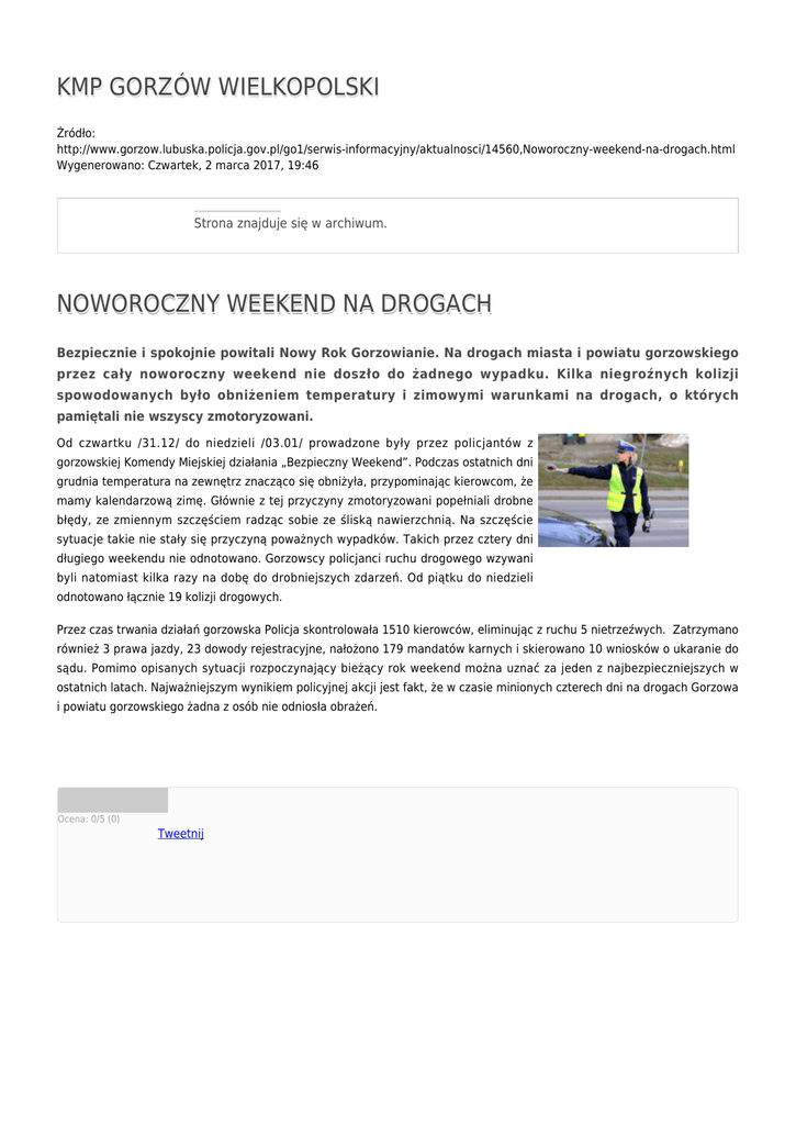 KMP GORZÓW WIELKOPOLSKI Źródło: http://www.gorzow.lubuska.policja.gov.pl/go1/serwis-informacyjny/aktualnosci/14560,Noworoczny-weekend-na-drogach.html Wygenerowano: Czwartek, 2 marca 2017, 19:46 Strona znajduje się w archiwum. NOWOROCZNY WEEKEND NA DROGACH Bezpiecznie i spokojnie powitali Nowy Rok Gorzowianie. Na drogach miasta i powiatu gorzowskiego przez cały noworoczny weekend nie doszło do żadnego wypadku. Kilka niegroźnych kolizji spowodowanych było obniżeniem temperatury i zimowymi warunkami na drogach, o których pamiętali nie wszyscy zmotoryzowani. Od czwartku /31.12/ do niedzieli /03.01/ prowadzone były przez policjantów z gorzowskiej Komendy Miejskiej działania „Bezpieczny Weekend”. Podczas ostatnich dni grudnia temperatura na zewnętrz znacząco się obniżyła, przypominając kierowcom, że mamy kalendarzową zimę. Głównie z tej przyczyny zmotoryzowani popełniali drobne błędy, ze zmiennym szczęściem radząc sobie ze śliską nawierzchnią. Na szczęście sytuacje takie nie stały się przyczyną poważnych wypadków. Takich przez cztery dni długiego weekendu nie odnotowano. Gorzowscy policjanci ruchu drogowego wzywani byli natomiast kilka razy na dobę do drobniejszych zdarzeń. Od piątku do niedzieli odnotowano łącznie 19 kolizji drogowych. Przez czas trwania działań gorzowska Policja skontrolowała 1510 kierowców, eliminując z ruchu 5 nietrzeźwych. Zatrzymano również 3 prawa jazdy, 23 dowody rejestracyjne, nałożono 179 mandatów karnych i skierowano 10 wniosków o ukaranie do sądu. Pomimo opisanych sytuacji rozpoczynający bieżący rok weekend można uznać za jeden z najbezpieczniejszych w ostatnich latach. Najważniejszym wynikiem policyjnej akcji jest fakt, że w czasie minionych czterech dni na drogach Gorzowa i powiatu gorzowskiego żadna z osób nie odniosła obrażeń. Ocena: 0/5 (0) Tweetnij