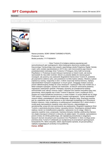 SFT Computers Utworzono: sobota, 08 marzec 2014 Nowości SONY GRAN TURISMO 6 PS3/PL Nazwa produktu: SONY GRAN TURISMO 6 PS3/PL Producent: Sony Model produktu: 711719249474 Gran Turismo 6 to kolejna odsłona popularnej serii samochodowych gier wyścigowych, która tradycyjnie stworzona została przez Kazunoriego Yamauchiego oraz zespół z japońskiego studia Polyphony Digital. Szósta część cyklu została zapowiedziana w 2013 roku i jest równocześnie jego trzecim przedstawicielem (wliczając Gran Turisomo 5 Prologue), który trafił na konsolę PlayStation 3. Produkcja nie jest milowym kamieniem w historii marki, ale twórcy wprowadzili do niej wiele nowinek, którym co prawda daleko do rewolucyjnych rozwiązań, ale powinny one zadowolić długoletnich fanów.Gran Turismo 6, podobnie jak poprzednia odsłona cyklu, jest podzielone na kilka trybów zabawy. Możemy wybrać pojedynczy wyścig, rozgrywkę w sieci, a także rozpocząć karierę kierowcy, będącą odpowiednikiem kampanii singleplayer w innych grach. Osiągając kolejne sukcesy powoli odblokowujemy dostęp do coraz droższych i szybszych klas oraz modeli aut, a także rodzajów wyścigów, wyzwań lub mistrzostw, za których ukończenie jesteśmy nagradzani zastrzykiem gotówki. Pieniędzy używamy do powiększenia kolekcji samochodów oraz zakupu nowych części i ulepszeń.Gra zawiera wszystkie trasy oraz samochody, które pojawiły się w Gran Turismo 5 (łącznie z tymi z wydanych DLC). Zestaw aut został dodatkowo poszerzony o nowe modele i w sumie składa się na niego 1200 maszyn. Podobnie sprawa ma się z trasami wyścigowymi. Twórcy wprowadzili 7 nowych lokacji, posiadających różne konfiguracje i długości dróg. Znaczącą nowinką jest np. pojawienie się po raz pierwszy w serii sławnego brytyjskiego toru Silverstone. Kolejne maszyny i trasy znajdziemy w publikowanych zestawach DLC.Jeżeli chodzi o model jazdy wprowadzono zupełnie nowy silnik fizyczny, odpowiadający za aerodynamikę, pracę kół oraz zachowanie się zawieszenia. Długoletni wyjadacze Gran Turismo z pewnością docenią zmianę i zauważą różnice. Deweloperzy postawili także większy nacisk na modyfikowanie pojazdów i wpływanie na ich osiągi. Ułatwi to zapewne zupełnie nowy, przejrzysty i bardziej intuicyjny interfejs użytkownika.Oprawa nie uległa znaczącym zmianom w stosunku do piątej części. Co prawda, wprowadzono pewne zmiany do silnika graficznego, ale największą przeszkodą w osiągnięciu lepszych doznań wizualnych jest oczywiście moc PlayStation 3, które na długo przez premierą Gran Turismo 6 odstawało już wydajnością od przeciętnych gamingowych komputerów PC. Mimo wszystko, talent Japończyków sprawia, że gra jest jedną z najlepiej wyglądających produkcji na tę platformę. Cena: 235zł http://sft.net.pl | [email protected] | | Strona 1/2 SFT Computers Utworzono: sobota, 08 marzec 2014 Nowości SONY GRAN TURISMO 6 PS3/PL Dostępność: Ten produkt został dodany do sklepu w dniu poniedziałek, 09 grudzień 2013 http://sft.net.pl | [email protected] | | Strona 2/2
