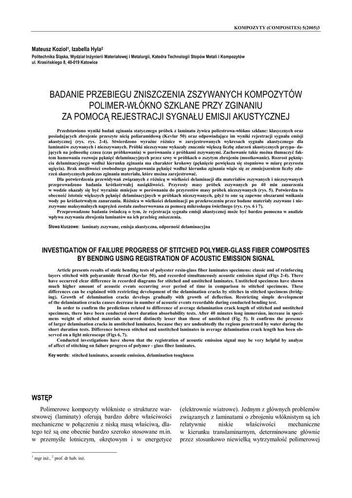 KOMPOZYTY (COMPOSITES) 5(2005)3 Mateusz Kozioł1, Izabella Hyla2 Politechnika Śląska, Wydział Inżynierii Materiałowej i Metalurgii, Katedra Technologii Stopów Metali i Kompozytów ul. Krasińskiego 8, 40-019 Katowice BADANIE PRZEBIEGU ZNISZCZENIA ZSZYWANYCH KOMPOZYTÓW POLIMER-WŁÓKNO SZKLANE PRZY ZGINANIU ZA POMOCĄ REJESTRACJI SYGNAŁU EMISJI AKUSTYCZNEJ Przedstawiono wyniki badań zginania statycznego próbek z laminatu żywica poliestrowa-włókno szklane: klasycznych oraz posiadających zbrojenie przeszyte nicią poliaramidową (Kevlar 50) oraz odpowiadające im wyniki rejestracji sygnału emisji akustycznej (rys. rys. 2-4). Stwierdzono wyraźne różnice w zarejestrowanych wykresach sygnału akustycznego dla laminatów zszywanych i niezszywanych. Próbki niezszywane wykazały znacznie większą liczbę zdarzeń akustycznych przypa- dających na jednostkę czasu (czas próbkowania) w porównaniu z próbkami zszywanymi. Zachowanie takie można tłumaczyć faktem hamowania rozwoju pęknięć delaminacyjnych przez szwy w próbkach o zszytym zbrojeniu (mostkowanie). Rozrost pęknięcia delaminacyjnego wzdłuż kierunku zginania ma charakter krokowy (pęknięcie powiększa się stopniowo w miarę przyrostu ugięcia). Brak możliwości swobodnego postępowania pęknięć wzdłuż kierunku zginania wiąże się ze zmniejszeniem liczby zdarzeń akustycznych podczas zginania materiału, które można zarejestrować. Dla potwierdzenia przewidywań związanych z różnicą w wielkości delaminacji dla materiałów zszywanych i niezszywanych przeprowadzono badania krótkotrwałej nasiąkliwości. Przyrosty masy próbek zszywanych po 40 min zanurzenia w wodzie okazały się być wyraźnie mniejsze w porównaniu do przyrostów masy próbek niezszywanych (rys. 5). Potwierdza to obecność istotnie większych pęknięć delaminacyjnych w próbkach niezszywanych, gdyż to one są zapewne obszarami wnikania wody po krótkotrwałym zanurzaniu. Różnica w wielkości delaminacji po przekroczeniu przez badane materiały zszywane i niezszywane maksymalnych naprężeń została zaobserwowana za pomocą mikroskopu świetlnego (rys. rys. 6 i 7). Przeprowadzone badania świadczą o tym, że rejestracja sygnału emisji akustycznej może być bardzo pomocna w analizie wpływu zszywania zbrojenia laminatów na ich przebieg zniszczenia. Słowa kluczowe: laminaty zszywane, emisja akustyczna, odporność delaminacyjna INVESTIGATION OF FAILURE PROGRESS OF STITCHED POLYMER-GLASS FIBER COMPOSITES BY BENDING USING REGISTRATION OF ACOUSTIC EMISSION SIGNAL Article presents results of static bending tests of polyester resin-glass fiber laminates specimens: classic and of reinforcing layers stitched with polyaramide thread (Kevlar 50), and recorded simultaneously acoustic emission signal (Figs 2-4). There have occurred clear difference in recorded diagrams for stitched and unstitched laminates. Unstitched specimens have shown much higher amount of acoustic events occurring over period of time in comparison to stitched specimens. These differences can be explained with restricting development of the delamination cracks by stitches in stitched specimens (bridging). Growth of delamination cracks develops gradually with growth of deflection. Restricting simple development of the delamination cracks causes decrease in number of acoustic events recordable during conducted bending test. In order to confirm the predictions related to difference of average delamination crack length of stitched and unstitched specimens, there have been conducted short duration absorbability tests. After 40 minutes long immersion, increase in specimens weight of stitched materials occurred distinctly lesser than those of unstitched (Fig. 5). It confirms the presence of larger delamination cracks in unstitched laminates, because they are undoubtedly the regions penetrated by water during the short duration tests. Difference between stitched and unstitched laminates in average delamination crack length has been observed on a light microscope (Figs 6, 7). Conducted investigations have shown that the registration of acoustic emission signal may be very helpful by analyze of affect of stitching on failure progress of polymer - glass fiber laminates. Key words: stitched laminates, acoustic emission, delamination toughness WSTĘP Polimerowe kompozyty włókniste o strukturze warstwowej (laminaty) oferują bardzo dobre właściwości mechaniczne w połączeniu z niską masą właściwą, dlatego też są one obecnie bardzo szeroko stosowane m.in. w przemyśle lotniczym, okrętowym i w energetyce 1 mgr inż., 2 prof. dr hab. inż. (elektrownie wiatrowe). Jednym z głównych problemów związanych z laminatami o zbrojeniu włóknistym są ich relatywnie niskie właściwości mechaniczne w kierunku translaminarnym, determinowane głównie przez stosunkowo niewielką wytrzymałość polimerowej Badanie przebiegu zniszczenia zszywanych kompozytów polimer-włókno szklane … osnowy. Skutkiem niskiej wytrzymałości w obszarach między warstwami jest łatwy wzrost mikroszczelin pomiędzy warstwami włókien pod wpływem obciążenia. Obecność pęknięcia delaminacyjnego powoduje obniżenie nośności laminatu [1]. Jednym z rozwiązań proponowanych dotychczas w celu podniesienia wytrzymałości międzywarstwowej laminatów jest wprowadzenie umocnienia w kierunku translaminarnym poprzez zszywanie tkanin zbrojących nicią o dużej wytrzymałości i sztywności. Podnosi to odporność delaminacyjną laminatu poprzez utrudnienie propagacji pęknięcia delaminacyjnego między warstwami włókien (mostkowanie pęknięcia). Skutkiem podwyższonej odporności delaminacyjnej są też lepsze rezidualne właściwości mechaniczne laminatów o zszytym zbrojeniu, po poddaniu ich działaniu obciążenia, w porównaniu z laminatami o zbrojeniu niezszytym [2, 3]. Jakkolwiek zszywanie poprawia właściwości mechaniczne w kierunku translaminarnym, to jednak pogarsza w