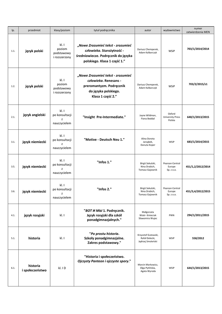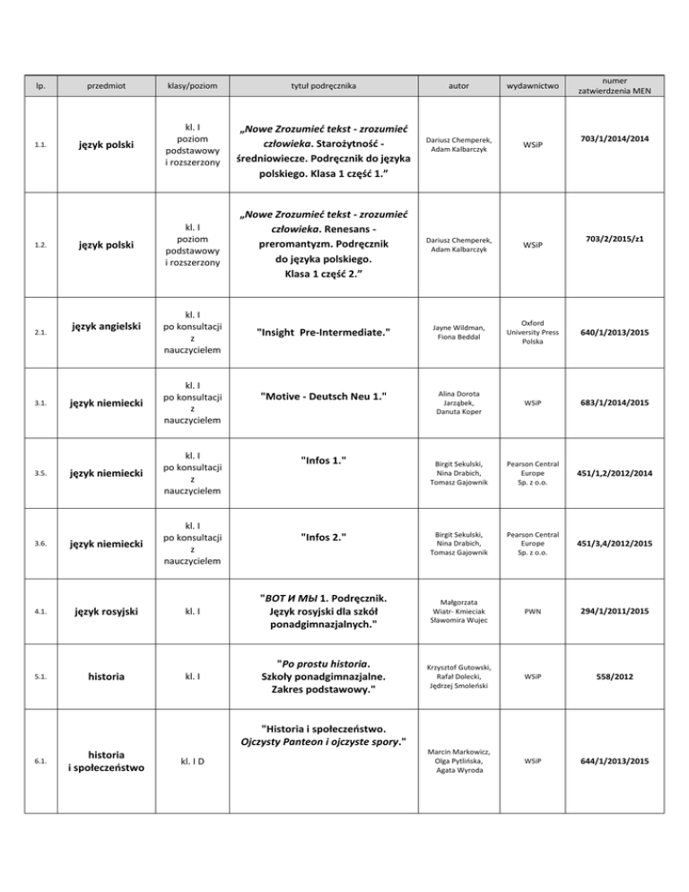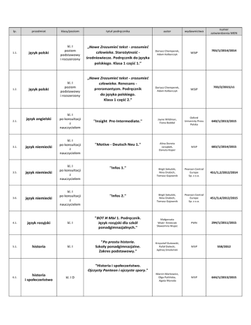 lp. 1.1. 1.2. 2.1. przedmiot klasy/poziom tytuł podręcznika język polski kl. I poziom podstawowy i rozszerzony „Nowe Zrozumieć tekst - zrozumieć człowieka. Starożytność średniowiecze. Podręcznik do języka polskiego. Klasa 1 część 1.” język polski kl. I poziom podstawowy i rozszerzony kl. I po konsultacji z nauczycielem język angielski numer zatwierdzenia MEN autor wydawnictwo Dariusz Chemperek, Adam Kalbarczyk WSiP „Nowe Zrozumieć tekst - zrozumieć człowieka. Renesans preromantyzm. Podręcznik do języka polskiego. Klasa 1 część 2.” Dariusz Chemperek, Adam Kalbarczyk WSiP "Insight Pre-Intermediate." Jayne Wildman, Fiona Beddal Oxford University Press Polska 640/1/2013/2015 "Motive - Deutsch Neu 1." Alina Dorota Jarząbek, Danuta Koper WSiP 683/1/2014/2015 Birgit Sekulski, Nina Drabich, Tomasz Gajownik Pearson Central Europe Sp. z o.o. 451/1,2/2012/2014 Birgit Sekulski, Nina Drabich, Tomasz Gajownik Pearson Central Europe Sp. z o.o. 451/3,4/2012/2015 703/1/2014/2014 703/2/2015/z1 język niemiecki kl. I po konsultacji z nauczycielem język niemiecki kl. I po konsultacji z nauczycielem 3.6. język niemiecki kl. I po konsultacji z nauczycielem 4.1. język rosyjski kl. I "ΒΟΤ И МЫ 1. Podręcznik. Język rosyjski dla szkół ponadgimnazjalnych." Małgorzata Wiatr- Kmieciak Sławomira Wujec PWN 294/1/2011/2015 5.1. historia kl. I "Po prostu historia. Szkoły ponadgimnazjalne. Zakres podstawowy." Krzysztof Gutowski, Rafał Dolecki, Jędrzej Smoleński WSiP 558/2012 Marcin Markowicz, Olga Pytlińska, Agata Wyroda WSiP 644/1/2013/2015 3.1. 3.5. "Infos 1." "Infos 2." "Historia i społeczeństwo. Ojczysty Panteon i ojczyste spory." 6.1. historia i społeczeństwo kl. I D 7.1. wiedza o społeczeństwie kl. I zakres podstawowy "W centrum uwagi. Podręcznik do wiedzy o społeczeństwie dla szkół ponadgimnazjalnych. Zakres podstawowy." Arkadiusz Janicki Nowa Era 505/2012/2015 kl. I "Spotkania z kulturą. Podręcznik do wiedzy o kulturze dla liceum i technikum." Monika Bokiniec, Barbara Forysiewicz, Jacek Michałowski, Natalia MrozkowiakNastrożna, Grzegorz Nazaruk, Magdalena Sacha, Grażyna Świętochowska Nowa Era 449/2012 Wydawnictwo RUBIKON 663/2013/2015 8. wiedza o kulturze 9. wychowanie do życia w rodzinie kl. I "Wędrując ku dorosłości. Wychowanie do życia w rodzinie dla uczniów szkół ponadgimnazjalnych." 10.1. matematyka kl. I zakres podstawowy "MATeMAtyka 1. Podręcznik dla szkół ponadgimnazjalnych. Zakres podstawowy. Wojciech Babiański, Lech Chańko, Dorota Ponczek Nowa Era 378/1/2011/2015 10.4. matematyka kl. I zakres rozszerzony "MATeMAtyka 1.Podręcznik dla szkół ponadgimnazjalnych. Zakres podstawowy i rozszerzony." Wojciech Babiański Lech Chańko Dorota Ponczek Nowa Era 360/1/2011/2015 11.1. fizyka kl. I A zakres podstawowy "Odkryć fizykę. Podręcznik dla szkół ponadgimnazjalnych. Kształcenie ogólne w zakresie podstawowym." Marcin Braun, Weronika Śliwa Nowa Era 447/2012/2015 11.2. fizyka kl. I B, C, D, E zakres podstawowy "Świat fizyki. Podręcznik dla szkół ponadgimnazjalnych Zakres podstawowy." Maria Fiałkowska, Jerzy M. Kreiner, Marek Godlewski, Szymon Godlewski, Krzysztof Kozak, Jadwiga Mazur 12.1. chemia kl. I zakres podstawowy "Chemia. Po prostu. Podręcznik dla szkół ponadgimnazjalnych. Zakres podstawowy." Hanna Gulińska, Krzysztof Kuśmiarczyk WSiP 523/2012/2015 13.1. biologia kl. I zakres podstawowy "Biologia na czasie. Podręcznik dla szkół ponadgimnazjalnych. Zakres podstawowy." Emilia Bonar, Weronika Krzeszowiec-Jeleń, Stanisław Czachorowski Nowa Era 450/2012/2015 14.1. geografia kl. I zakres podstawowy "Oblicza geografii. Podręcznik dla szkół ponadgimnazjalnych. Zakres podstawowy." Radosław Uliszak, Krzysztof Wiedermann Nowa Era 433/2012/2014 pod redakcją T. Króla, M. Rysia WSiP 394/2011/2015 podstawy przedsiębiorczości kl. I 16. informatyka kl. I zakres podstawowy 17. edukacja dla bezpieczeństwa 18.1. 19. 15. "Przedsiębiorczość na czasie. Podręcznik. Zakres podstawowy." Katarzyna Garbacik, Magdalena Żmiejko Nowa Era 427/2012 Grażyna Koba MIGRA 536/e/2015 kl. I "Edukacja dla bezpieczeństwa. Po prostu. Podręcznik dla szkół ponadgimnazjalnych. Zakres podstawowy." Bogusława Breitkopf, Mariusz Cieśla WSiP 500/2012/2015 religia kl. I "W blasku Bożej prawdy." ks. T. Śmiech, E. Kondrak, B. Nosek Wydawnictwo Jedność, Kielce AZ-41-03/12-KL-1/12 etyka kl. I, II, III "Etyka. Podręcznik dla szkół ponadgimnazjalnych." Paweł Kołoldziński, Jakub Kapiszewski OPERON Sp. z o.o. 408/2011 "Informatyka dla szkół ponadgimnazjalnych. Zakres podstawowy."