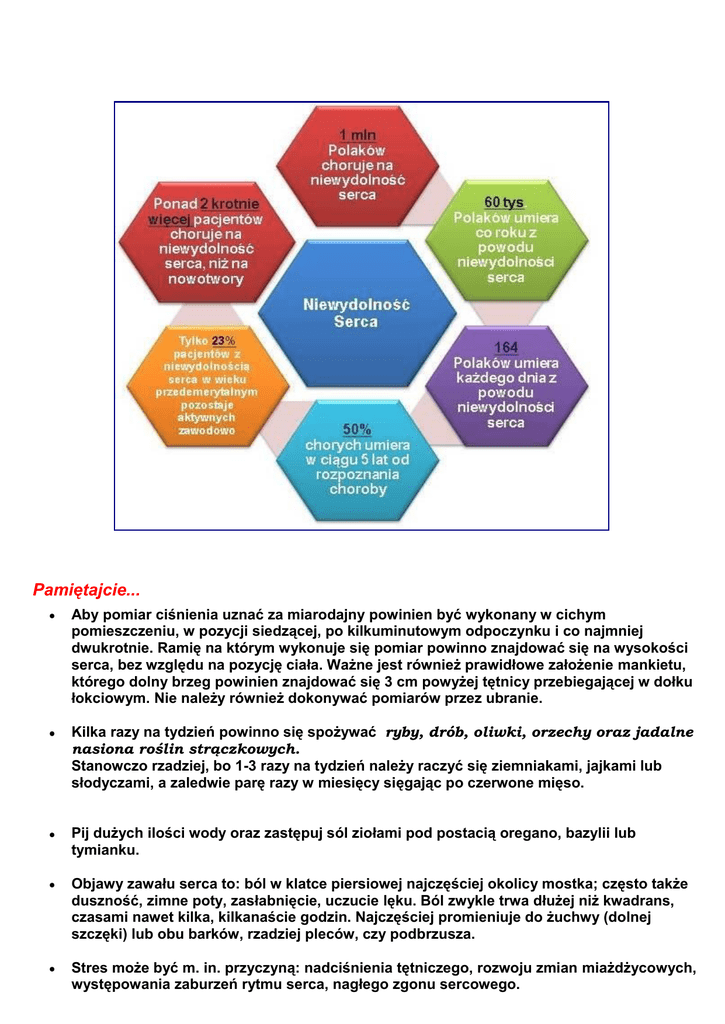 Pamiętajcie... Aby pomiar ciśnienia uznać za miarodajny powinien być wykonany w cichym pomieszczeniu, w pozycji siedzącej, po kilkuminutowym odpoczynku i co najmniej dwukrotnie. Ramię na którym wykonuje się pomiar powinno znajdować się na wysokości serca, bez względu na pozycję ciała. Ważne jest również prawidłowe założenie mankietu, którego dolny brzeg powinien znajdować się 3 cm powyżej tętnicy przebiegającej w dołku łokciowym. Nie należy również dokonywać pomiarów przez ubranie. Kilka razy na tydzień powinno się spożywać ryby, drób, oliwki, orzechy oraz jadalne nasiona roślin strączkowych. Stanowczo rzadziej, bo 1-3 razy na tydzień należy raczyć się ziemniakami, jajkami lub słodyczami, a zaledwie parę razy w miesięcy sięgając po czerwone mięso. Pij dużych ilości wody oraz zastępuj sól ziołami pod postacią oregano, bazylii lub tymianku. Objawy zawału serca to: ból w klatce piersiowej najczęściej okolicy mostka; często także duszność, zimne poty, zasłabnięcie, uczucie lęku. Ból zwykle trwa dłużej niż kwadrans, czasami nawet kilka, kilkanaście godzin. Najczęściej promieniuje do żuchwy (dolnej szczęki) lub obu barków, rzadziej pleców, czy podbrzusza. Stres może być m. in. przyczyną: nadciśnienia tętniczego, rozwoju zmian miażdżycowych, występowania zaburzeń rytmu serca, nagłego zgonu sercowego. Niezdiagnozowana cukrzyca, a co za tym idzie nieleczona często towarzyszy osobom cierpiącym na choroby wieńcowe lub tym, którzy przeżyli zawał serca. Nikotynizm jest przyczyną ok. 85% przypadków raka płuc w Stanach Zjednoczonych, ale palenie powoduje także inne nowotwory. Szacuje się, że palenie papierosów oraz żucie tabaki przyczyniają się do 60% przypadków raka gardła, jamy ustnej i przełyku. A Ok. 30% wszystkich nowotworów okolicy szyi jest powiązana z nikotyną. Osoby cierpiące na chorobę nadciśnieniową powinny wystrzegać się niektórych dyscyplin sportowych. Nie zalecane jest uprawianie wszelkich dyscyplin sportu, które są związane z wykonywaniem wielu rytmicznych, powtarzalnych ruchów z dużym obciążeniem (np. wioślarstwo, sprint). Należy również unikać sportów górskich, jak np. wspinaczka, narciarstwo zjazdowe. Panujące w górach warunki atmosferyczne (rozrzedzone powietrze, niskie temperatury zimą) podnoszą ciśnienie krwi. Najlepszym parametrem pozwalającym na stwierdzenie, czy ktoś ma nadwagę, czy nie, jest tzw. wskaźnik masy ciała (ang. Body mass index -BMI). Każdy może sobie wyliczyć ten wskaźnik. Norma jego wynosi 20-25 kg/m2. Własną masę ciała należy podzielić przez wzrost wyrażony w metrach i podniesiony do kwadratu. Umiarkowana aktywność fizyczna to każda czynność, która pochłania tyle energii, co chód o dystansie 3 km w ciągu 30 minut. Staraj się przeznaczyć na umiarkowany wysiłek fizyczny 30 minut (dorośli) lub 60 minut (dzieci) przez większość dni w tygodniu, najlepiej codziennie. Te 30 minut to absolutne minimum. Pamiętaj jednak, ze im więcej czasu poświęcasz na ruch tym lepszy wynik osiągniesz. Badając poziom cholesterolu dowiesz się w jakim stopniu zagraża Ci prawdopodobieństwo zawału serca, czy udaru mózgu. Gdy zawartość cholesterolu we krwi wynosi mniej niż 200 mg w 100 ml. -nie musisz specjalnie korygować swojej diety . 200 - 240 mg w 100 ml. -to podwyższony wynik. Potrzebne są zmiany w diecie aby oddalić ryzyko zawału. U ludzi z wynikiem ponad 240 mg w 100 ml.- już od zaraz należy zmienić sposób żywienia. Żródło Internet: http://www.dzienserca.com.pl/463-pamietajcie---