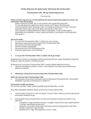 Ulotka dołączona do opakowania: informacja dla użytkownika Clotrimazolum GSK, 100 mg, tabletki dopochwowe Clotrimazolum Należy uważnie zapoznać się z treścią ulotki przed zastosowaniem leku, ponieważ zawiera ona informacje ważne dla pacjenta. Należy zachować tę ulotkę, aby w razie potrzeby móc ją ponownie przeczytać. W razie jakichkolwiek wątpliwości należy zwrócić się do lekarza lub farmaceuty. Lek ten przepisano ściśle określonej osobie. Nie należy go przekazywać innym. Lek może zaszkodzić innej osobie, nawet jeśli objawy jej choroby są takie same. Jeśli u pacjenta wystąpią jakiekolwiek objawy niepożądane, w tym wszelkie objawy niepożądane niewymienione w ulotce, należy powiedzieć o tym lekarzowi lub farmaceucie. Patrz punkt 4. Spis treści ulotki 1. Co to jest lek Clotrimazolum GSK i w jakim celu się go stosuje 2. Informacje ważne przed zastosowaniem leku Clotrimazolum GSK 3. Jak stosować lek Clotrimazolum GSK 4. Możliwe działania niepożądane 5. Jak przechowywać lek Clotrimazolum GSK 6. Zawartość opakowania i inne informacje 1. Co to jest lek Clotrimazolum GSK i w jakim celu się go stosuje Klotrymazol jest miejscowo działającym lekiem przeciwgrzybiczym z grupy pochodnych imidazolu. Działa na większość grzybów chorobotwórczych. Wskazaniem do stosowania Clotrimazolum GSK w postaci tabletek dopochwowych są: zakażenia drożdżakowe pochwy i sromu, w tym zakażenia wywołane przez drobnoustroje oporne na nystatynę. 2. Informacje ważne przed zastosowaniem leku Clotrimazolum GSK Kiedy nie stosować leku Clotrimazolum GSK Jeśli pacjentka ma uczulenie (nadwrażliwość) na klotrymazol lub którykolwiek z pozostałych składników tego leku (wymienionych w punkcie 6). Ostrzeżenia i środki ostrożności Nie stosować doustnie. Należy unikać przypadkowego kontaktu leku z oczami. Wszystkie potencjalnie zakażone obszary powinny być leczone jednocześnie. Leku nie należy stosować w czasie miesiączki. Leczenie należy zakończyć przed rozpoczęciem krwawienia miesiączkowego. Jeśli pacjentki dotyczy którekolwiek z poniższych stwierdzeń, powinna powiedzieć o tym lekarzowi: u pacjentki w ciągu ostatnich 6 miesięcy wystąpiły więcej niż dwa stany zapalne pochwy wywołane zakażeniami grzybiczymi, pacjentka w przeszłości chorowała na choroby przenoszone drogą płciową lub miała kontakt z partnerem z taką chorobą, pacjentka jest w ciąży lub przypuszcza, że jest w ciąży, 1 - pacjentka jest w wieku poniżej 12 lub powyżej 60 lat, u pacjentki stwierdzono nadwrażliwość (uczulenie) na imidazol lub inne leki przeciwgrzybicze stosowane dopochwowo. Lekarz oceni, czy można pacjentce zalecić stosowanie tabletek dopochwowych Clotrimazolum GSK. Należy przerwać leczenie i zgłosić się do lekarza, jeśli podczas stosowania leku wystąpią: nieregularne krwawienia z pochwy, nieprawidłowe krwawienia z pochwy lub plamienie międzymiesiączkowe, wydzielina z pochwy o przykrym zapachu, owrzodzenie pochwy lub sromu, pęcherzyki lub rany, bóle w podbrzuszu lub trudności w oddawaniu moczu, zaczerwienienie, podrażnienie lub obrzęk pojawiające się w miejscu podania leku, gorączka powyżej 38°C lub dreszcze, nudności lub wymioty, biegunka, bóle pleców, bóle barków. Lek Clotrimazolum GSK a inne leki Należy powiedzieć lekarzowi lub farmaceucie o wszystkich lekach stosowanych przez pacjenta obecnie lub ostatnio, a także o lekach, które pacjent planuje przyjmować. Klotrymazol stosowany miejscowo na błony śluzowe zewnętrznych narządów płciowych może uszkadzać mechaniczne środki antykoncepcyjne wykonane z lateksu (prezerwatywy i krążki domaciczne), a tym samym osłabiać ich skuteczność. Dlatego w czasie leczenia klotrymazolem i przez co najmniej 5 dni po jego zakończeniu, należy stosować inne środki antykoncepcyjne. Należy skontaktować się z lekarzem w celu wyboru innej metody zapobiegania ciąży. Klotrymazol stosowany dopochwowo jednocześnie z takrolimusem lub syrolimusem podawanym doustnie (leki stosowane po przeszczepieniu narządu) może powodować zwiększenie stężenia takrolimusu lub syrolimusu w osoczu. Lekarz może zalecić badanie stężenia takrolimusu w osoczu krwi. Ciąża i karmienie piersią Jeśli pacjentka jest w ciąży lub karmi piersią, przypuszcza że może być w ciąży lub gdy planuje mieć dziecko, powinna poradzić się lekarza lub farmaceuty przed zastosowaniem tego leku. Należy unikać stosowania leku Clotrimazolum GSK w pierwszym trymestrze ciąży. Należy zaprzestać karmienia piersią podczas leczenia lekiem Clotrimazolum GSK. Prowadzenie pojazdów i obsługiwanie maszyn Clotrimazolum GSK nie ma wpływu lub wywiera nieistotny wpływ na zdolność prowadzenia pojazdów i obsługiwania maszyn. 3. Jak stosować lek Clotrimazolum GSK Ten lek należy zawsze stosować zgodnie z zaleceniami lekarza. W razie wątpliwości należy zwrócić się do lekarza lub farmaceuty. Tabletki Clotrimazolum GSK stosuje się dopochwowo. Tabletkę należy wprowadzać głęboko do pochwy (najlepiej na noc). Zalecana dawka 2 Dorośli 2 razy po 1 tabletce przez 3 kolejne dni lub 1 tabletka na dobę przez 6 do 7 dni. Dzieci Nie stosować u dzieci w wieku poniżej 12 lat. Sposób podawania Leczenie należy zakończyć przed rozpoczęciem miesiączki, aby uniknąć wypłukania tabletki. W czasie leczenia nie należy używać tamponów, irygacji dopochwowych, środków plemnikobójczych ani innych produktów dopochwowych. Jeśli zakażenie obejmuje wargi sromowe i sąsiadujące okolice, lekarz może zalecić jednoczesne zastosowanie leku w postaci kremu. Podczas stosowania leku Clotrimazolum GSK należy powstrzymać się od współżycia seksualnego z uwagi na możliwość zakażenia partnera. Czas trwania leczenia Jeśli objawy nasilą się lub nie ustąpią po 7 dniach stosowania leku, należy ponownie zgłosić się do lekarza. Tabletki można zastosować powtórnie, jeśli zakaż