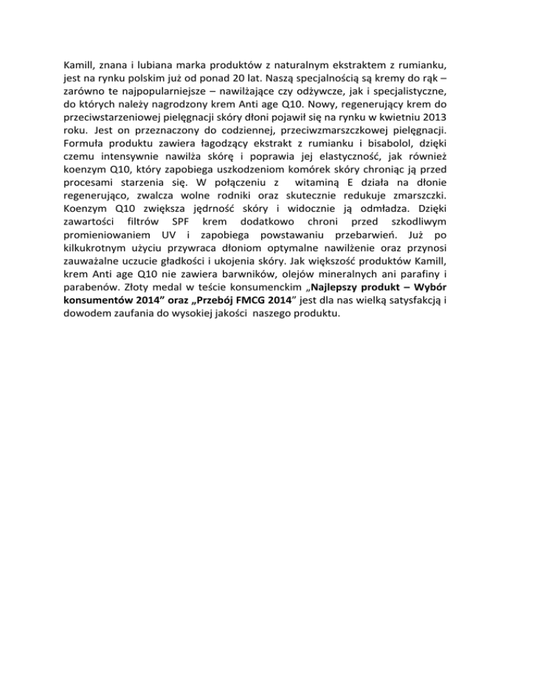 Kamill, znana i lubiana marka produktów z naturalnym ekstraktem z rumianku, jest na rynku polskim już od ponad 20 lat. Naszą specjalnością są kremy do rąk – zarówno te najpopularniejsze – nawilżające czy odżywcze, jak i specjalistyczne, do których należy nagrodzony krem Anti age Q10. Nowy, regenerujący krem do przeciwstarzeniowej pielęgnacji skóry dłoni pojawił się na rynku w kwietniu 2013 roku. Jest on przeznaczony do codziennej, przeciwzmarszczkowej pielęgnacji. Formuła produktu zawiera łagodzący ekstrakt z rumianku i bisabolol, dzięki czemu intensywnie nawilża skórę i poprawia jej elastyczność, jak również koenzym Q10, który zapobiega uszkodzeniom komórek skóry chroniąc ją przed procesami starzenia się. W połączeniu z witaminą E działa na dłonie regenerująco, zwalcza wolne rodniki oraz skutecznie redukuje zmarszczki. Koenzym Q10 zwiększa jędrność skóry i widocznie ją odmładza. Dzięki zawartości filtrów SPF krem dodatkowo chroni przed szkodliwym promieniowaniem UV i zapobiega powstawaniu przebarwień. Już po kilkukrotnym użyciu przywraca dłoniom optymalne nawilżenie oraz przynosi zauważalne uczucie gładkości i ukojenia skóry. Jak większość produktów Kamill, krem Anti age Q10 nie zawiera barwników, olejów mineralnych ani parafiny i parabenów. Złoty medal w teście konsumenckim „Najlepszy produkt – Wybór konsumentów 2014” oraz „Przebój FMCG 2014” jest dla nas wielką satysfakcją i dowodem zaufania do wysokiej jakości naszego produktu.