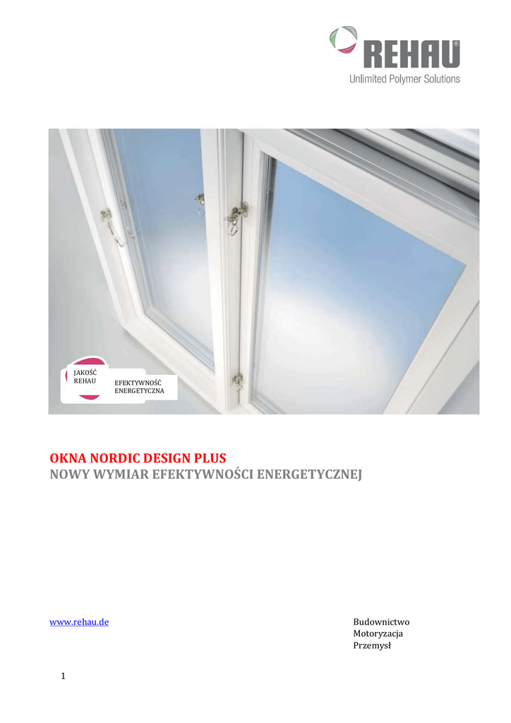 JAKOŚĆ REHAU EFEKTYWNOŚĆ ENERGETYCZNA OKNA NORDIC DESIGN PLUS NOWY WYMIAR EFEKTYWNOŚCI ENERGETYCZNEJ www.rehau.de 1 Budownictwo Motoryzacja Przemysł OKNA NORDIC DESIGN PLUS I HIGHTECH RAU-FIPRO® Okna produkowane z profili NORDIC DESIGN PLUS są jedynym w swoim rodzaju, innowacyjnym rozwiązaniem. Przekonają Państwa swoim technologicznym zaawansowaniem i dodatkowymi zaletami, które usuną w cień dotychczasowe systemy okienne. - świetna ochrona -Energetycznie efektywny przeciwwłamaniowa dla okien system otwieranych na otwieranych na zewnątrz zewnątrz okien przeznaczony zapewniana przez blokadę z jest przede wszystkim do bolcem grzybkowym/stabilne renowacji. Współczynnik Uf aż listwy zamykające. do 1,0 W/ m2K bez dodatkowych środków jak łączniki pianowe (z uszczelnieniem środkowym). - Tradycjonalna konstrukcja z wąskimi powierzchniami czołowymi, typowa dla okien wykonanych w duńskim/skandynawskim stylu. - Dopasowana głębokość pozwalająca na optymalną instalację pakietu trzy szybowego z wysoką izolacją termiczną, który pozwala na uzyskanie imponującego współczynnika Uw do 0,8 W/ m2. - Komfortowe otwieranie i zamykanie w zestawieniu z innymi systemami obecnymi na rynku. Zapewniają to najnowocześniejsze systemy uszczelniające i okuciowe oferujące funkcję wentylacji szczelinowej - Wykonane z materiału Hightech RAU-FIPRO 3 -poziomowe uszczelnienie Bolec grzybkowy z przekierowaniami narożnikowymi Listwa zamykająca przy wietrzeniu szczelinowym 2 Prowadnica 3 KOMFORT I OSZCZĘDNOŚĆ ENERGII NOWE KRYTERIA DŁUGOTRWAŁOŚCI Izolacja cieplna Pod względem oszczędności energii cieplnej, NORDIC DESIGN PLUS jest obecnie najlepszym na rynku systemem profili okiennych w kategorii systemów otwieranych na zewnątrz. Pozwala to na produkcję energetycznie efektywnych okien, które stworzą komfortowy klimat jakiego zawsze Państwo pragnęli. Ochrona zasobów Im efektywniejsza izolacja budynku, tym mniej energii zużytej na wyrównywanie temperatury w pomieszczeniu. Dzięki wyborowi energetycznie efektywnych okien dodatkowo chronią Państwo środowisko naturalne. NORDIC DESIGNPLUS gwarantuje jakość porównywalną do nowoczesnych systemów okien uchylnych i obrotowych otwieranych do wewnątrz: GENEO MD PLUS Współczynnik Ug = 1,0 W/m2K Współczynnik Uf = 0,91 W/m2K Współczynnik Uw = 1,1 W/m2K * NORDIC DESIGN PLUS Współczynnik Ug = 1,0 W/m2K Współczynnik Uf = 1,0 W/m2K Współczynnik Uw = 1,1 W/m2K * * Gabaryty okna 1230 x 1480 mm 4 Przed renowacją: stare drewniane okna. Jak widać okna te powodują wytracanie dużej ilości ciepła (na rysunku na czerwono). Po renowacji: Okna z profili NORDIC DESIGN PLUS minimalizują utratę energii cieplnej. 5 FUNKCJA, FORMA I KOLORY WYBÓR NALEŻY DO PAŃSTWA Drzwi wejściowe Otwierane do wewnątrz Okno sterowane bocznie typu Side Swing 180 Okno zawieszone typu Top Hinges Skrzydło może zostać odwrócone w sposób pozwalający na mycie od wewnątrz. Okno otwierane na zewnątrz i utrzymywane w pozycji przez okucia. Okno kołysane pionowo typu Top Swing 180 Drzwi balkonowe Skrzydło można obracać o 180o , co pozwala myć okna od wewnątrz Otwierane na zewnątrz Okno sterowane pionowo typu top sliding 6 Skrzydło wysuwane jest na dole, przy czym porusza się zarówno w kierunku do góry jak i w dół. Umożliwia to bardzo efektywne wietrzenie. Okno zawieszone bocznie typu Side Hinges Skrzydło obraca się na zewnątrz i utrzymywane jest w pozycji przez okucia. NOWE IMPULSY Z WYKORZYSTANIEM FORMY I FARBY Ukrywanie folii Duży wybór jednokolorowych barw i dekorów z drewna w gładkim i ziarnistym wykonaniu Otwarty na kreatywne pomysły System RAU-FIPRO posiada znakomite właściwości dotyczące formowania kształtu okien. Od teraz możesz cieszyć się oknami wykonanymi z zakrzywionych, wyginanych elementów z zachowaniem całkowicie uzbrojonych profili. 7 Daj się ponieść swojej kreatywności i pragnieniom. Lakierowanie Wybór farby na życzenie spośród 150 barw RAL HIGHTECH DLA PAŃSTWA OKIEN RAU-FIPRO® - MATERIAŁ DLA OKIEN PRZYSZŁOŚCI Nowość na rynku okien charakteryzujących się znakomitymi własnościami statycznymi. Kluczowe właściwości materiału spełniają wymagania w zakresie jakościi postanowienia kontrolne: RAL-GZ 716/1 Rozdział 1 i norma DIN EN 12608 dotyczące wyglądu i stanu po dostawie, wymiarów funkcjonalnych, odchylenia od prostych i wymiarów liniowych. 1. Bardzo stabilne RAU-FIPRO to nowoczesna technologia wykańczania z wykorzystaniem innowacyjnej receptury materiałowej. Najwyższa stabilność w rdzeniu profilu tworzy całkowicie nową jakość dla systemów profili okiennych. 2. Unikalny i innowacyjny system RAU-FIPRO jest rezultatem ponad 60 lat doświadczenia i rozwoju firmy REHAU oraz siły jej innowacyjności. Hightech, czyli materiał kompozytowy z włókna, który nadaje profilom absolutną stabilność, to całkowita nowość w branży. Nie licząc budowy samolotów i bolidów Formuły I, materiały kompozytowe z włókna znakomicie sprawdzają się przy budowie okien. 3. Okna najwyższej jakości Najlepszej jakości materiały wyjściowe oraz najwyższe standardy obróbki gwarantują znakomitą jakość i długowieczność profili z RAUFIPRO, także przy najwyższym narażeniu na niekorzystne warunki. 4.Recycling Profile z rdzeniem z RAUFIPRO w 100% nadają się do ponownego przetwarzania i są mu osobno poddawane. RAU-FIPRO – Nowoczesna technologia produkcji okien! 8 9 JAKOŚĆ W DOBREJ CENIE SKUTECZNA OCHRONA PRZECIW WARUNKOM ATMOSFERYCZNYM I WIATROWI 10 Obciążenia narożnikowe i uderzeniowe Test weryfikujący stabilność w ostatnim narożniku pokazuje zalety całkowitego uzbrojenia profili NORDIC DESIGN PLUS. Wodoszczelność Deszcz prostopadle uderzający w okna może być ekstremalnym obciążeniem. Także tutaj koncepcja całkowitego zbrojenia i wydajnej koncepcji uszczelniającej uzupełniają się perfekcyjnie. Dodatkowe urządzenia kontrolujące 