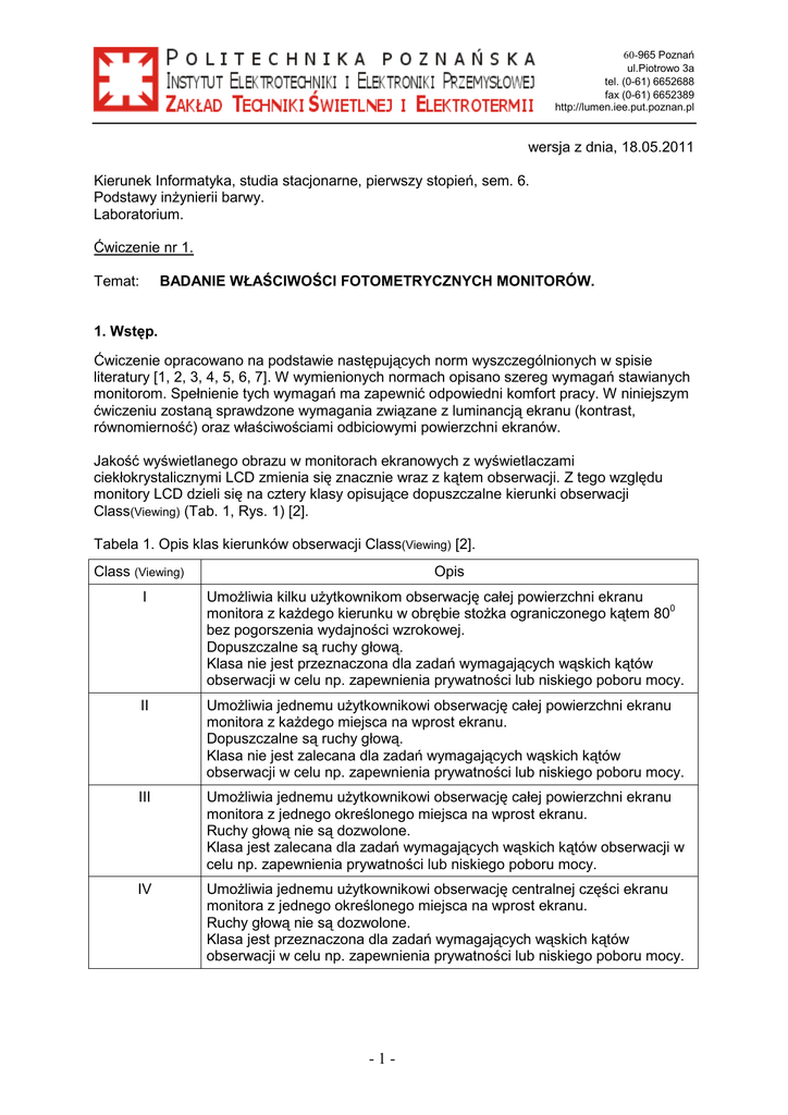 60-965 Poznań ul.Piotrowo 3a tel. (0-61) 6652688 fax (0-61) 6652389 http://lumen.iee.put.poznan.pl wersja z dnia, 18.05.2011 Kierunek Informatyka, studia stacjonarne, pierwszy stopień, sem. 6. Podstawy inŜynierii barwy. Laboratorium. Ćwiczenie nr 1. Temat: BADANIE WŁAŚCIWOŚCI FOTOMETRYCZNYCH MONITORÓW. 1. Wstęp. Ćwiczenie opracowano na podstawie następujących norm wyszczególnionych w spisie literatury [1, 2, 3, 4, 5, 6, 7]. W wymienionych normach opisano szereg wymagań stawianych monitorom. Spełnienie tych wymagań ma zapewnić odpowiedni komfort pracy. W niniejszym ćwiczeniu zostaną sprawdzone wymagania związane z luminancją ekranu (kontrast, równomierność) oraz właściwościami odbiciowymi powierzchni ekranów. Jakość wyświetlanego obrazu w monitorach ekranowych z wyświetlaczami ciekłokrystalicznymi LCD zmienia się znacznie wraz z kątem obserwacji. Z tego względu monitory LCD dzieli się na cztery klasy opisujące dopuszczalne kierunki obserwacji Class(Viewing) (Tab. 1, Rys. 1) [2]. Tabela 1. Opis klas kierunków obserwacji Class(Viewing) [2]. Class (Viewing) Opis I UmoŜliwia kilku uŜytkownikom obserwację całej powierzchni ekranu monitora z kaŜdego kierunku w obrębie stoŜka ograniczonego kątem 800 bez pogorszenia wydajności wzrokowej. Dopuszczalne są ruchy głową. Klasa nie jest przeznaczona dla zadań wymagających wąskich kątów obserwacji w celu np. zapewnienia prywatności lub niskiego poboru mocy. II UmoŜliwia jednemu uŜytkownikowi obserwację całej powierzchni ekranu monitora z kaŜdego miejsca na wprost ekranu. Dopuszczalne są ruchy głową. Klasa nie jest zalecana dla zadań wymagających wąskich kątów obserwacji w celu np. zapewnienia prywatności lub niskiego poboru mocy. III UmoŜliwia jednemu uŜytkownikowi obserwację całej powierzchni ekranu monitora z jednego określonego miejsca na wprost ekranu. Ruchy głową nie są dozwolone. Klasa jest zalecana dla zadań wymagających wąskich kątów obserwacji w celu np. zapewnienia prywatności lub niskiego poboru mocy. IV UmoŜliwia jednemu uŜytkownikowi obserwację centralnej części ekranu monitora z jednego określonego miejsca na wprost ekranu. Ruchy głową nie są dozwolone. Klasa jest przeznaczona dla zadań wymagających wąskich kątów obserwacji w celu np. zapewnienia prywatności lub niskiego poboru mocy. -1- 60-965 Poznań ul.Piotrowo 3a tel. (0-61) 6652688 fax (0-61) 6652389 http://lumen.iee.put.poznan.pl Rys. 1. Ilustracja klas kierunków obserwacji Class(Viewing). Strzałki oznaczają moŜliwe kierunki ruchu głową [2]. Monitory LCD mogą posiadać powierzchnię ekranu charakteryzującą się róŜnymi właściwościami odbiciowymi. Powierzchnia ekranu moŜe być matowa, gładka (tzw. „glare”), moŜe równieŜ mieć nałoŜone warstwy zmniejszające wartość współczynnika odbicia. Oświetlenie zewnętrzne stanowiska pracy z monitorem moŜe powodować szereg niekorzystnych zjawisk takich jak: - zmniejszenie kontrastu luminancji wyświetlanego obraz, - olśnienie, - obrazy obiektów odbijające się na powierzchni ekranu zmniejszają czytelność wyświetlanych obrazów. Odbicie Lambertowskie (rozproszone) występujące w przypadku matowych powierzchni monitorów zwiększa jaskrawość szczególnie ciemnych fragmentów wyświetlanych obrazów. Odbicie kierunkowe (ekrany „glare”) oprócz zmniejszenia kontrastu powoduje często konieczność zmiany odległości punktu obserwacji (akomodacja) ze względu na przenoszenie punktu obserwacji z powierzchni ekranu na powierzchnię obiektu, którego obraz odbija się na ekranie. Odbicie Lambertowskie (rozproszone) jest przez większość obserwatorów oceniane jako niej uciąŜliwe. Monitory LCD dzieli się na trzy klasy jakości ochrony przez niepoŜądanymi odbiciami Class(Reflection) (Tab. 2, Rys. 2) [2]. -2- 60-965 Poznań ul.Piotrowo 3a tel. (0-61) 6652688 fax (0-61) 6652389 http://lumen.iee.put.poznan.pl Tabela 2. Wartości luminancji odniesieniowych (REF) słuŜących do wyznaczania klas ochrony przed niepoŜądanymi odbiciami Class(Reflection) [2]. Class (Reflection) Wartość luminancji odniesieniowych (REF) [cd/m2] I Zarówno L REF EXT-I = 200 oraz L REF SML-I = 2000 II Albo L REF EXT-II = 200 albo L REF SML-II = 2000 Do większości lecz nie do wszystkich biur III Albo L REF EXT-III = 125 albo L REF SML-III = 200 Wymagają specjalnie dostosowanych warunków oświetlenia Przeznaczenie Do wszystkich biur EXT – źródło o duŜych rozmiarach do sprawdzenia odbicia kierunkowego SML – źródło o małych rozmiarach do sprawdzenia odbicia kierunkowego odbicie rozproszone odbicie kierunkowe (ekran typu „glare”) Rys. 2. Ilustracja zjawiska niepoŜądanego odbicia w ekranie monitora. NiepoŜądany obraz twarzy obserwatora (2) odbija się na ekranie monitora (1) [2]. Rys. 3. Rysunek układu pomiarowego uwzględniający połoŜenie miernika luminancji (2) oraz dwóch źródeł oświetlenia zewnętrznego (rozproszonego DIFF) (1 i 3) i źródła do sprawdzenia odbicia kierunkowego EXT i SML (5), płaszczyznę umieszczenia powierzchni ekranu oraz wzorca współczynnika odbicia dSTD oznaczono jako (4) [2]. -3- 60-965 Poznań ul.Piotrowo 3a tel. (0-61) 6652688 fax (0-61) 6652389 http://lumen.iee.put.poznan.pl Opis przyjętych oznaczeń: Wyświetlany obraz: HS (High State) – na ekranie wyświetlany jest jednolity obraz: R=G=B=100%. LS (Low State) – na ekranie wyświetlany jest jednolity obraz: R=G=B=0%. Punkty pomiarowe: CL (Central Location) – punkt na środku ekranu. HL (High Luminance) – punkt o największej wartości luminancji. LL (Low Luminance) – punkt o najmniejszej wartości luminancji. Kierunki i kąty: θ - kąt obserwacji. θ range – dopuszczalny zakres kątów obserwacji. θ lm – kąt połoŜenia miernika luminancji w stosunku do normalnej do powierzchni ekranu. θ sLg – kąt połoŜenia źródła światła o luminancji Lg do oceny składowej kierunkowej odbicia powierzchni ekra