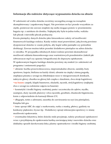 Informacje dla rodziców dotyczące wyposażenia dziecka na obozie W zależności od wieku dziecka zwróćmy szczególną uwagę na rozsądnie skompletowany i zapakowany bagaż. Nie powinien on być przede wszystkim za ciężki, ponieważ nie zawsze znajdzie się osoba mogąca pomóc w przeniesieniu bagażu np. z autokaru do domku. Najlepiej aby była to jedna torba, walizka lub plecak i niewielki plecak podręczny. Kwota pieniędzy danych dziecku jako kieszonkowe zależy od możliwości finansowych każdego rodzica. Każdy rodzic musi przewidzieć, jaką kwotą powinno dysponować dziecko w czasie pobytu, aby kupić sobie pamiątki czy potrzebne drobiazgi. Zawsze można także przesłać dodatkowe pieniądze na adres dziecka w ośrodku. W przypadku młodszych dzieci rodzice powinni skonsultować możliwość oddania kieszonkowego oraz wartościowych przedmiotów (takich jak odtwarzacze mp3 czy aparaty fotograficzne) do depozytu opiekunom. W spakowanym bagażu każdego dziecka powinny się znaleźć (w zależności od programu i zmienności pogody): • ubranie: kurtka przeciwdeszczowa, nieprzemakalne obuwie, sandały, buty sportowe, kapcie, bielizna na każdy dzień, ubranie na ciepłą i zimną pogodę, cieplejsza piżama z uwagi na chłodniejsze noce w nieogrzewanych domkach, nakrycie głowy chustka na głowę lub czapka z daszkiem, dwa stroje kąpielowe; •na basen: czepek, klapki basenowe, okularki, ręcznik, strój kąpielowy (najlepiej dwa z uwagi na codzienne zajęcia na basenie) • kosmetyki i środki higieny osobistej: pasta i szczoteczka do zębów, mydło, szampon, duży ręcznik plażowy i dwa ręczniki, grzebień, chusteczki higieniczne, krem z odpowiednim do karnacji filtrem UV; • długopis, notes z adresami, saszetka do zawieszania na szyi (na pieniądze), Książka lub gra. • inne: sprzęt ABC do zajęć z nurkowania, rurka z maską, płetwy; gadżety na konkursy piękności, fryzur itp. Dodatkowy sprzęt rekreacyjno-sportowy w miarę możliwości spakowania. • ewentualne lekarstwa, które dziecko stale przyjmuje, należy przekazać opiekunowi wraz z przyklejoną do opakowania kartką zawierającą imię i nazwisko dziecka oraz dokładny sposób dawkowania leku; plastry opatrunkowe i środki higieny osobistej.