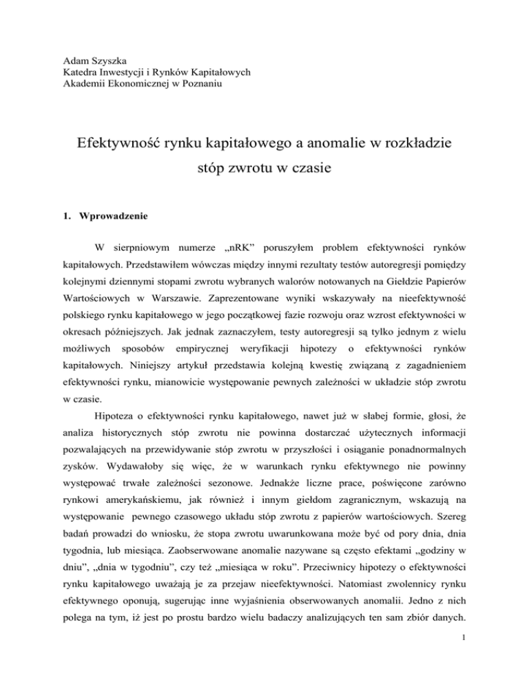 Adam Szyszka Katedra Inwestycji i Rynków Kapitałowych Akademii Ekonomicznej w Poznaniu Efektywność rynku kapitałowego a anomalie w rozkładzie stóp zwrotu w czasie 1. Wprowadzenie W sierpniowym numerze „nRK” poruszyłem problem efektywności rynków kapitałowych. Przedstawiłem wówczas między innymi rezultaty testów autoregresji pomiędzy kolejnymi dziennymi stopami zwrotu wybranych walorów notowanych na Giełdzie Papierów Wartościowych w Warszawie. Zaprezentowane wyniki wskazywały na nieefektywność polskiego rynku kapitałowego w jego początkowej fazie rozwoju oraz wzrost efektywności w okresach późniejszych. Jak jednak zaznaczyłem, testy autoregresji są tylko jednym z wielu możliwych sposobów empirycznej weryfikacji hipotezy o efektywności rynków kapitałowych. Niniejszy artykuł przedstawia kolejną kwestię związaną z zagadnieniem efektywności rynku, mianowicie występowanie pewnych zależności w układzie stóp zwrotu w czasie. Hipoteza o efektywności rynku kapitałowego, nawet już w słabej formie, głosi, że analiza historycznych stóp zwrotu nie powinna dostarczać użytecznych informacji pozwalających na przewidywanie stóp zwrotu w przyszłości i osiąganie ponadnormalnych zysków. Wydawałoby się więc, że w warunkach rynku efektywnego nie powinny występować trwałe zależności sezonowe. Jednakże liczne prace, poświęcone zarówno rynkowi amerykańskiemu, jak również i innym giełdom zagranicznym, wskazują na występowanie pewnego czasowego układu stóp zwrotu z papierów wartościowych. Szereg badań prowadzi do wniosku, że stopa zwrotu uwarunkowana może być od pory dnia, dnia tygodnia, lub miesiąca. Zaobserwowane anomalie nazywane są często efektami „godziny w dniu”, „dnia w tygodniu”, czy też „miesiąca w roku”. Przeciwnicy hipotezy o efektywności rynku kapitałowego uważają je za przejaw nieefektywności. Natomiast zwolennicy rynku efektywnego oponują, sugerując inne wyjaśnienia obserwowanych anomalii. Jedno z nich polega na tym, iż jest po prostu bardzo wielu badaczy analizujących ten sam zbiór danych. 1 Niektórzy z nich odkrywają wprawdzie określone zależności, jednak mają one charakter przypadkowy i niestały. Jeśli wyjaśnienie to jest słuszne, to badania dotyczące różnych rynków oraz uwzględniające odmienne przedziały czasowe nie powinny wskazywać na podobne zależności. Drugie proponowane wyjaśnienie sugeruje, iż obserwowane zależności mają związek ze strukturą rynku (np. systemem składania zleceń), a także z jego otoczeniem (np. z uregulowaniami podatkowymi). Jeszcze innym argumentem, nie tyle wyjaśniającym obserwowane anomalie, ile raczej mającym umniejszyć ich znaczenie, jest fakt, że w wielu przypadkach, po uwzględnieniu kosztów transakcyjnych, zaobserwowane różnice w stopach zwrotu nie są wystarczająco duże, by na ich podstawie stworzyć opłacalną w długim okresie strategię inwestowania. 2. Przegląd badań międzynarodowych nad anomaliami w czasowym rozkładzie stóp zwrotu 2.1. „Efekt miesiąca w roku” „Efekt miesiąca w roku”, zwany też „efektem stycznia” należy do jednej z najlepiej rozpoznanych anomalii sezonowego rozkładu stóp zwrotu. Liczne badania1 dotyczące rynku amerykańskiego prowadzą do wniosku, że stopy zwrotu w styczniu są przeciętnie znacznie wyższe aniżeli w innych miesiącach. Sprawdza się to w szczególności w odniesieniu do akcji firm o relatywnie małej kapitalizacji. Występowanie „efektu przełomu roku” (na ogół „stycznia”) zaobserwowano również w przypadku rynków kapitałowych w 16 innych krajach wysoko uprzemysłowionych2. W przypadku tych krajów nie zaobserwowano jednak aż tak istotnego związku pomiędzy sezonowością zwrotów a wielkością spółki, jak ma to miejsce dla rynku amerykańskiego. Najszerzej znanym wyjaśnieniem, jakie zaproponowano dla zjawiska występowania wysokich stóp zwrotu w styczniu, jest hipoteza wyprzedaży akcji podyktowanej względami podatkowymi (ang. tax-loss selling hypothesis). W myśl amerykańskiego prawa podatkowego 1 Obszerne informacje o „efekcie stycznia” w Stanach Zjednoczonych znaleźć można między innymi w następujących pracach: Fama E., „Efficient Capital Markets II”, Journal of Finance, No. 5., December 1991; Haugen R.A., Lakonishok J., The Incredible January Effect, Dow Jones-Irwin, Homewood, 1988; Lakonishok J., Smidt S., „Are Seasonal Anomalies Real? A Ninety-Year Perspective”, Review of Financial Studies, Winter 1988; Dimison E., Stock Market Anomalies, Cambridge University Press, Cambridge 1988. 2 Glutekin M.N., Glutekin N.B., „Stock Market Seasonality: International Evidence”, Journal of Financial Economics, 12, 1983. 2 podatek od dochodów kapitałowych naliczany jest w ten sposób, iż możliwe jest odpisanie straty poniesionej na akcjach jednych spółek od dochodów uzyskanych z akcji innych spółek. Dlatego też, pod koniec roku inwestorzy wyzbywają się akcji, które przyniosły im stratę. Presja podażowa wpływa na spadek cen w końcu grudnia. Z kolei na początku stycznia inwestorzy decydują się na odkupienie akcji. Tym razem impulsy popytowe sprawiają, że ceny szybko wzrastają, odzyskując swój poprzedni poziom. Okazuje się, że szczególna aktywność rynku przypada na pierwsze pięć sesji nowego roku, kiedy to obserwowane są najwyższe stopy zwrotu3. Hipoteza o wyprzedaży akcji w celach podatkowych może również służyć za częściowe wyjaśnienie, dlaczego efekt stycznia w większym stopniu dotyczy spółek o małej kapitalizacji. Reinganum4 wykazał bowiem, że akcje małych firm stanowią przeważający odsetek ogółu akcji sprzedawanych w celu rozliczenia strat. Ponadto presja podażowa w większym stopniu odbija się na cenach akcji małych firm, którymi normalnie handel nie jest zbytnio ożywiony. W swojej pracy Reinganum zastrzega jednak również, że tax-loss selling h